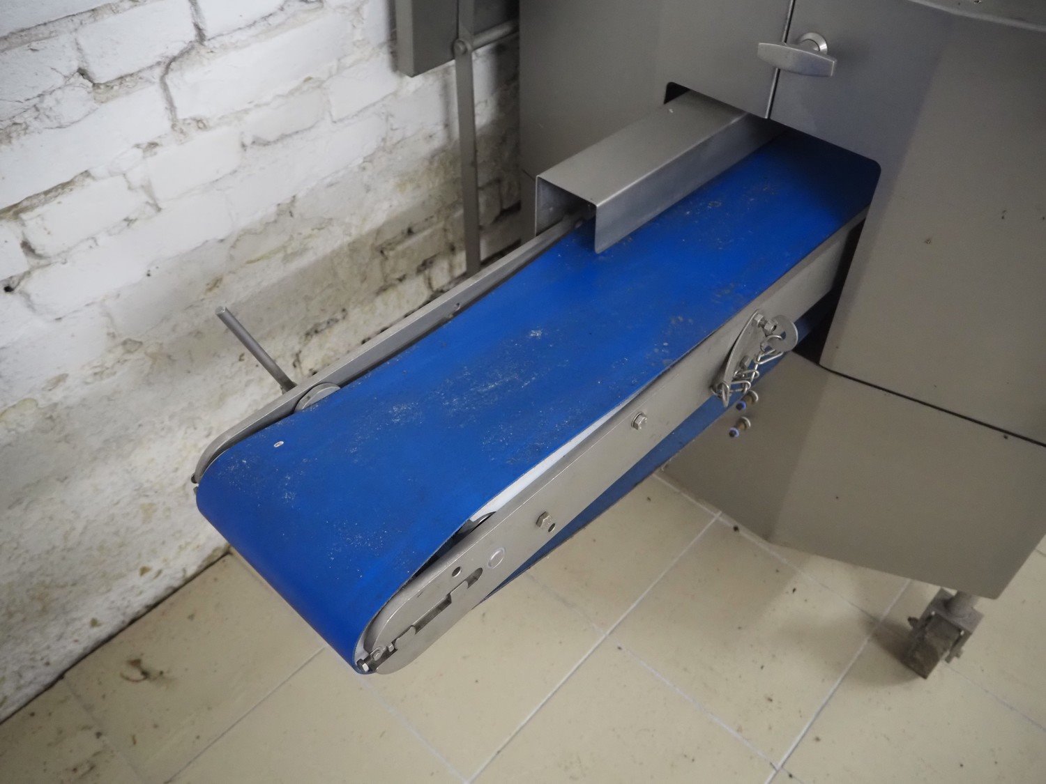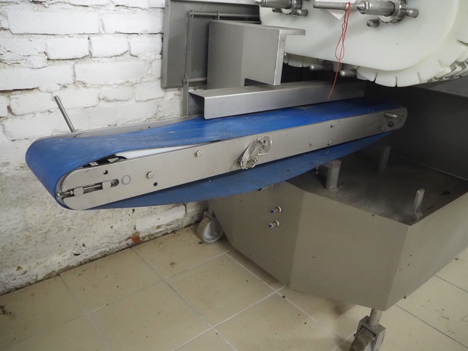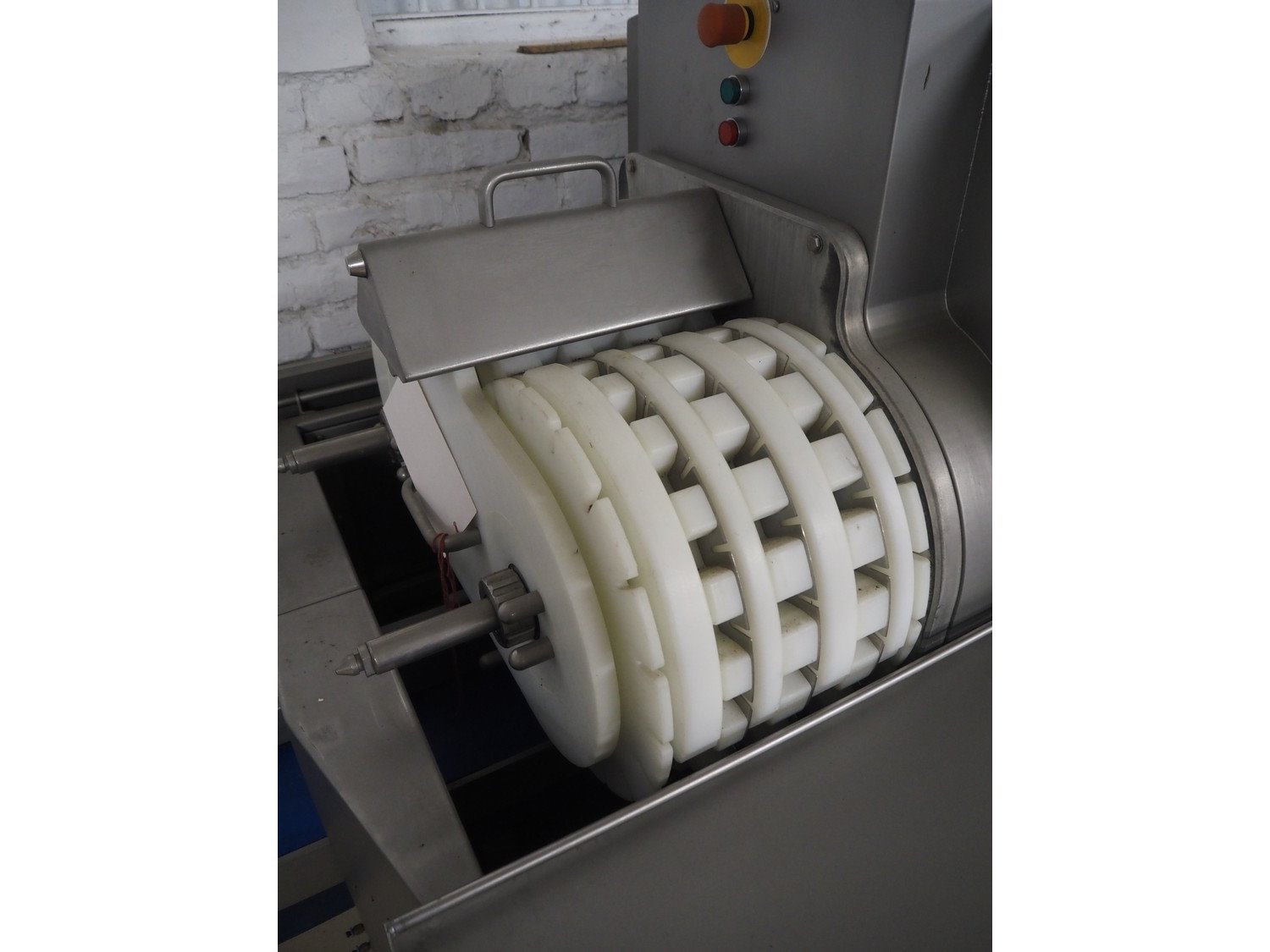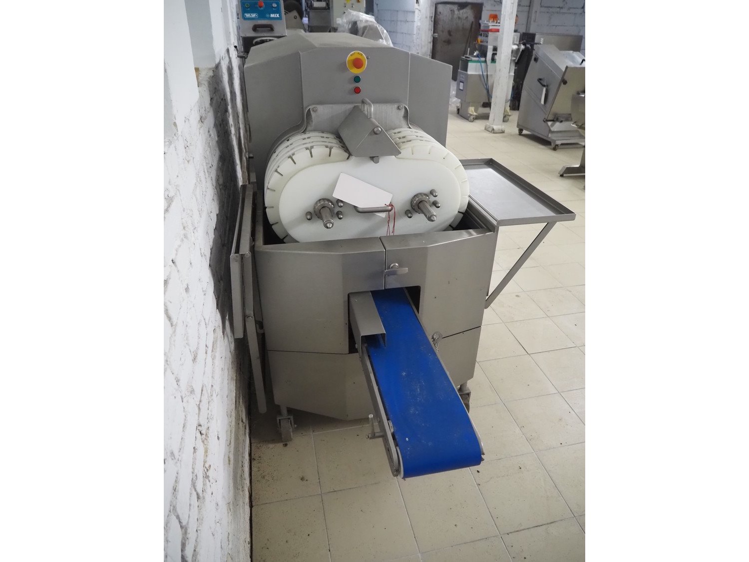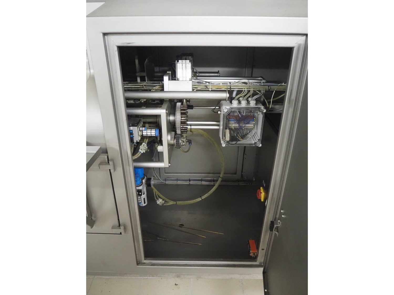 Marel TVM mobile skewering machine, type: Spiedo 1200, serial number: 08620-00014, year of construction: 2004, 400/200 V, 2/3 Ph, 50/60 Hz, 0.5 kW, 9/6 bar, weight: 500 kg, plastic outfeed belt, belt width: 200 mm, total dimensions: 2500 mm x 1430 mm x 1500 mm. Including box with extra parts and an trolley with extra forms, dimensions trolley: 620 mm x 840 mm x 1750 mm.
