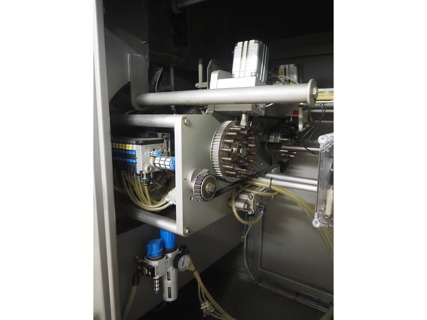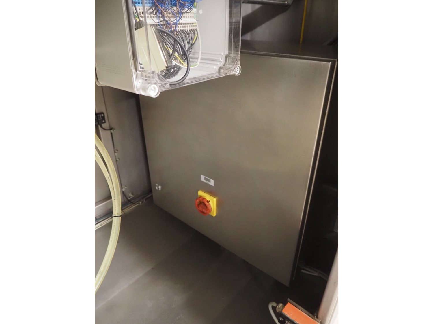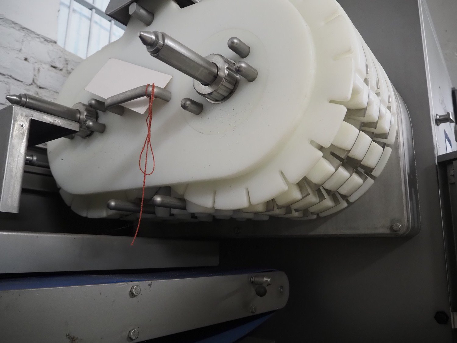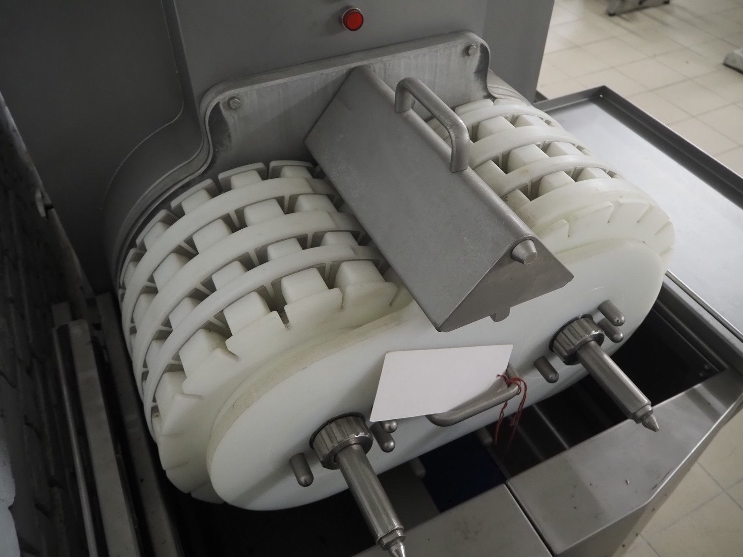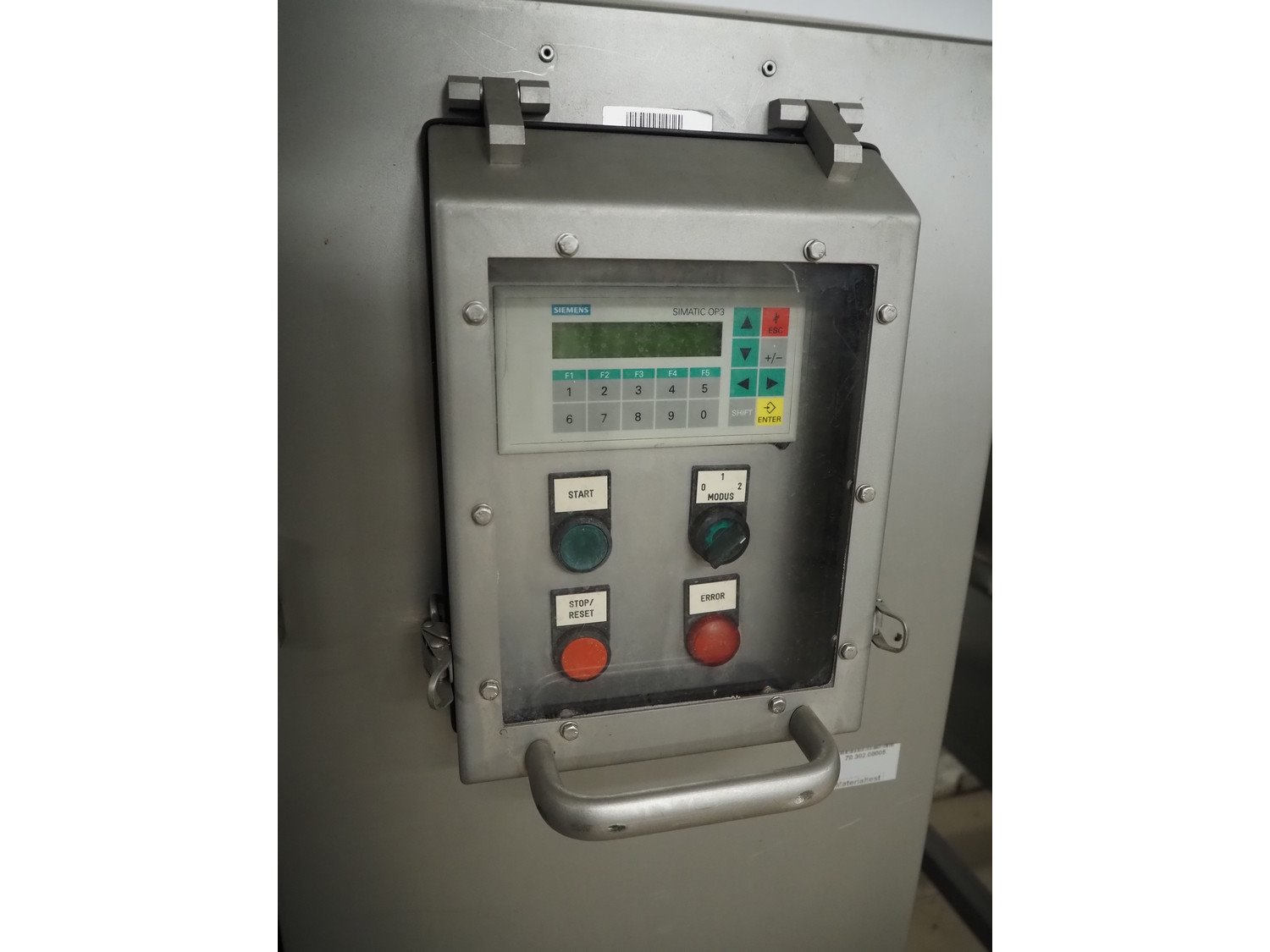 Marel TVM mobile skewering machine, type: Spiedo 1200, serial number: 08620-00014, year of construction: 2004, 400/200 V, 2/3 Ph, 50/60 Hz, 0.5 kW, 9/6 bar, weight: 500 kg, plastic outfeed belt, belt width: 200 mm, total dimensions: 2500 mm x 1430 mm x 1500 mm. Including box with extra parts and an trolley with extra forms, dimensions trolley: 620 mm x 840 mm x 1750 mm.