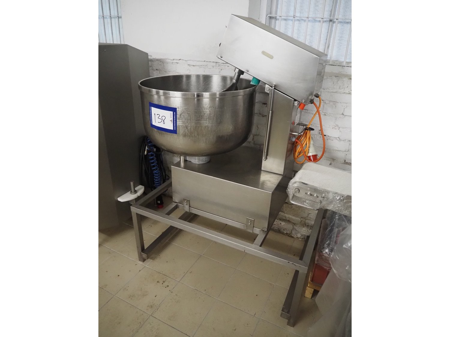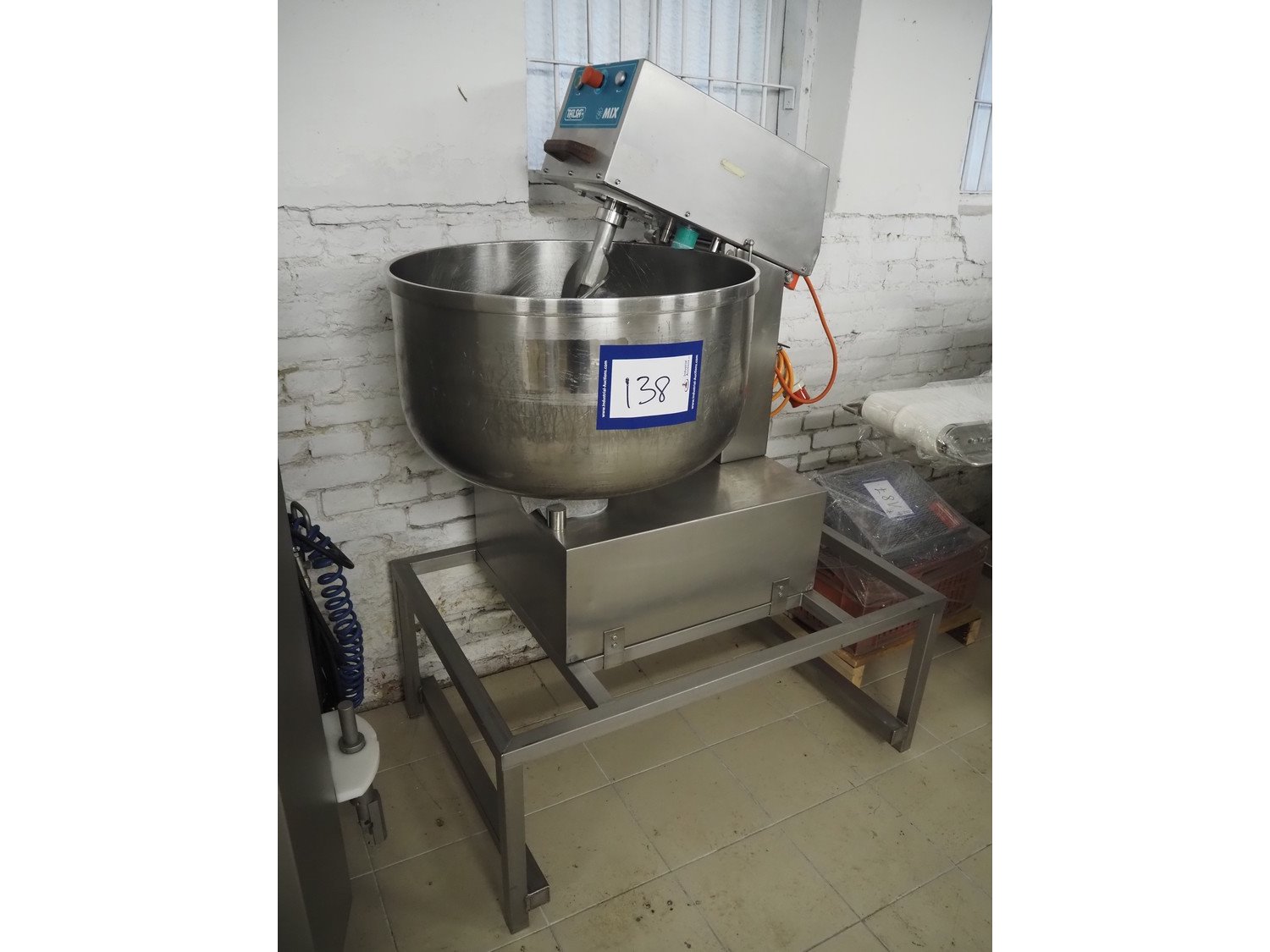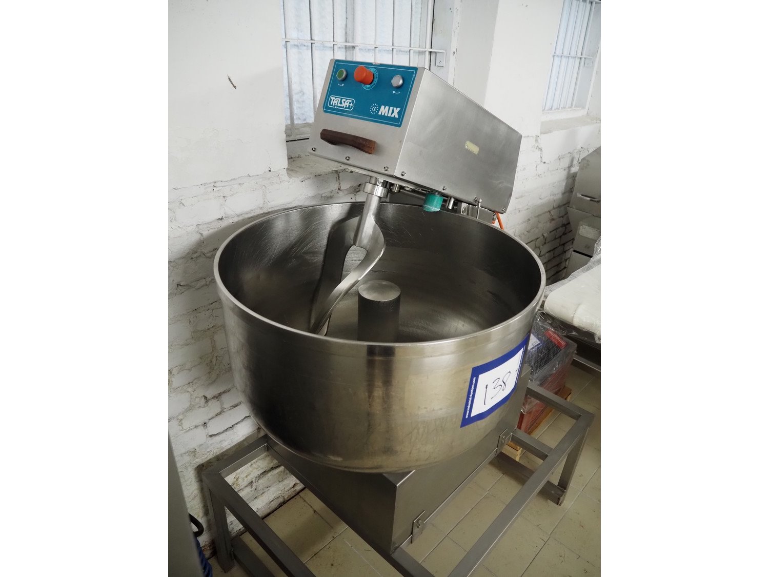 Talsa bowl mixer on s/s frame, type: MIX150P, serial number: 209557, year of construction: 2000, 400 V, 3 Ph, 50 Hz, volume: 150 liter, total dimensions: 1200 mm x 800 mm x 1700 mm.