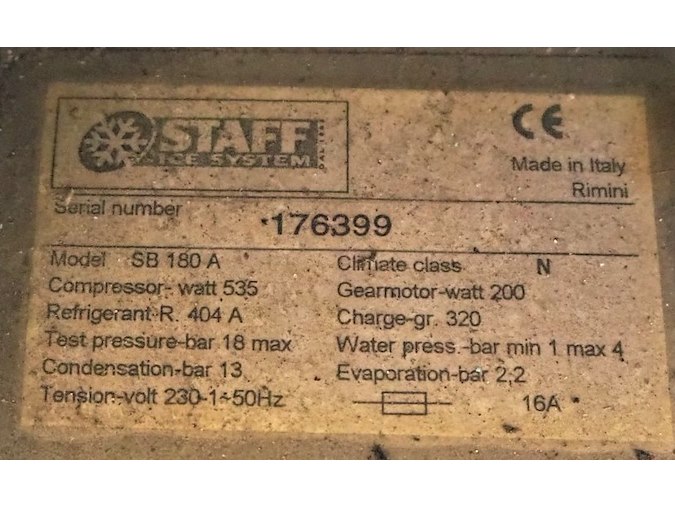 Staff Ice System ice cube machine, model: SB 180 A, serial number: 176399, 230 V, 1 Ph, 50 Hz, 16 A, 200/535 W, refrigerant: R 404A, volume: 320 gr, inside dimensions bunker: 700 mm x 670 mm x 400 mm, total dimensions: 760 mm x 760 mm x 900 mm.