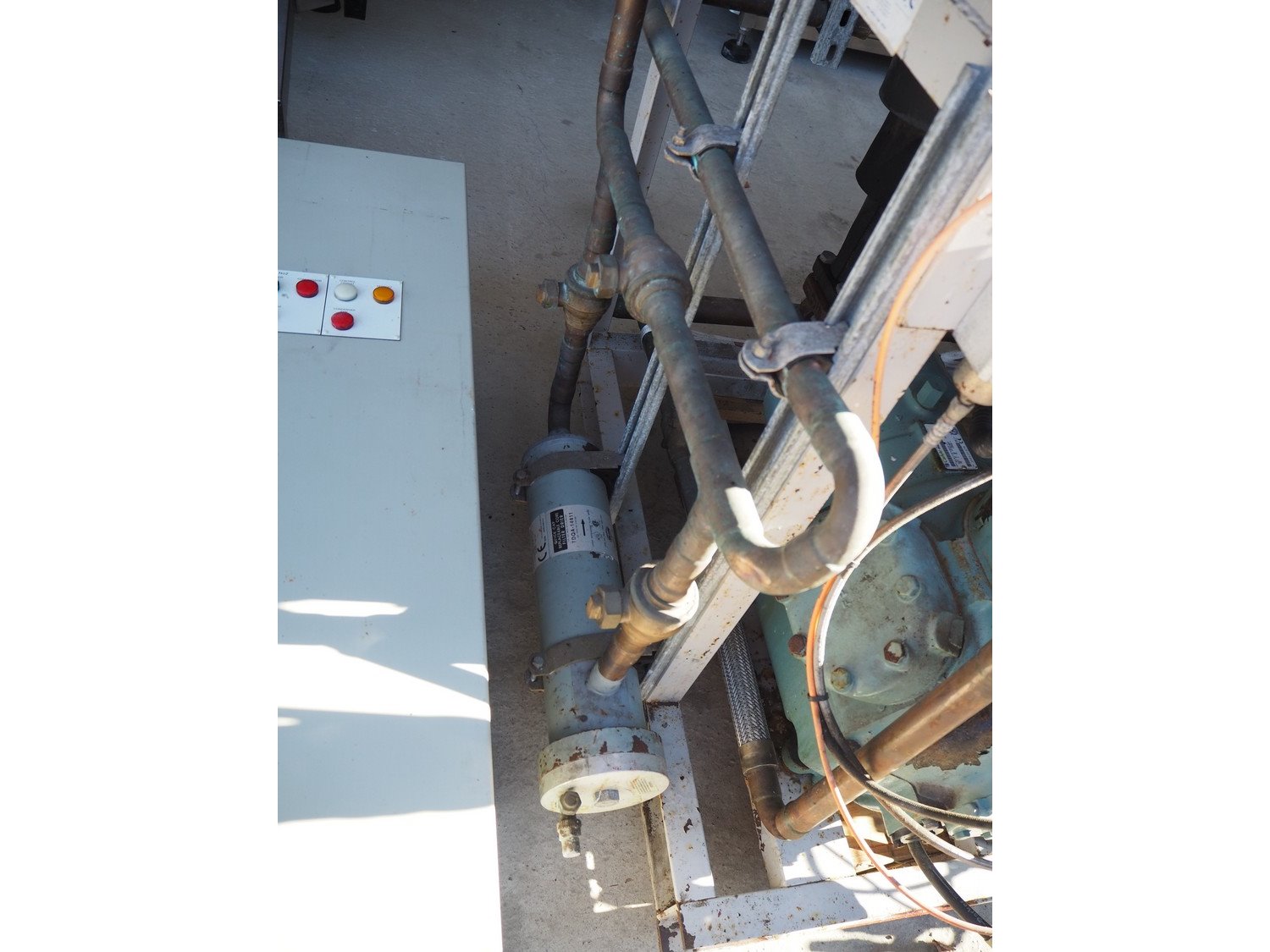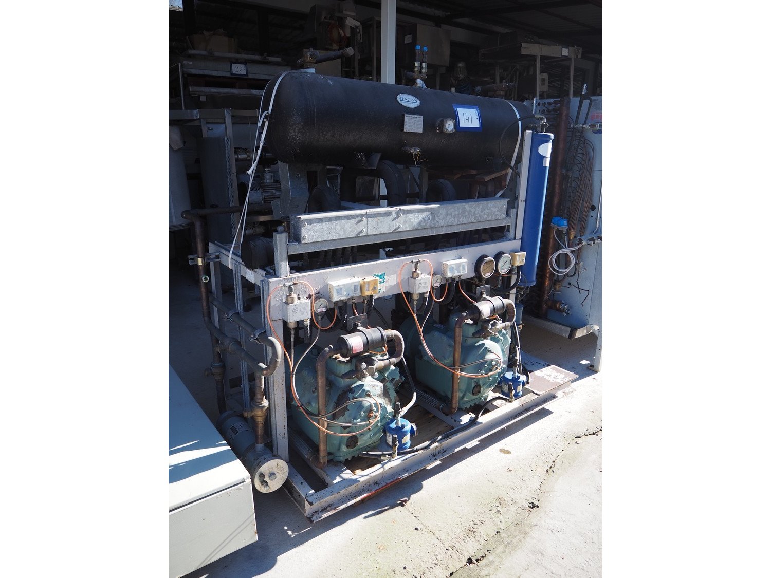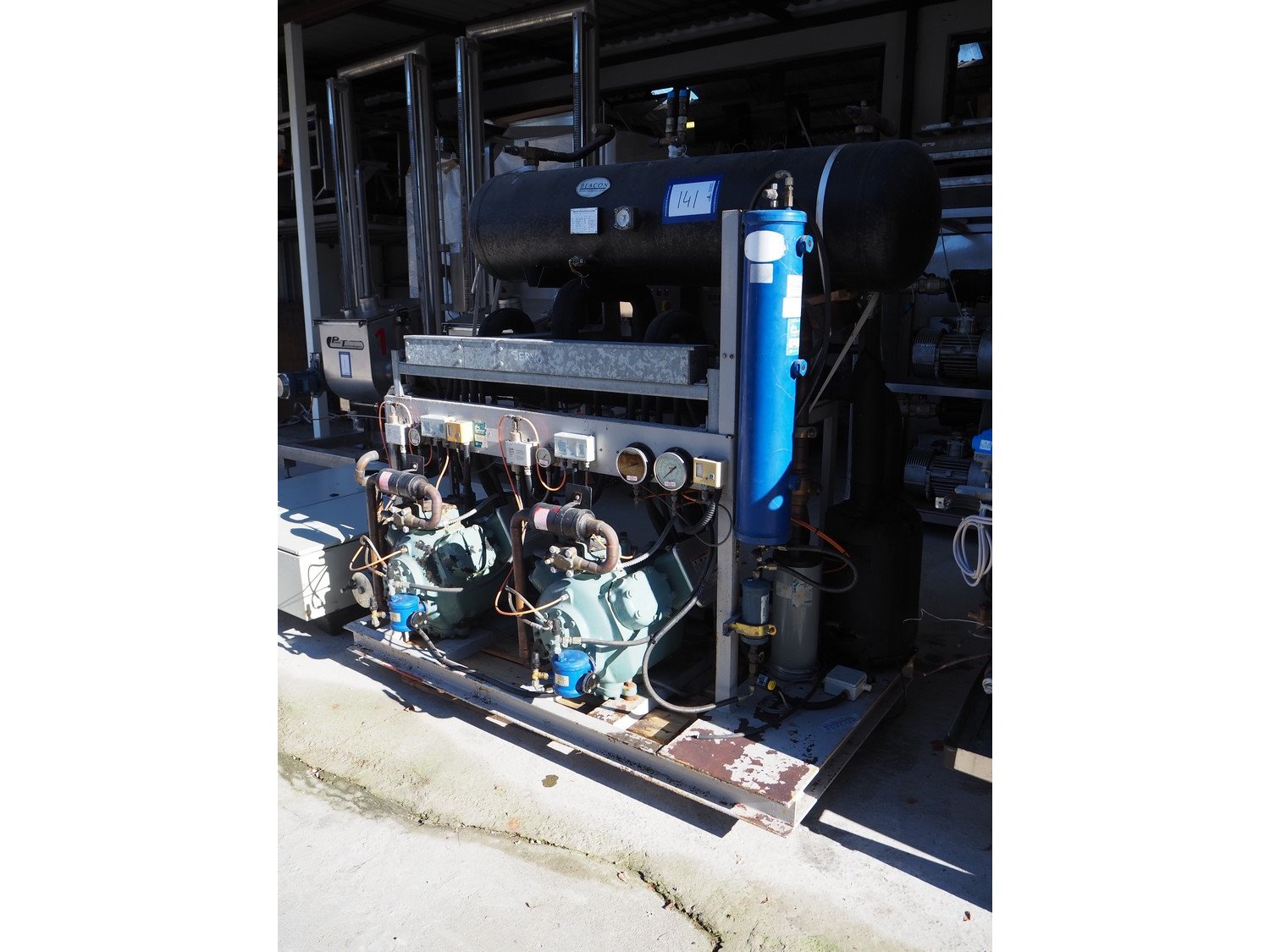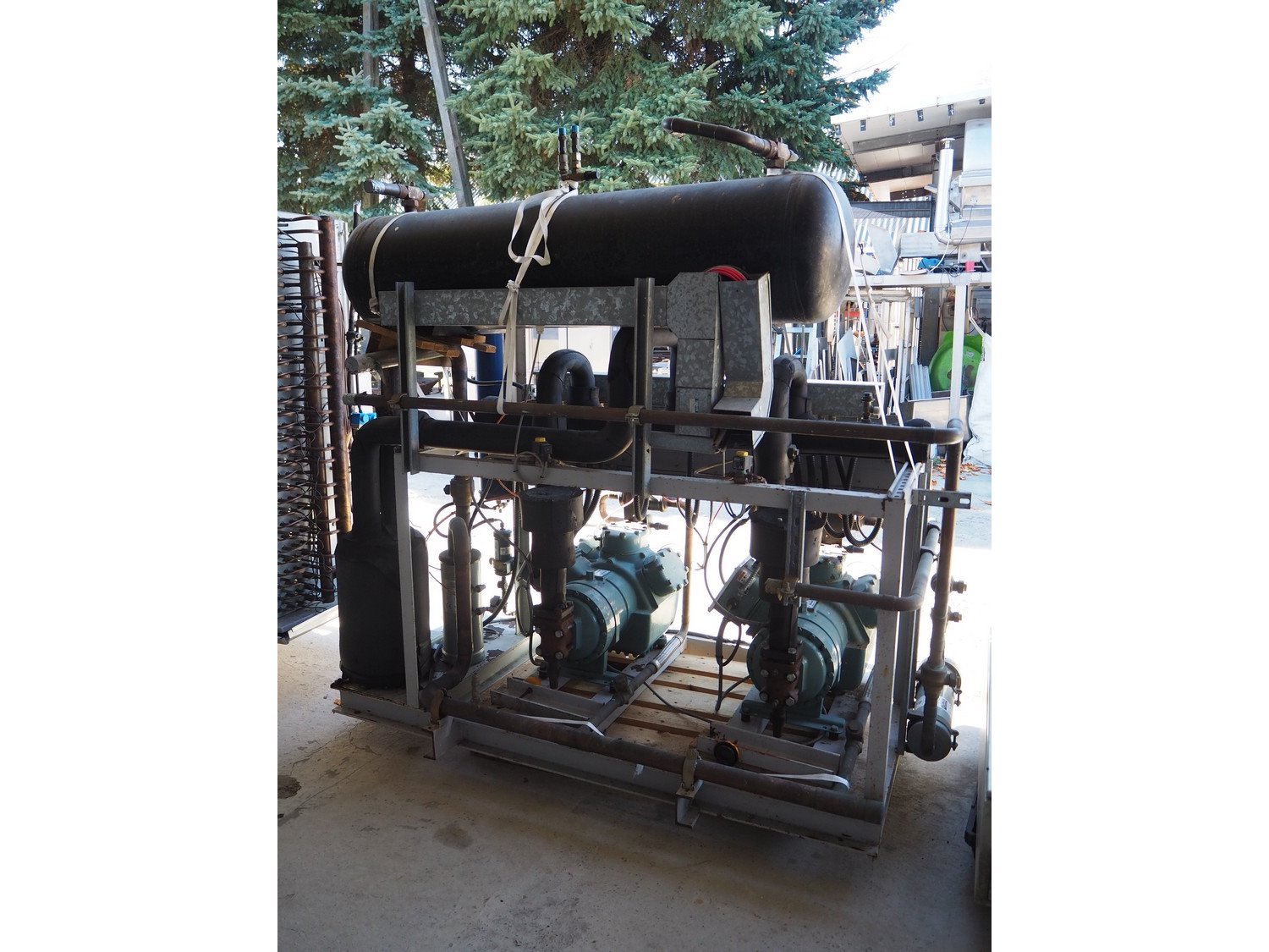 Stanref International Limited / Carlyle cool compressor rack, consisting of: 2 Carlyle cool compressors, model: 06EA575600, 400 V, 3 Ph, 50/60 Hz. Stanref International Limited gas tank, model: RBV-69166-02, year of construction: 2004, volume: 200 liter, fluid: A1 GRP2 GAS, dimensions: 2100 mm x 1100 mm x 2000 mm.