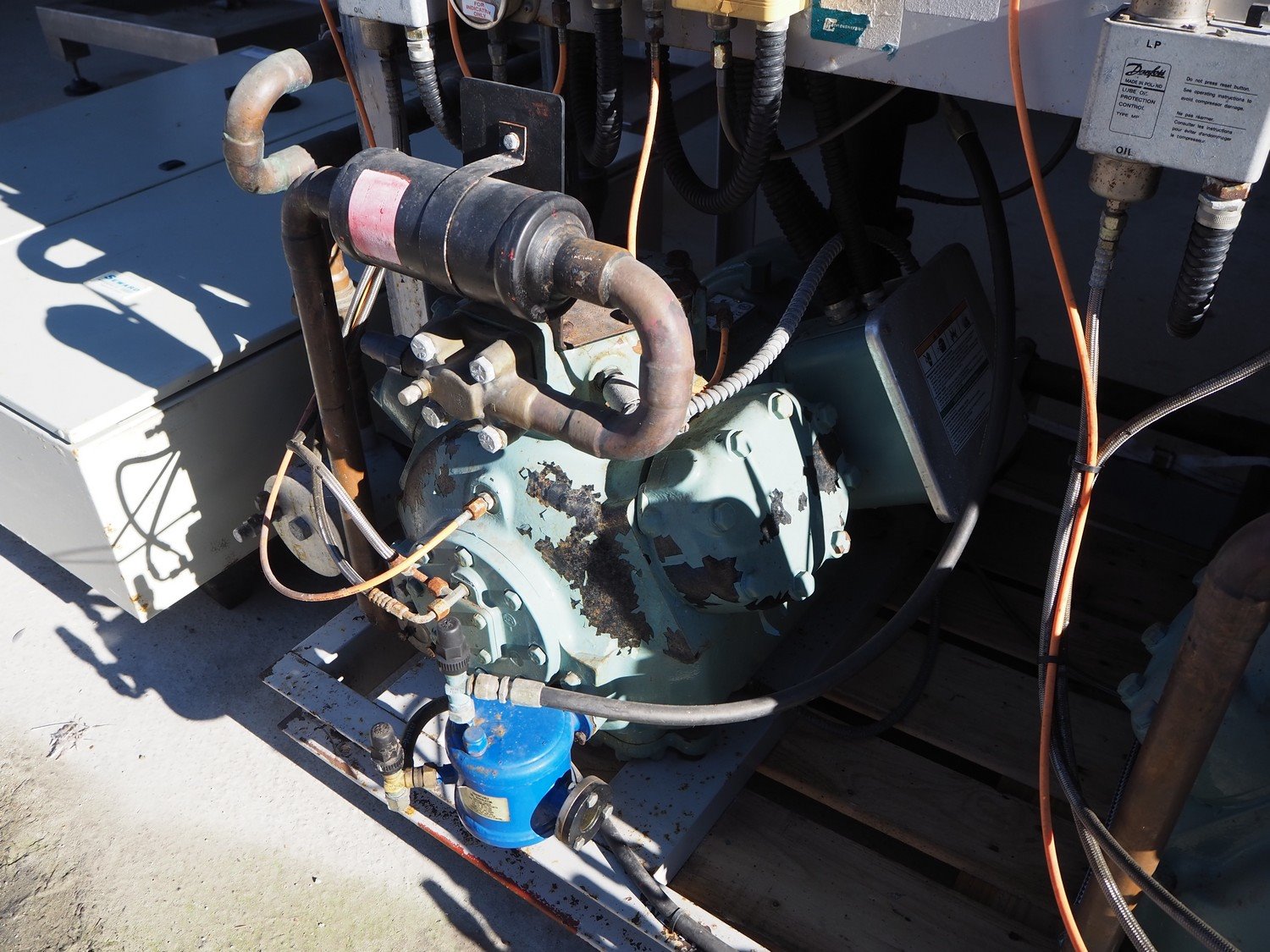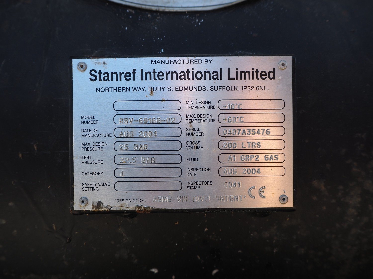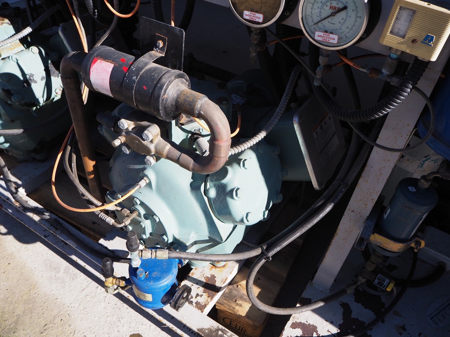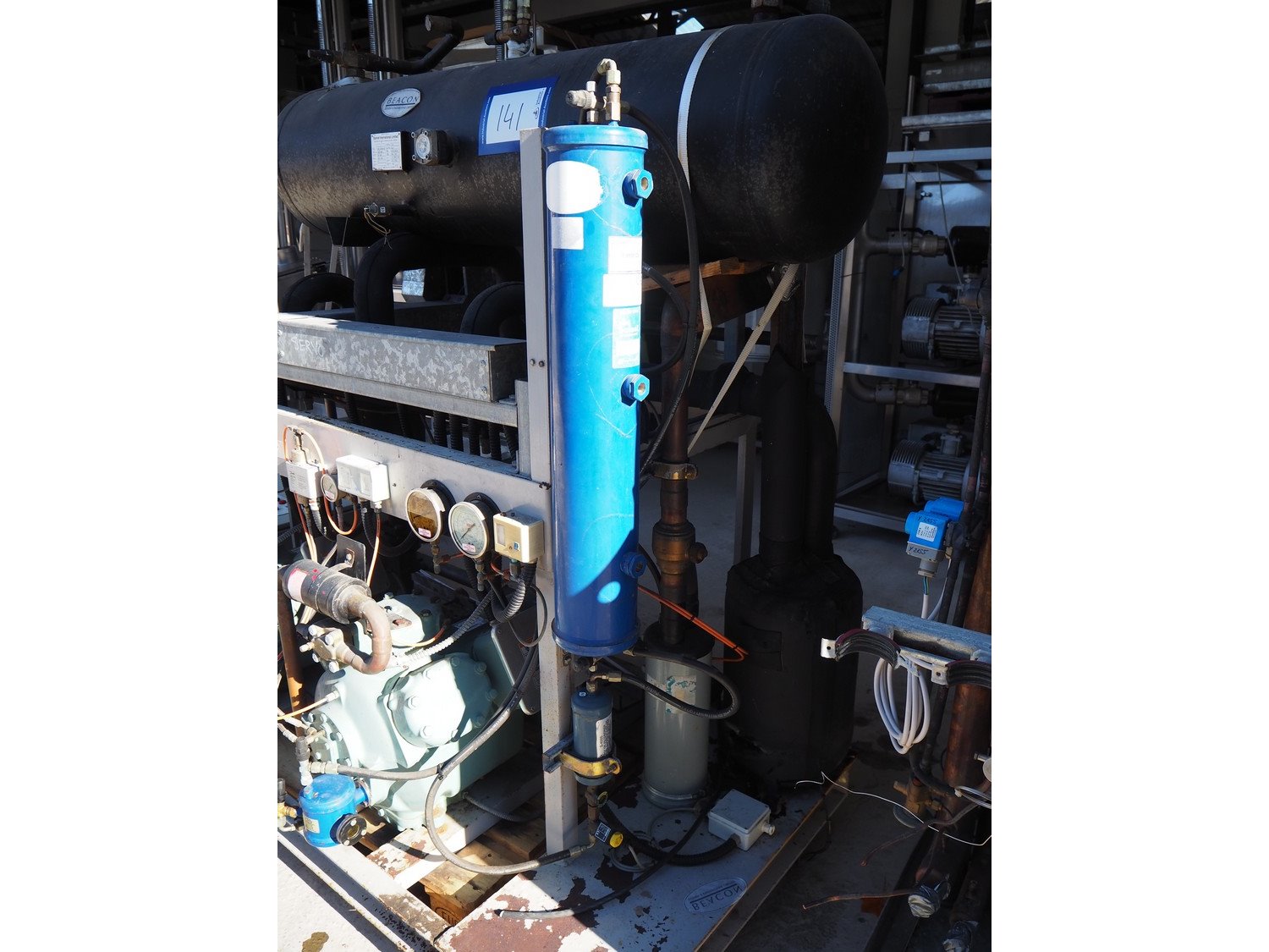 Stanref International Limited / Carlyle cool compressor rack, consisting of: 2 Carlyle cool compressors, model: 06EA575600, 400 V, 3 Ph, 50/60 Hz. Stanref International Limited gas tank, model: RBV-69166-02, year of construction: 2004, volume: 200 liter, fluid: A1 GRP2 GAS, dimensions: 2100 mm x 1100 mm x 2000 mm.