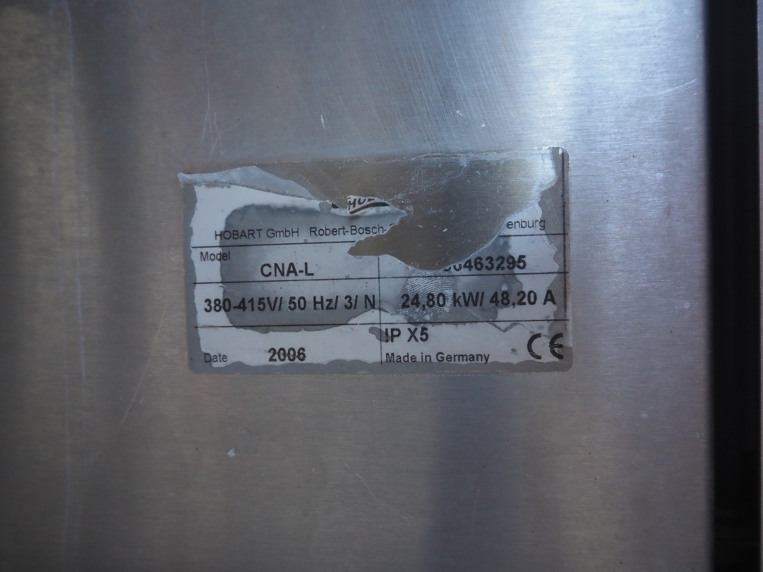 Hobart dishwasher, model: CNA-L, year of construction: 2006, 380-415 V, 3 Ph, 50 Hz, 48.20 A, 24.80 kW, clearance: 500 mm x 450 mm, total dimensions: 3450 mm x 800 mm x 2040 mm.