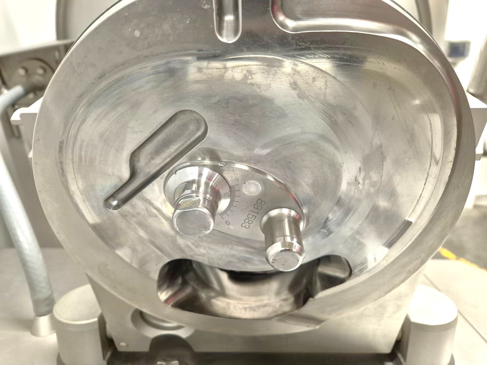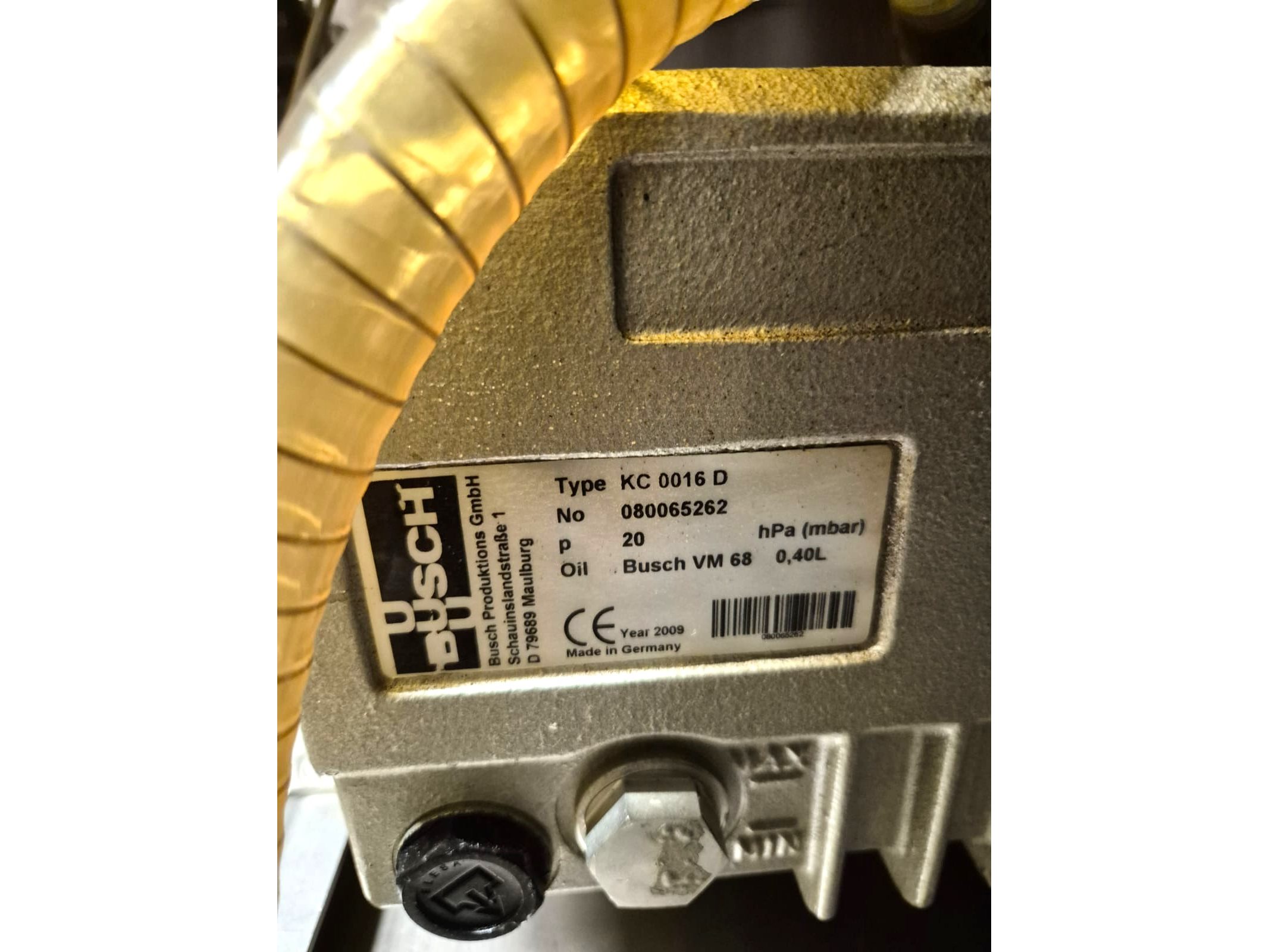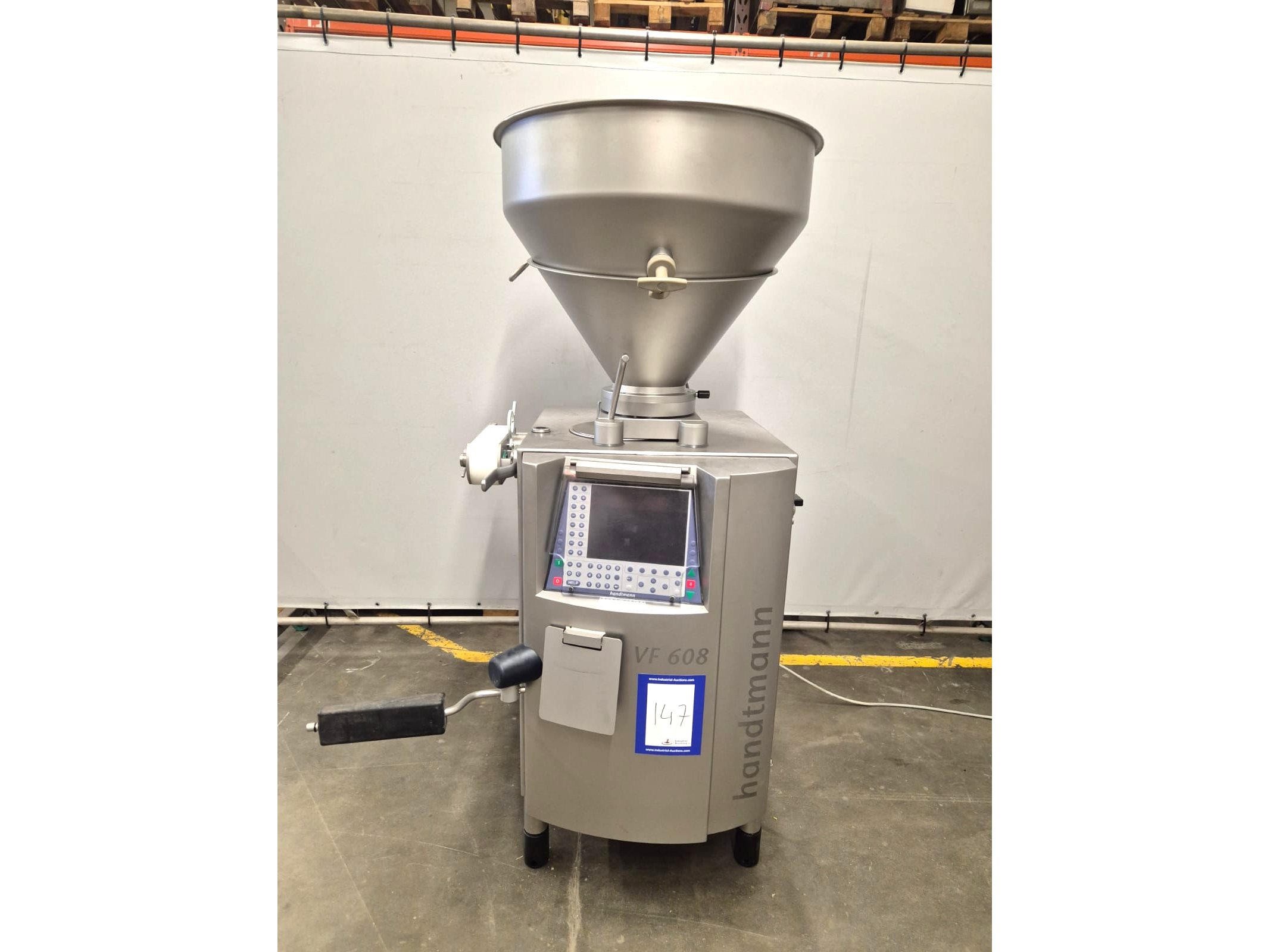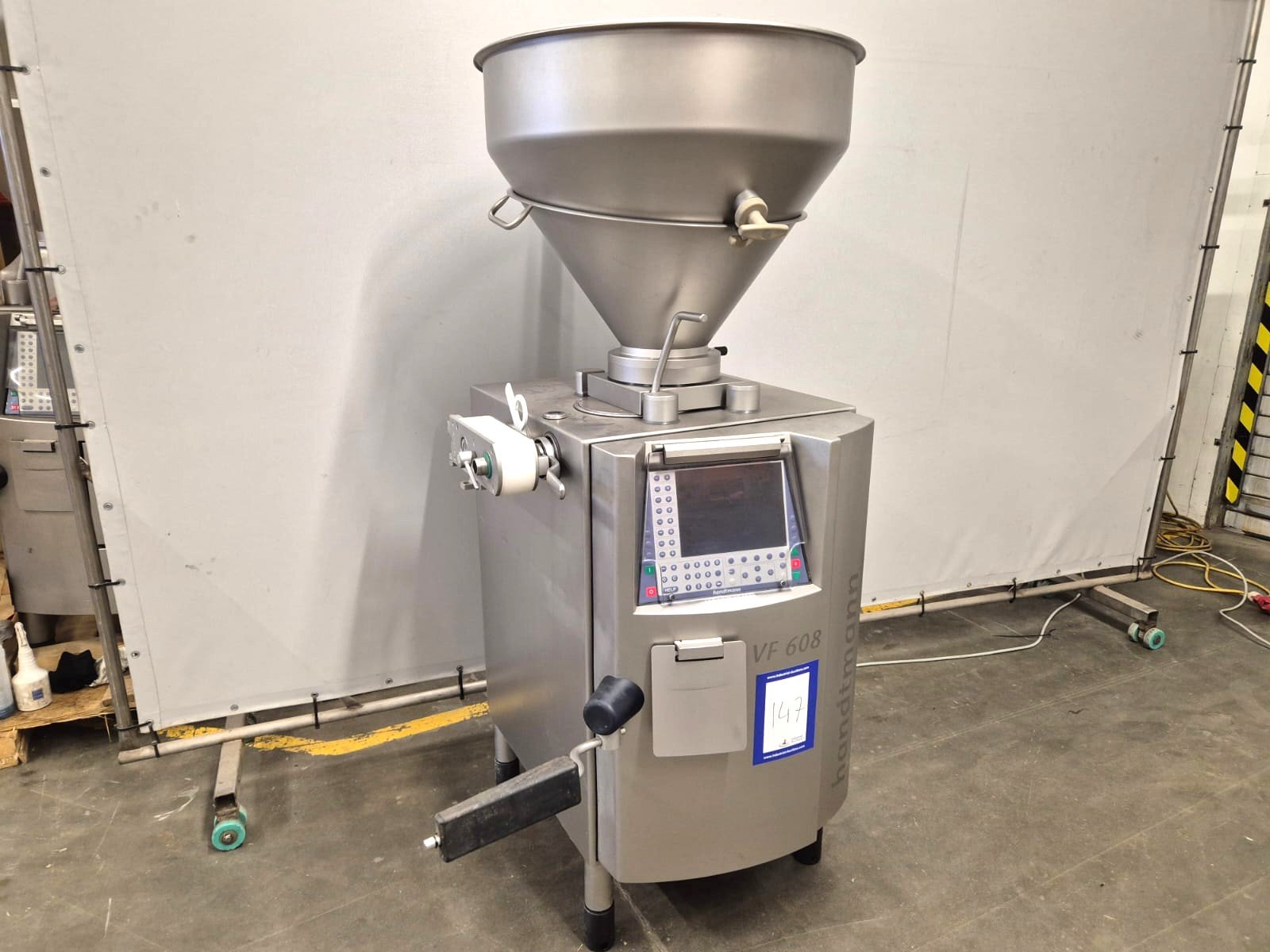 Handtmann vacuum filling machine with linking attachment, type: VF608, number: 25047 S, year of construction: 2008, 400 V, 3 Ph, 50 Hz, 3 kW, 5.1 A, Busch vacuum pump, type: KC 0016 D, 16m3/h, linking attachment number: 34-5/28592, total dimensions: 700 mm x 800 mm x 1850 mm.
