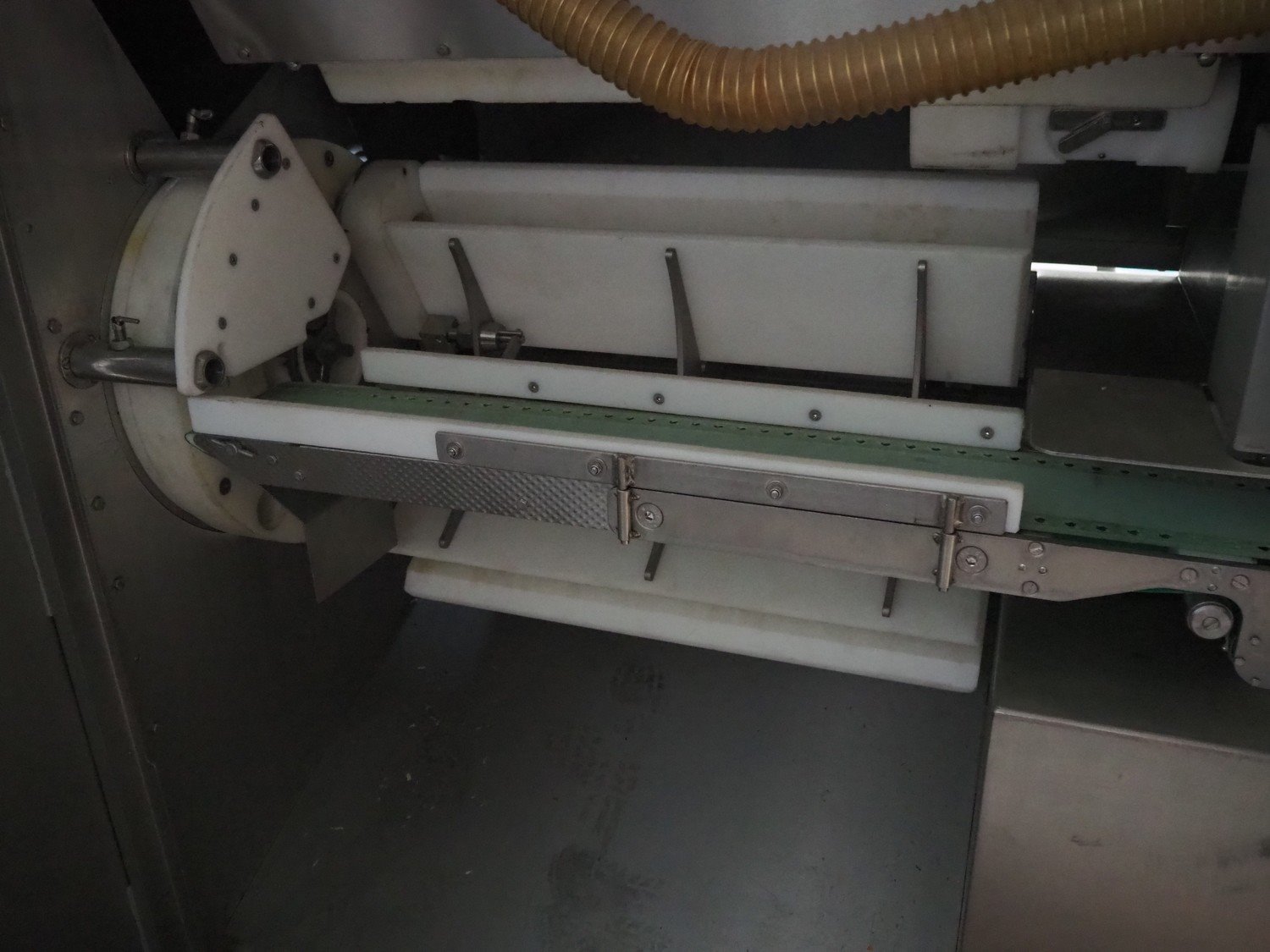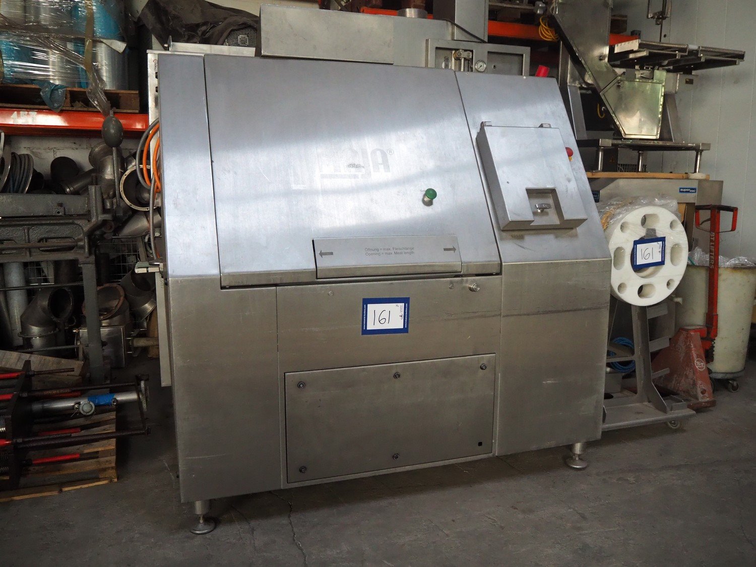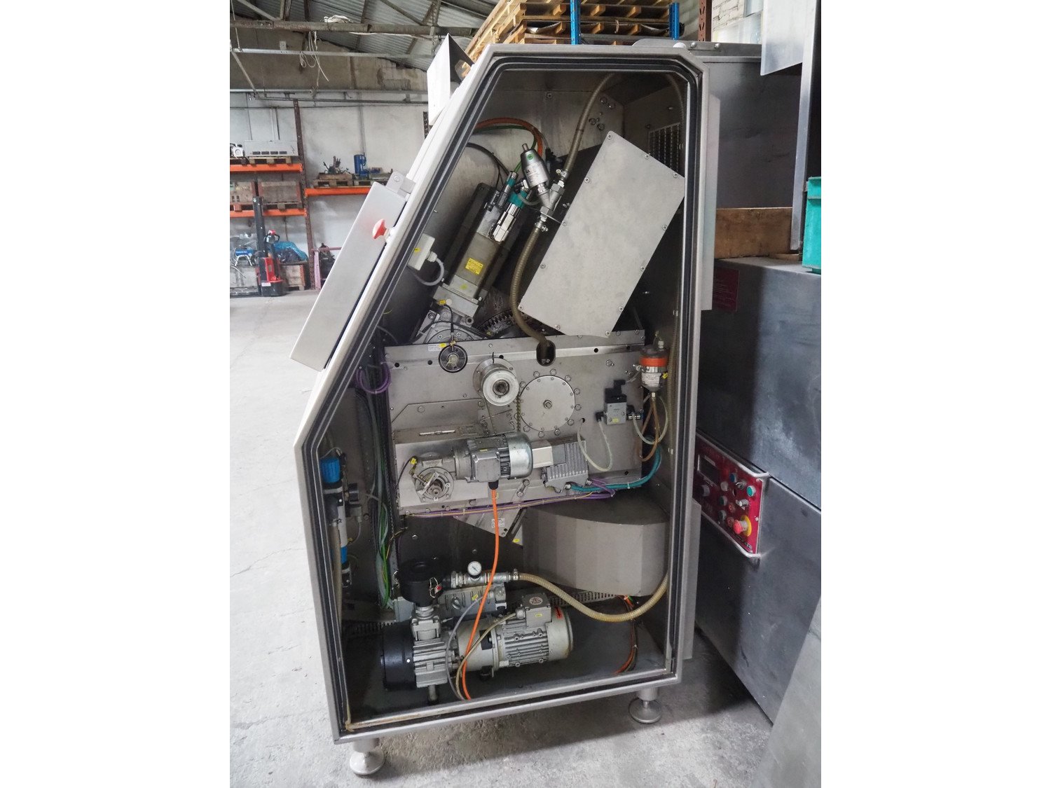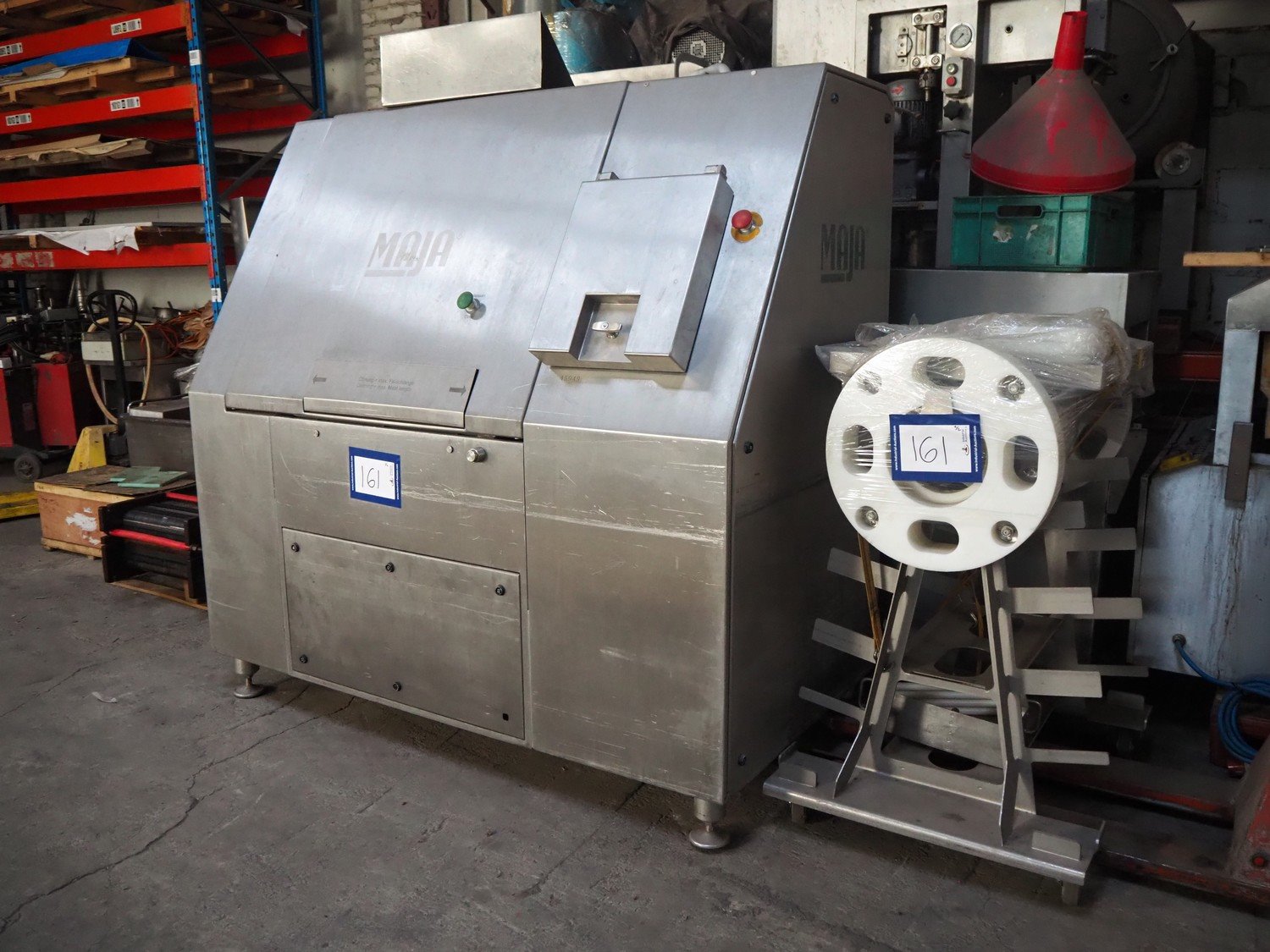 Maja portion control slicer, type: FP100, number: 45949, year of construction: 2006, 400 V, 50 Hz, Busch vacuum pump, number: 060062236, capacity: 160 m³ per hour, dimensions: 1900 mm x 1100 mm x 2000 mm. Including s/s trolley with moulds.