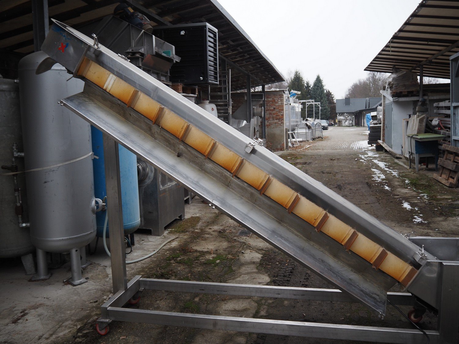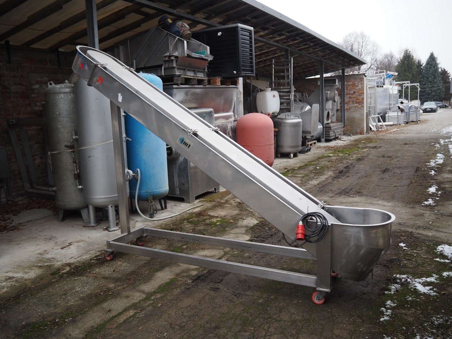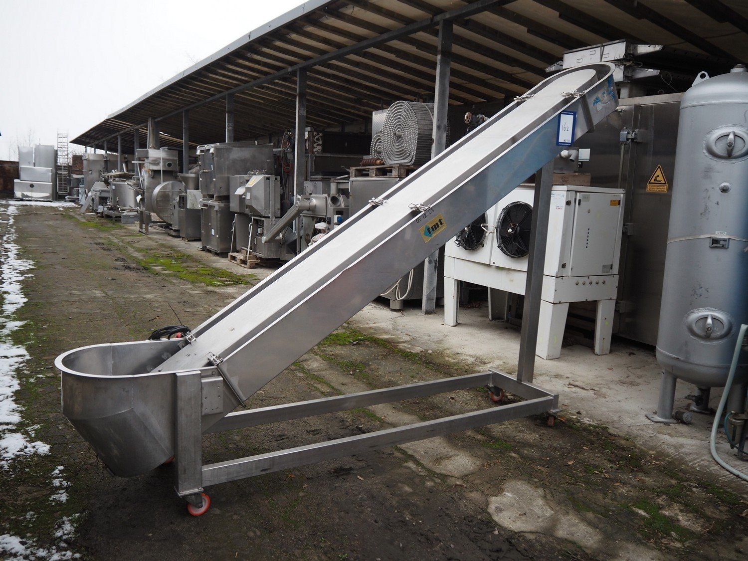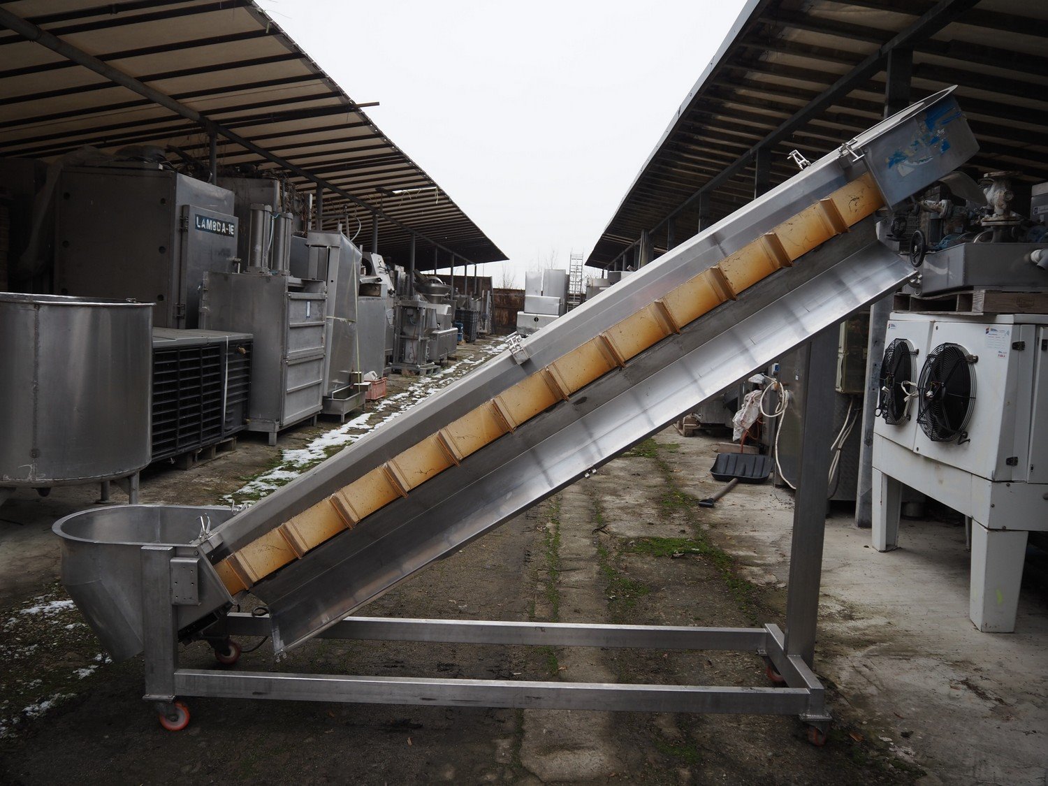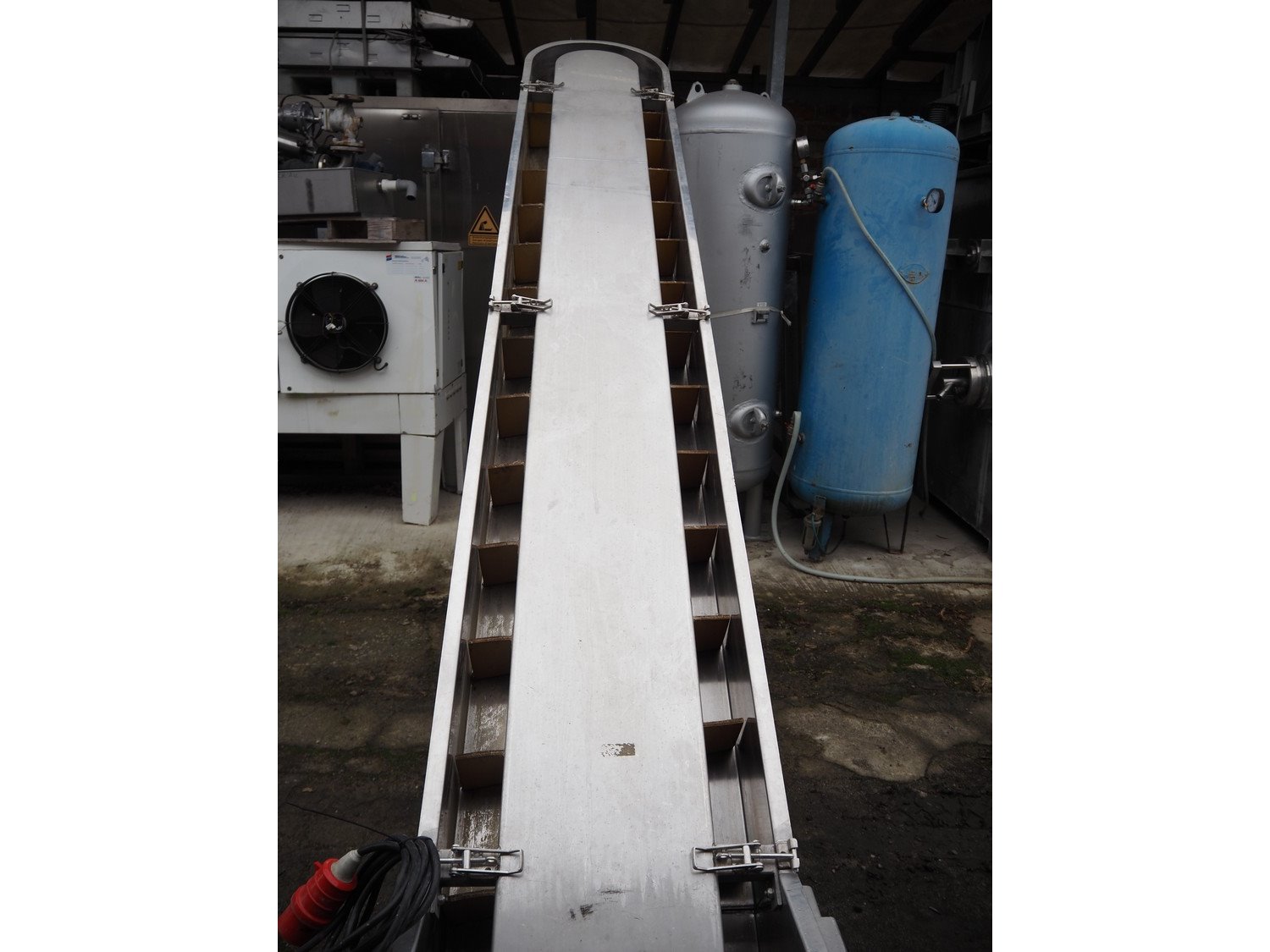 FMT mobile elevating belt, type: OPVB7502-PO-PCK, year of construction: 1995, 220-380 V, 3 Ph, 50 Hz, 1.75 A, plastic belt with dividers, belt width: 120 mm, divider height: 80 mm, distance between dividers: 195 mm, elevating height: 2000 mm, total dimensions: 3300 mm x 600 mm x 2260 mm.