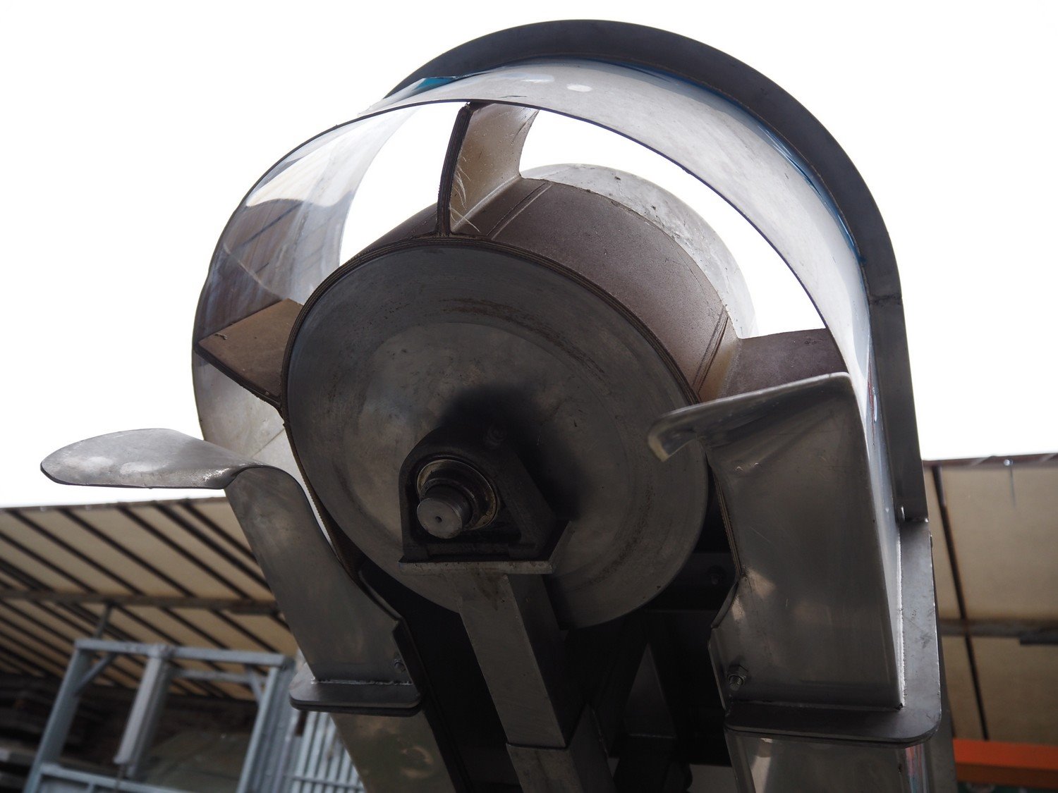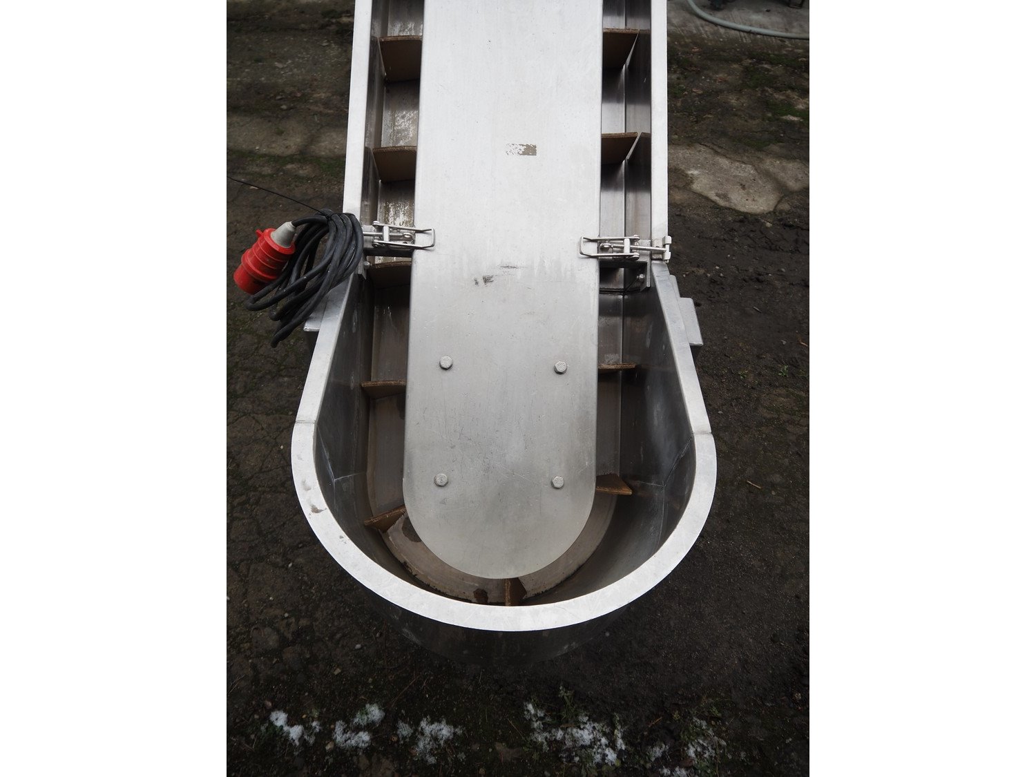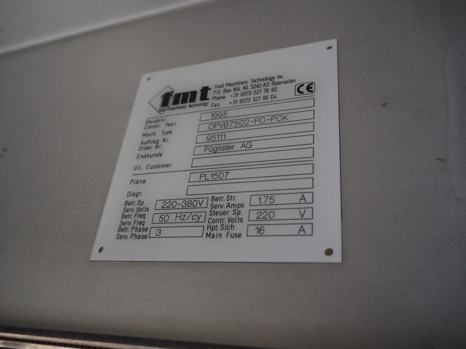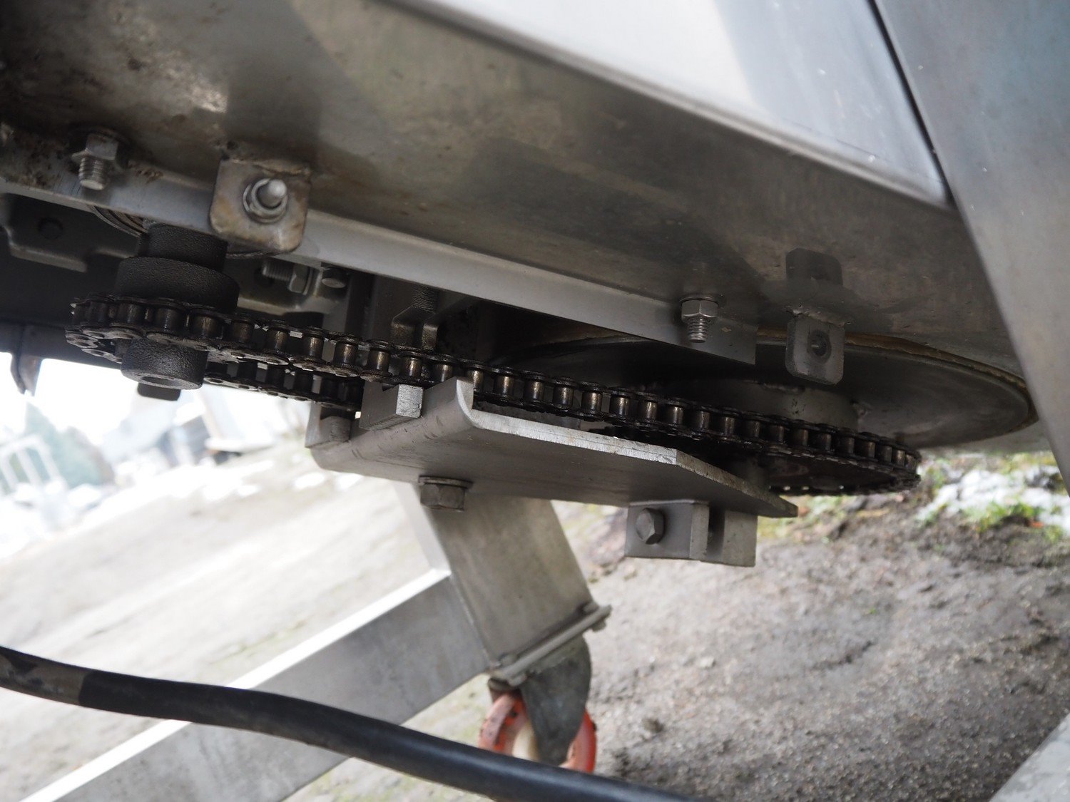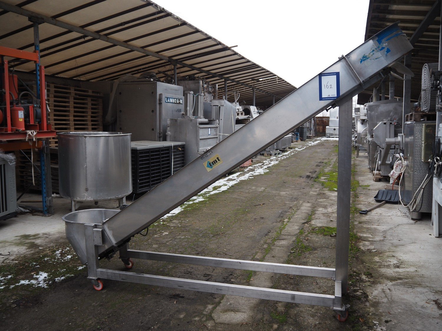 FMT mobile elevating belt, type: OPVB7502-PO-PCK, year of construction: 1995, 220-380 V, 3 Ph, 50 Hz, 1.75 A, plastic belt with dividers, belt width: 120 mm, divider height: 80 mm, distance between dividers: 195 mm, elevating height: 2000 mm, total dimensions: 3300 mm x 600 mm x 2260 mm.