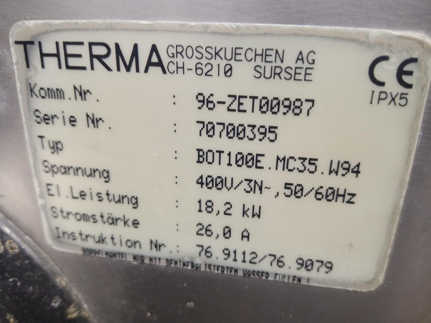 Therma tiltable cooking vessel, type: BOT100E.MC35.W94, serial number: 70700395, 400 V, 3 Ph, 50 Hz, 18.2 kW, 26 A, volume: 100 liter, dimensions: 1200 mm x 1080 mm x 1000 mm.