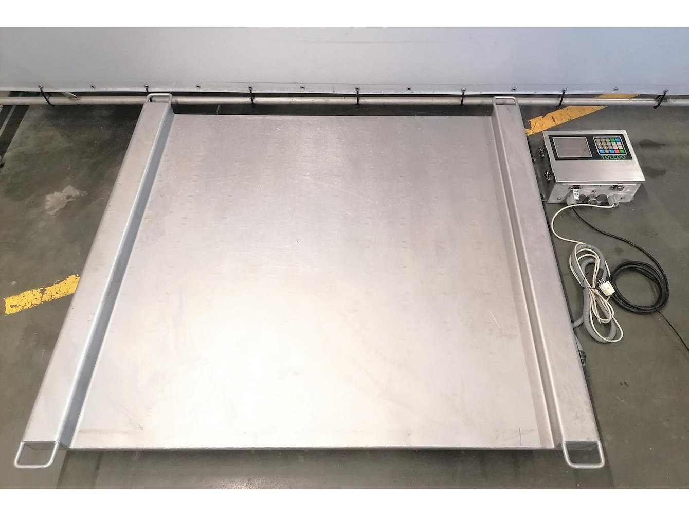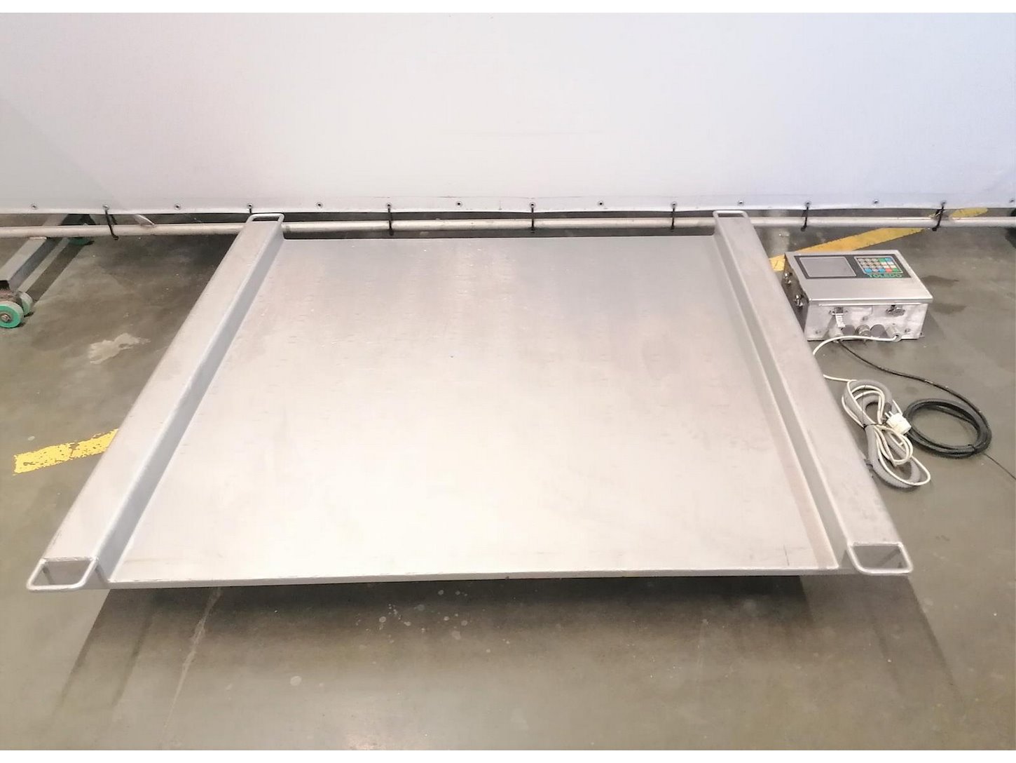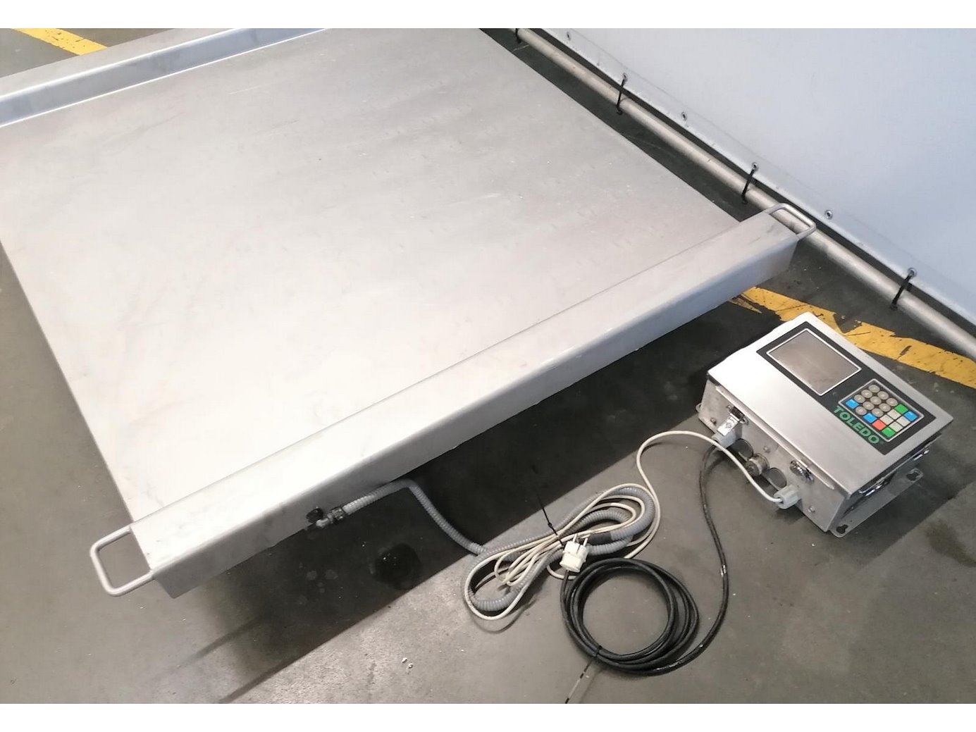 Mettler-Toledo s/s floor weighing scale with indicator, model indicator: 8142, serial number: 4338675-4NV, 220 V, 50/60 Hz, 0.23 A, dimensions scale: 1250 mm x 1250 mm, total dimensions: 1500 mm x 1400 mm x 150 mm.