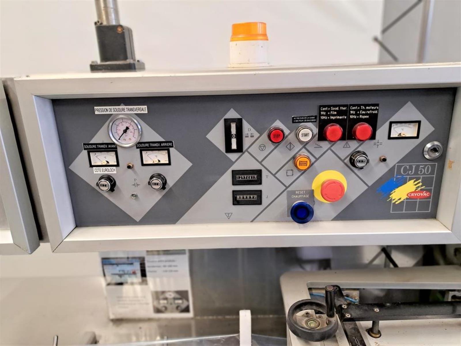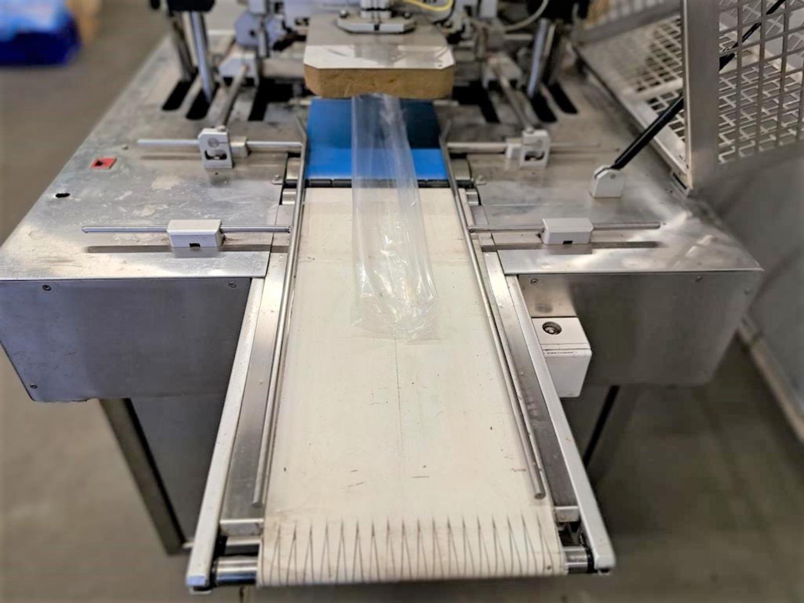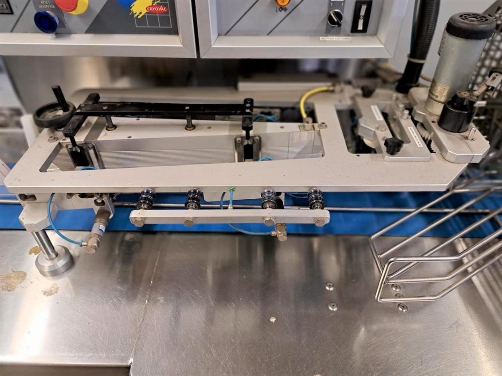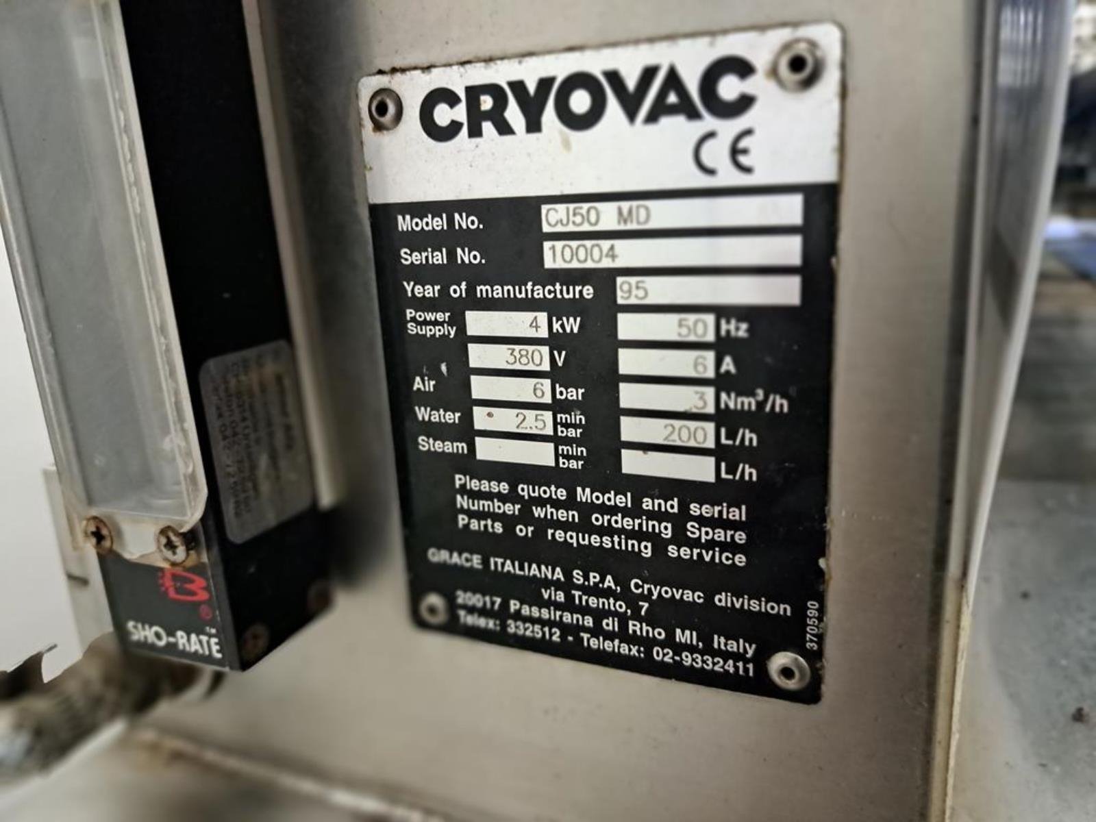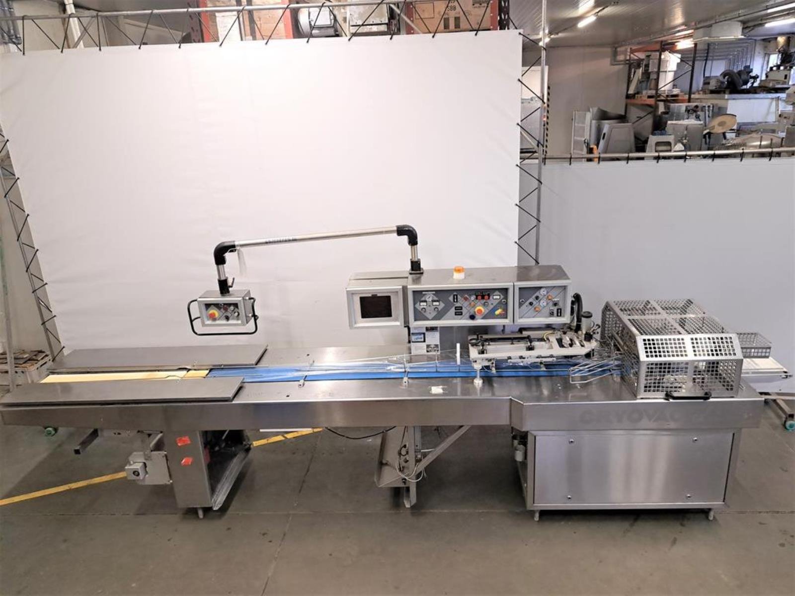 Cryovac flowpacker with gas mixing option, model: CJ50 MD, serial number: 10004, year of construction: 1995, 380 V, 3 Ph, 50 Hz, 4 kW, 6 A, plastic belt, belt width: 190 mm and 220 mm, film width: 400 mm, seal length: 180 mm, total dimensions: 5200 mm x 1000 mm x 1900 mm.