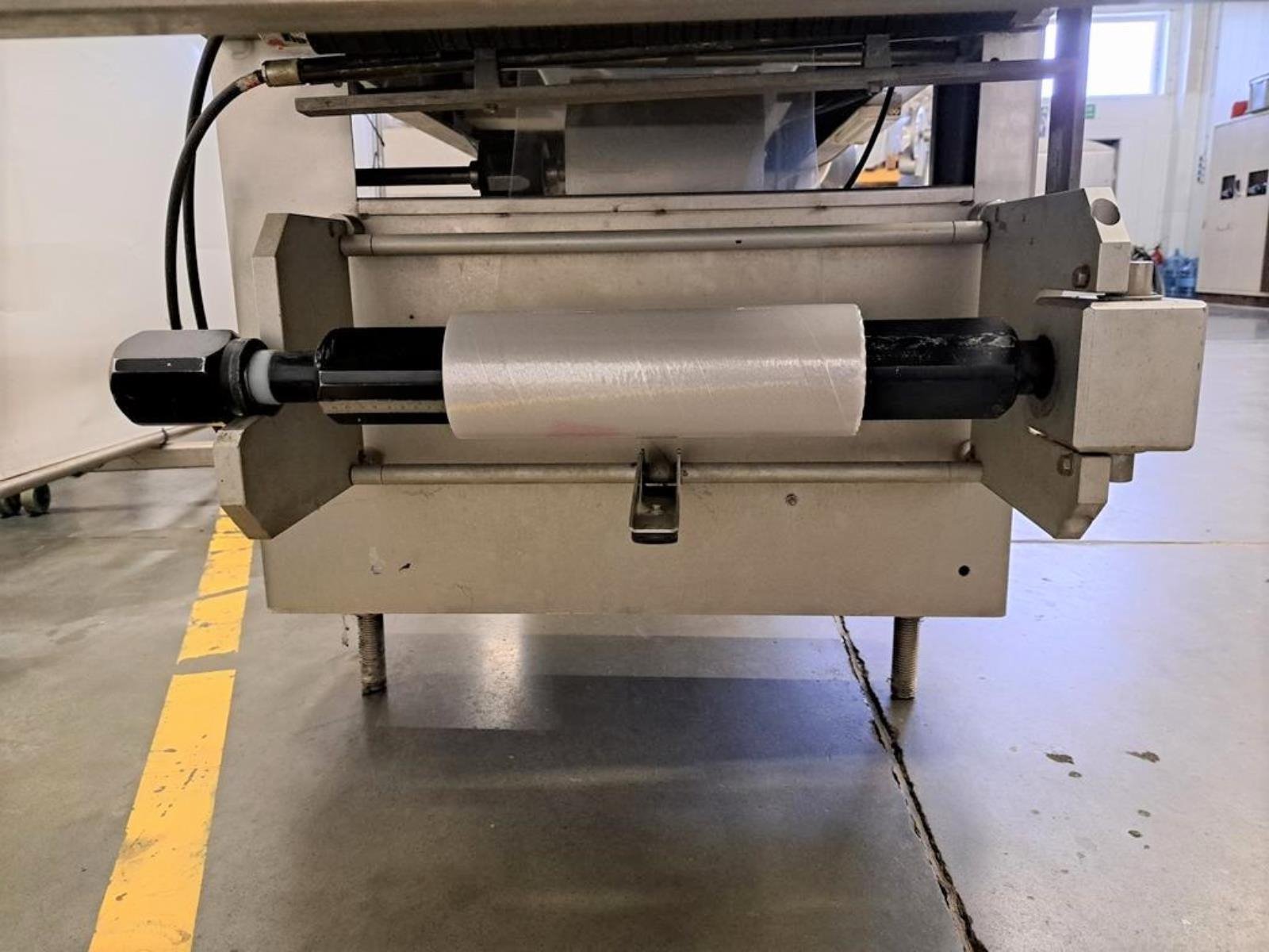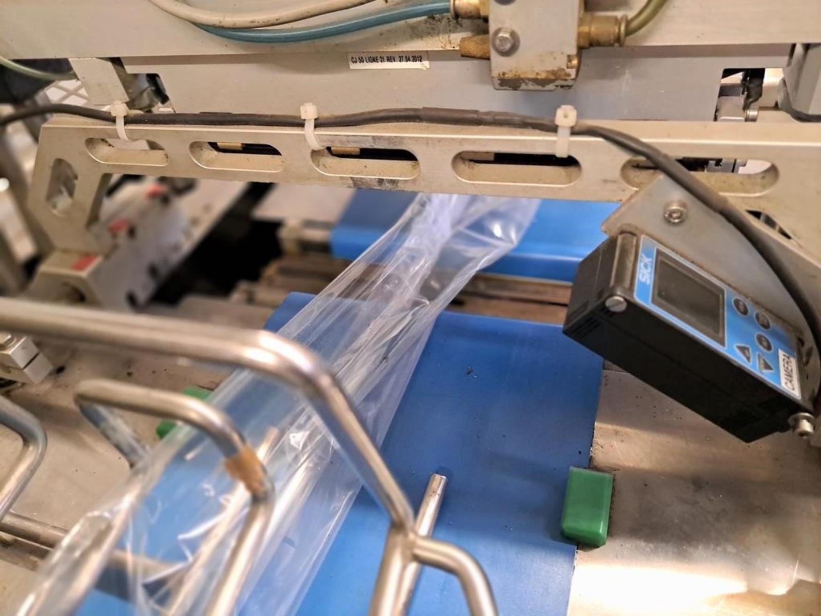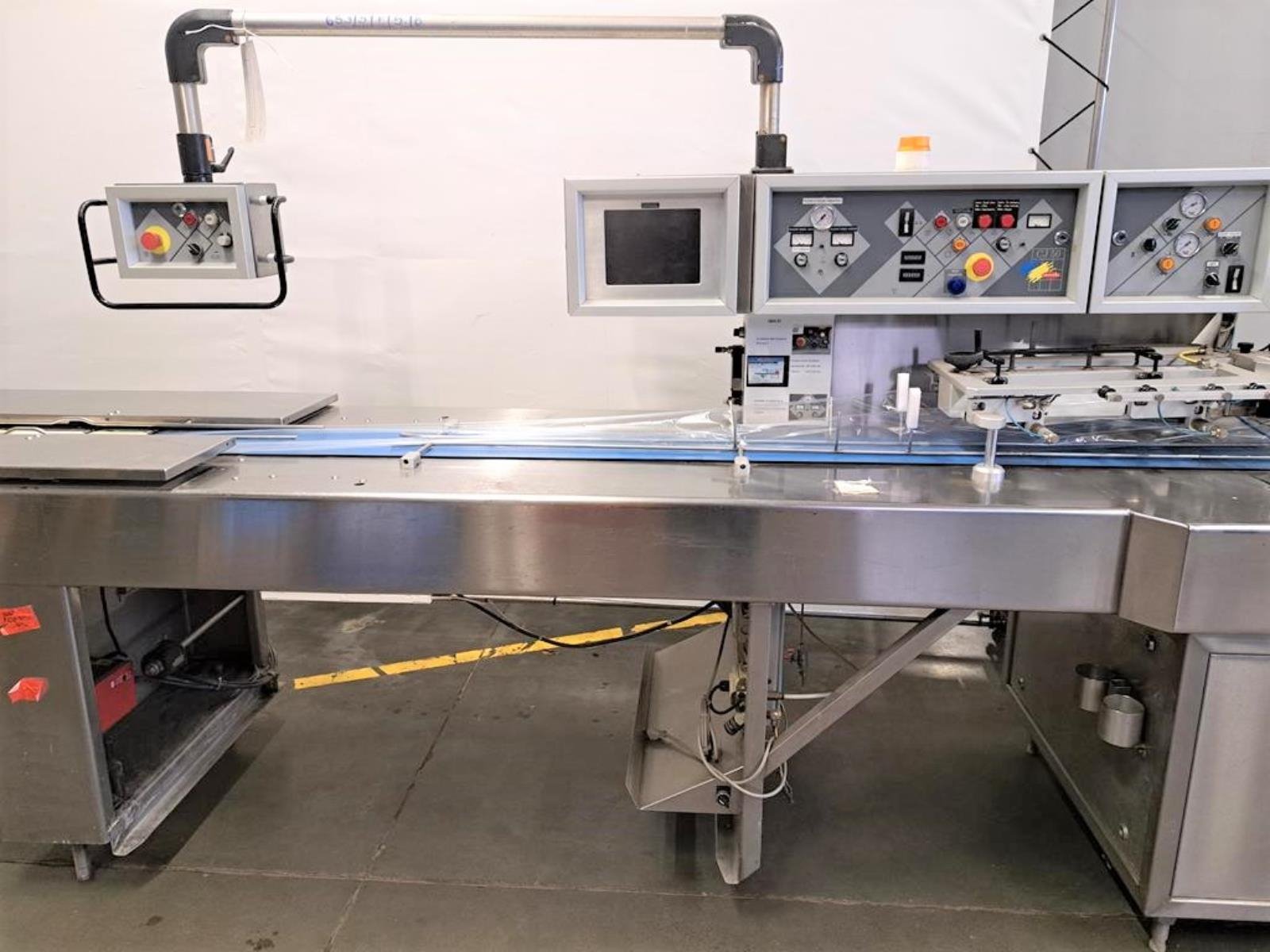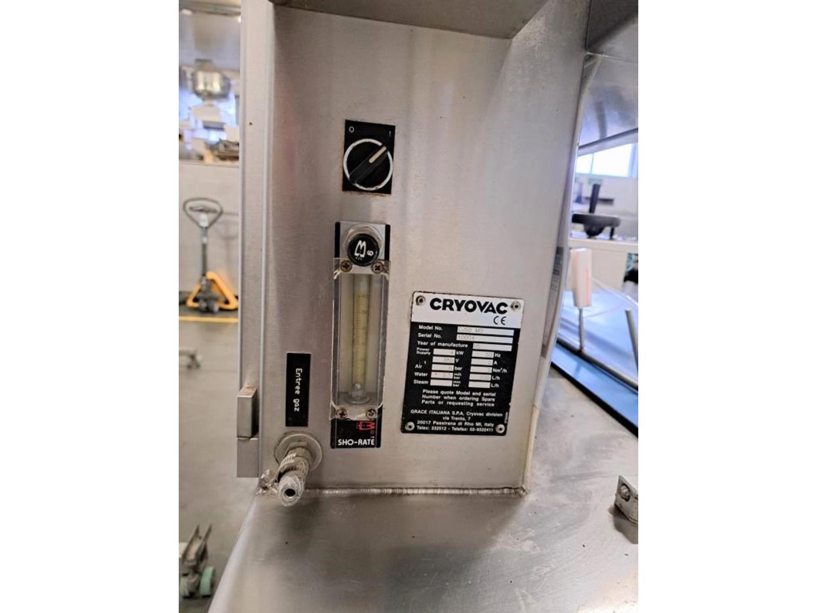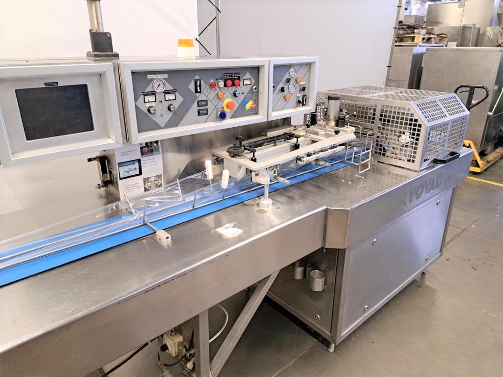 Cryovac flowpacker with gas mixing option, model: CJ50 MD, serial number: 10004, year of construction: 1995, 380 V, 3 Ph, 50 Hz, 4 kW, 6 A, plastic belt, belt width: 190 mm and 220 mm, film width: 400 mm, seal length: 180 mm, total dimensions: 5200 mm x 1000 mm x 1900 mm.