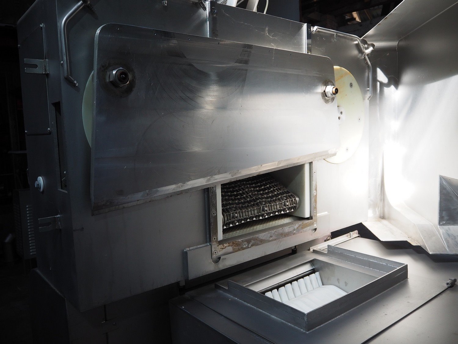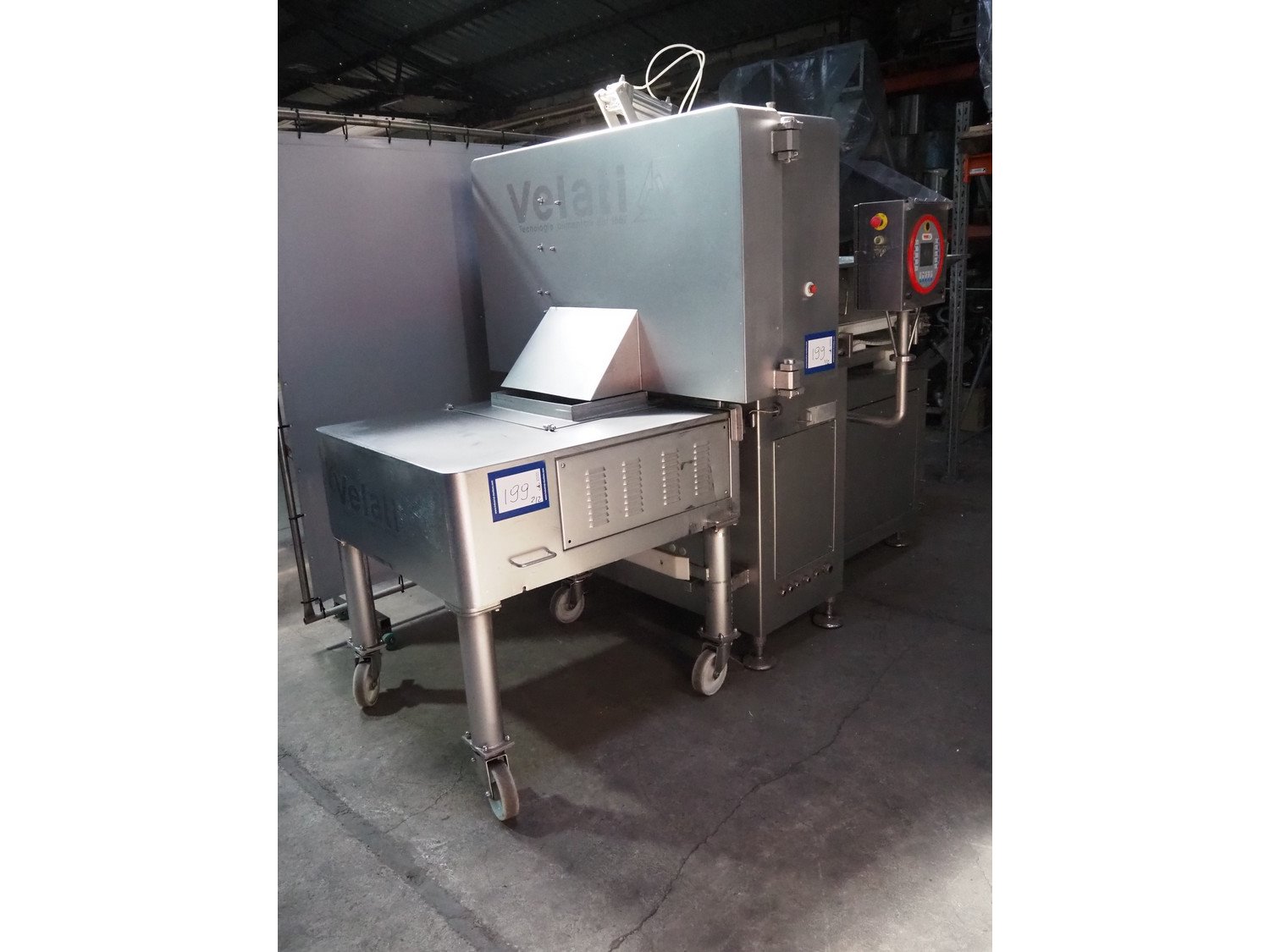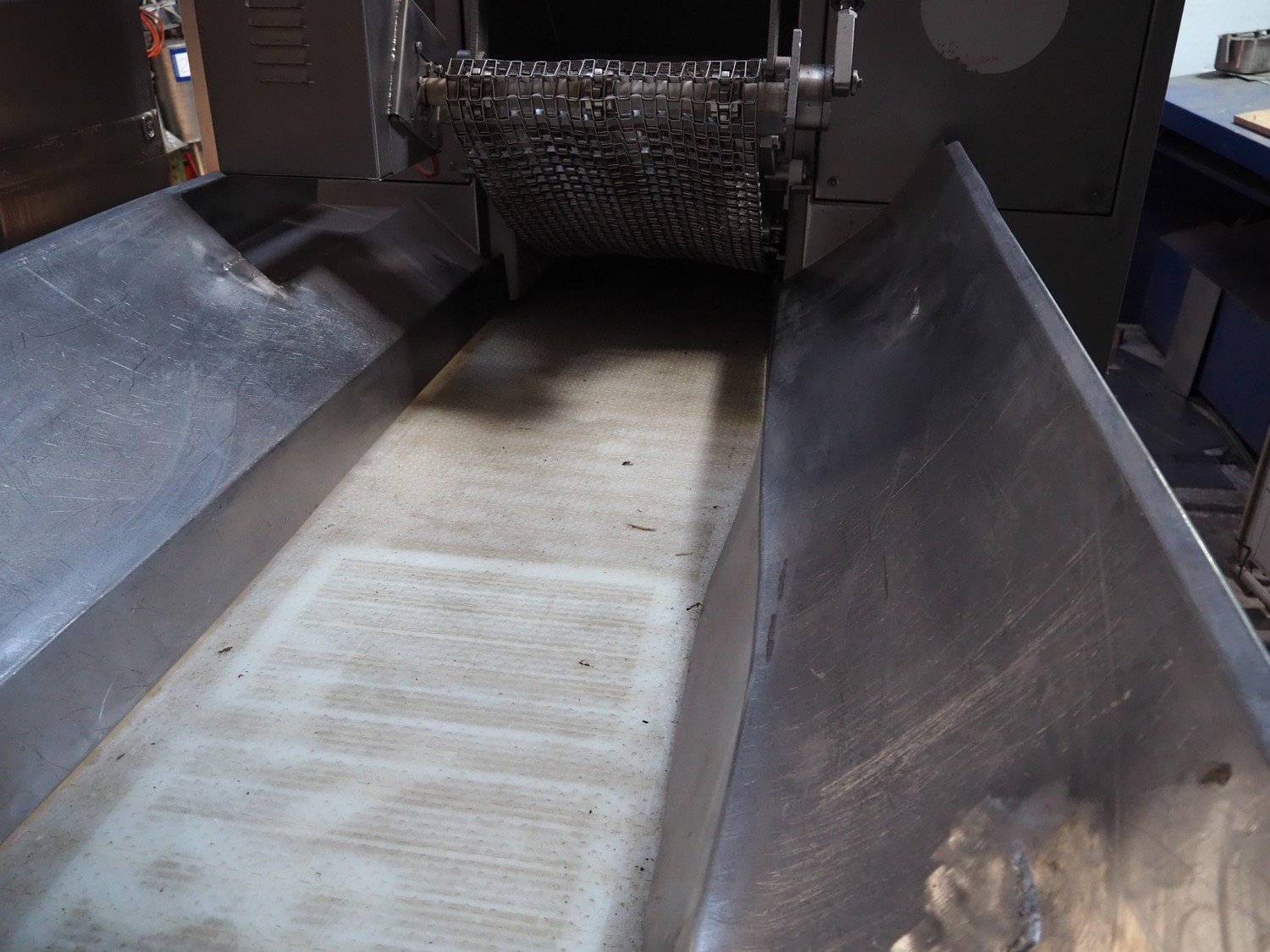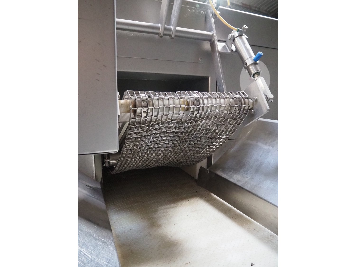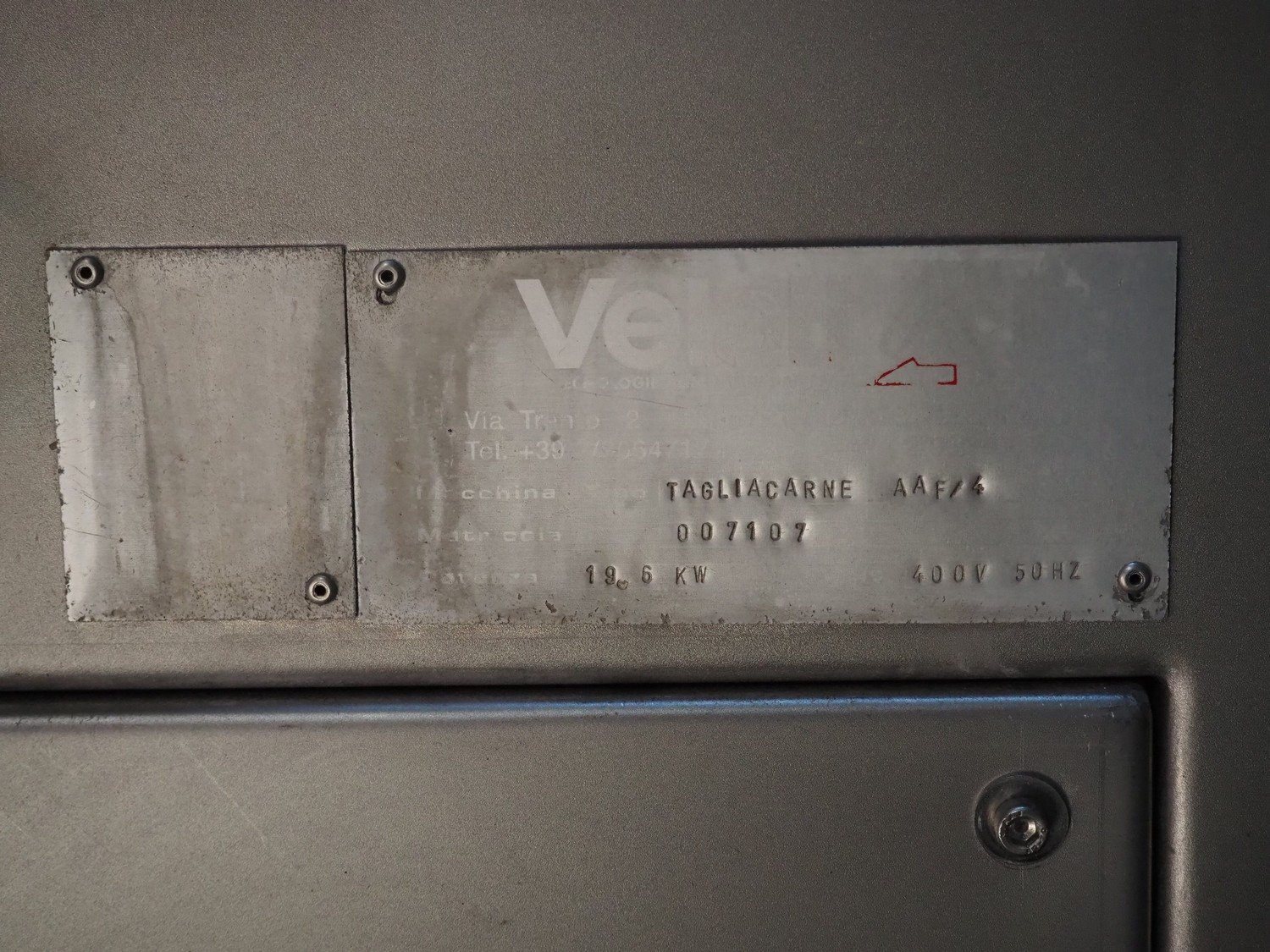 Velati continuous meat cutter, type: Tagliacarne AAF/4, serial number: 007107, 400 V, 50 Hz, 19.6 kW, plastic belt, belt width: 560 mm, s/s mesh belt, belt width: 400 mm, distance between knives: (13x) 35 mm, total dimensions: 2500 mm x 1800 mm x 2400 mm, 1200 mm x 1200 mm x 1150 mm.