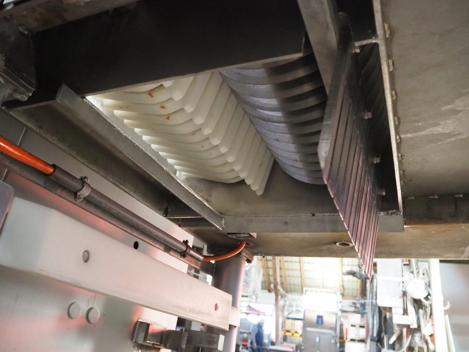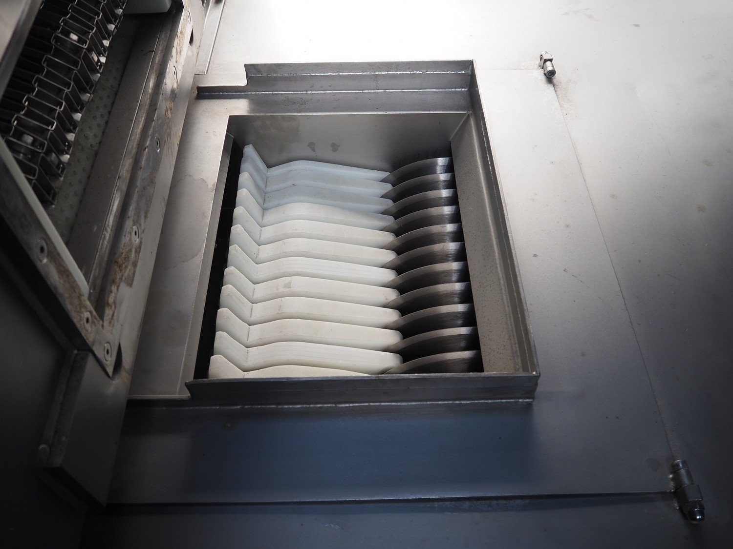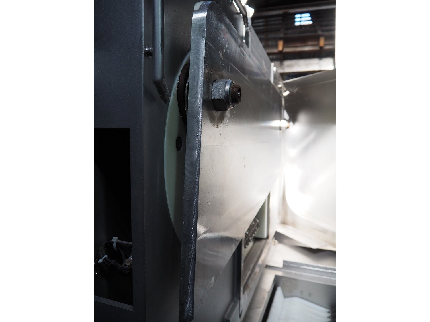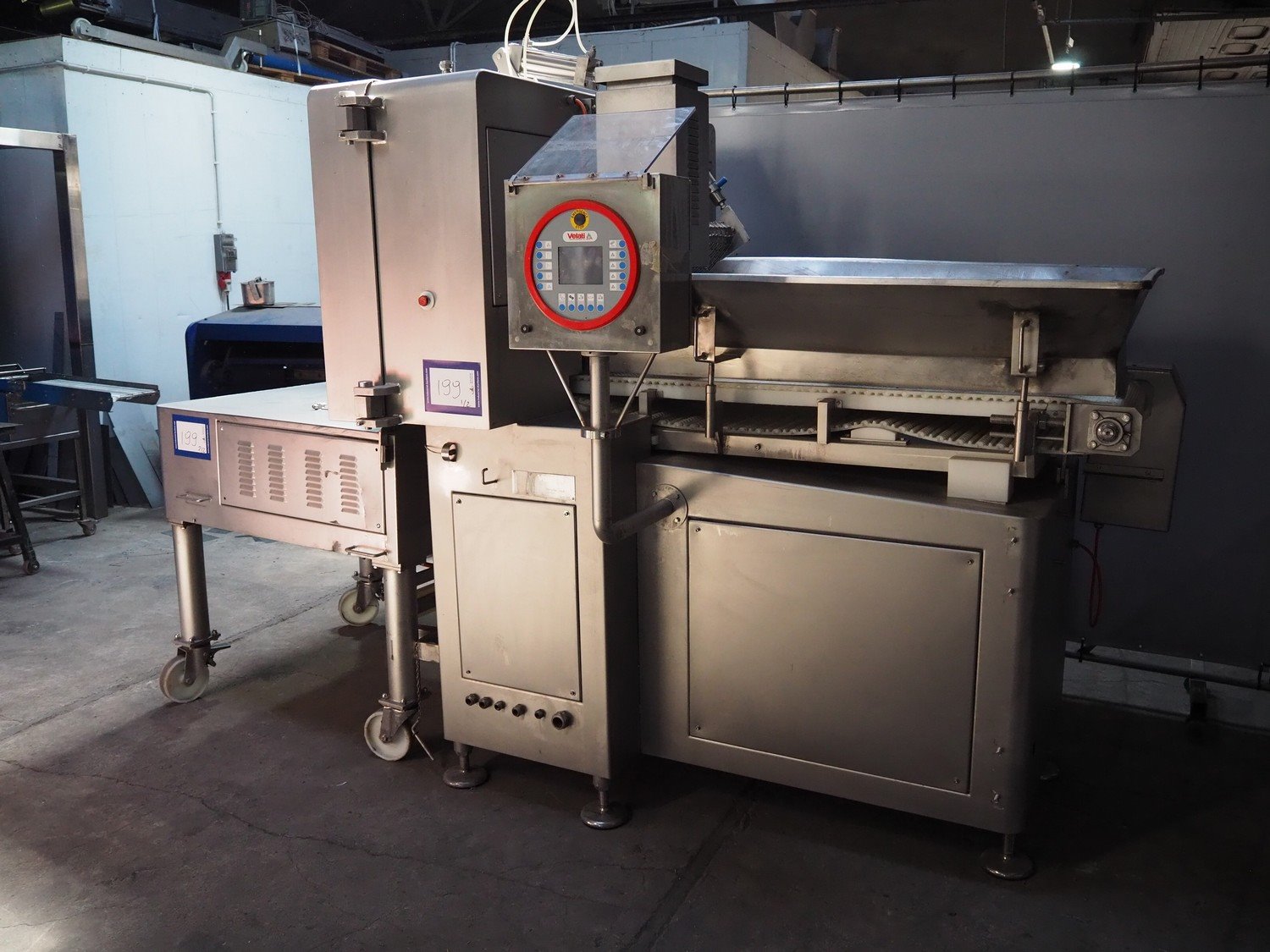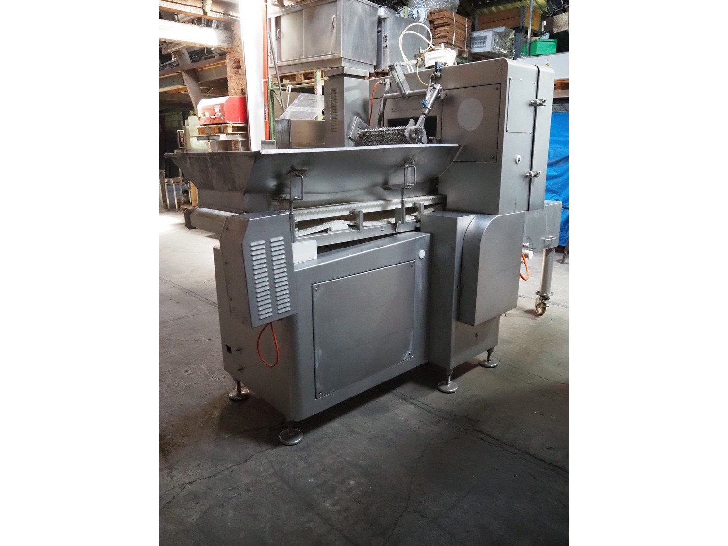 Velati continuous meat cutter, type: Tagliacarne AAF/4, serial number: 007107, 400 V, 50 Hz, 19.6 kW, plastic belt, belt width: 560 mm, s/s mesh belt, belt width: 400 mm, distance between knives: (13x) 35 mm, total dimensions: 2500 mm x 1800 mm x 2400 mm, 1200 mm x 1200 mm x 1150 mm.