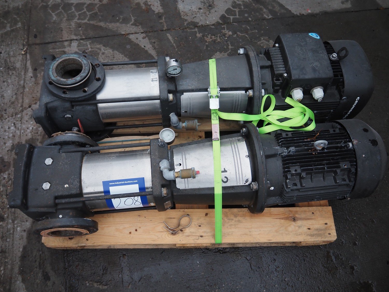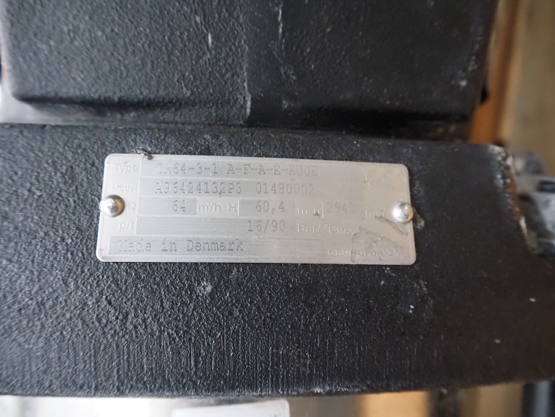 2 Grundfos centrifugal pumps, type: CRN 64-3-1 AFAE-EUUE, model: A96424132P3, dimensions: (2x) 1300 mm x 370 mm x 370 mm.
