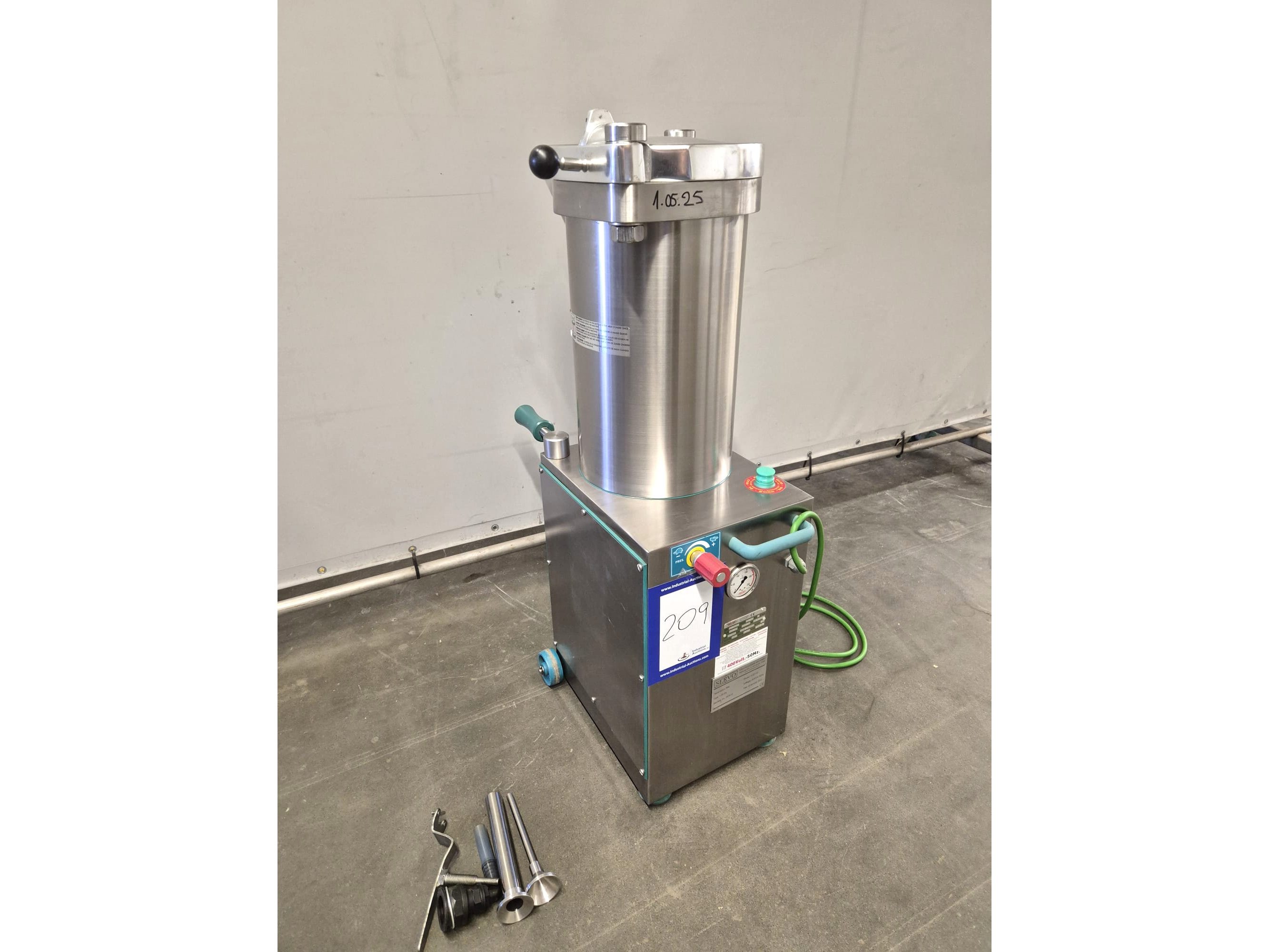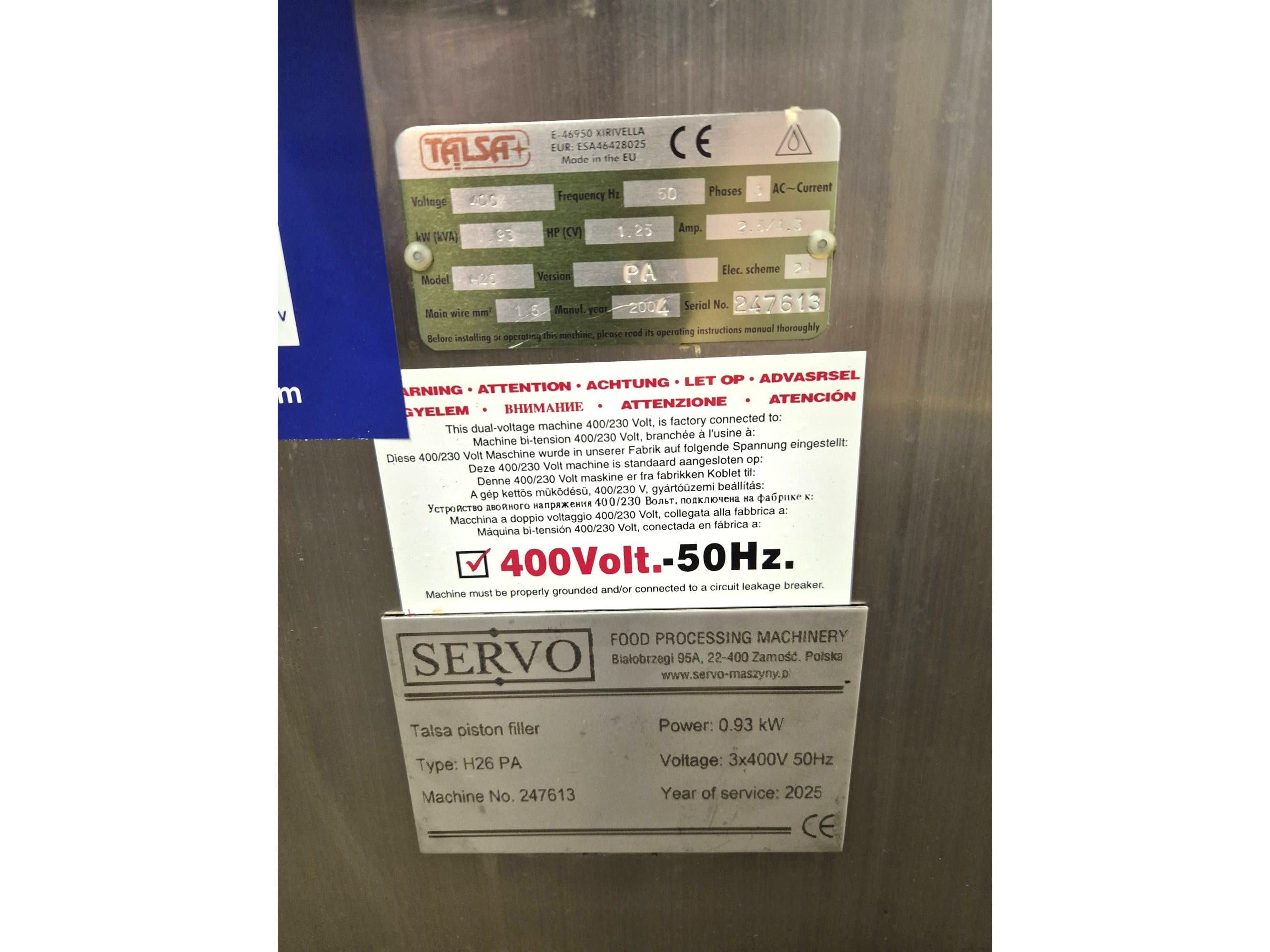 Talsa piston filler, model: H26, version: PA, year of construction: 2004, serial number: 247613, 400 V, 50 Hz, 3 Ph, 0.93 kW, dimensions: 650 mm x 400 mm x 1200 mm. New lid gasket. Overhauled by Servo.