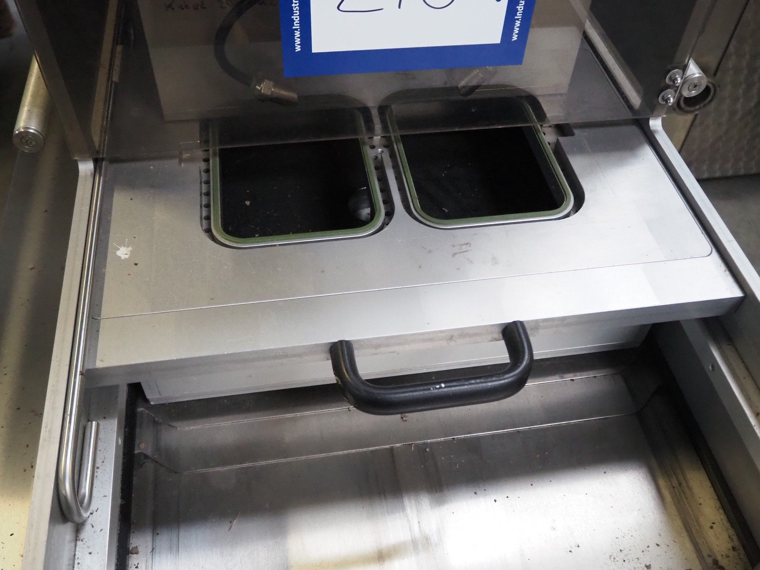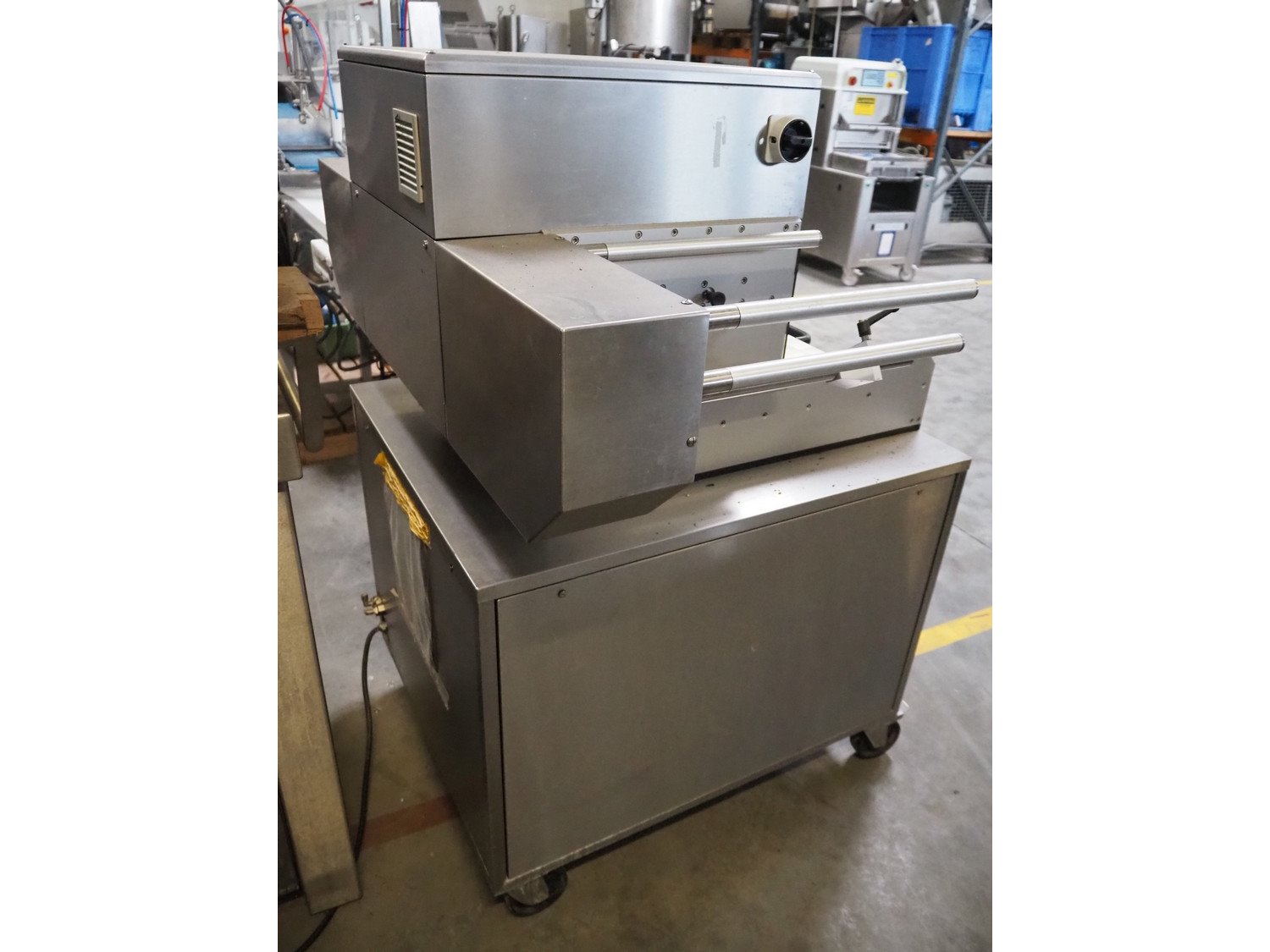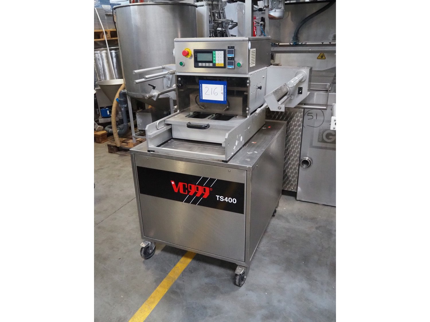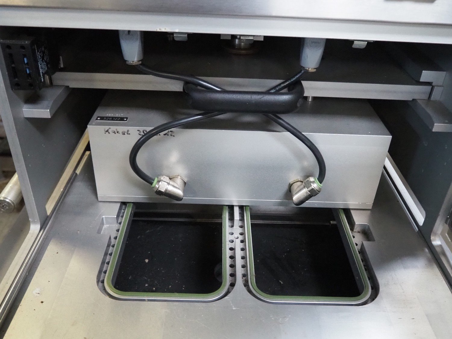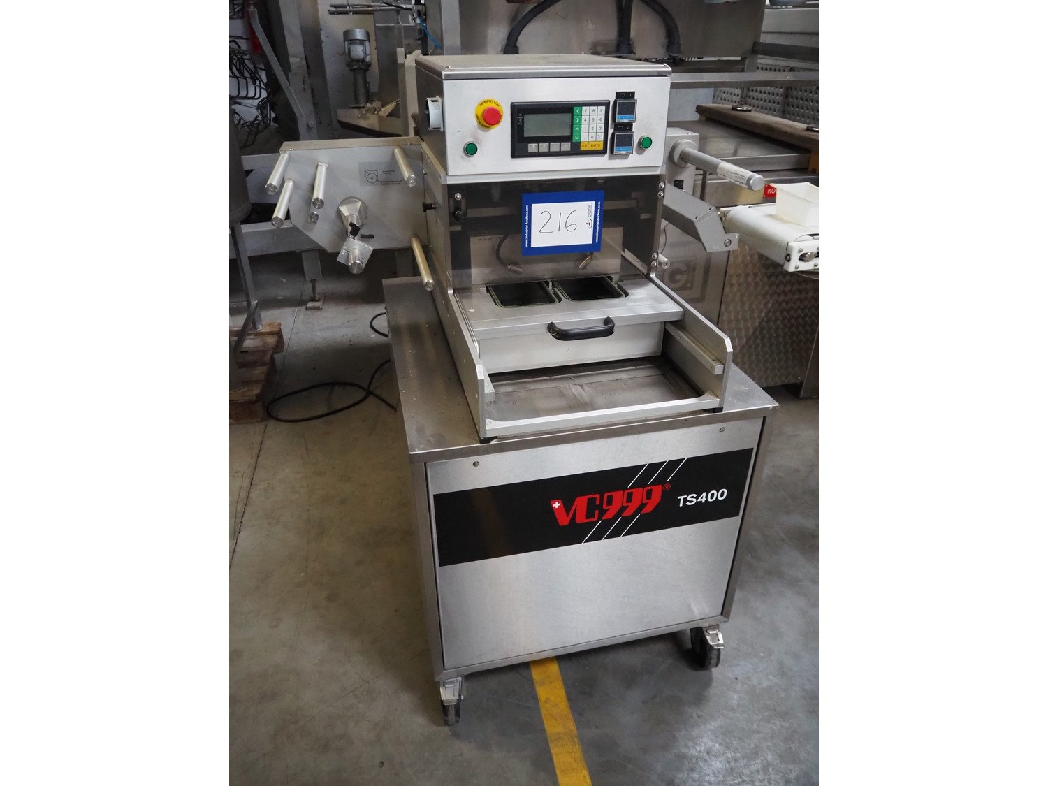 Inauen Maschinen AG mobile traysealer, type: VC999/TS 400, 400 V, 3 Ph, 50 Hz, 5 kW, 6 bar, dye: (2x) 215 mm x 130 mm, Rietschle vacuum pump, type: VCAH 100 (75), capacity: 100 m³ per hour, total dimensions: 1300 mm x 1000 mm x 1500 mm.