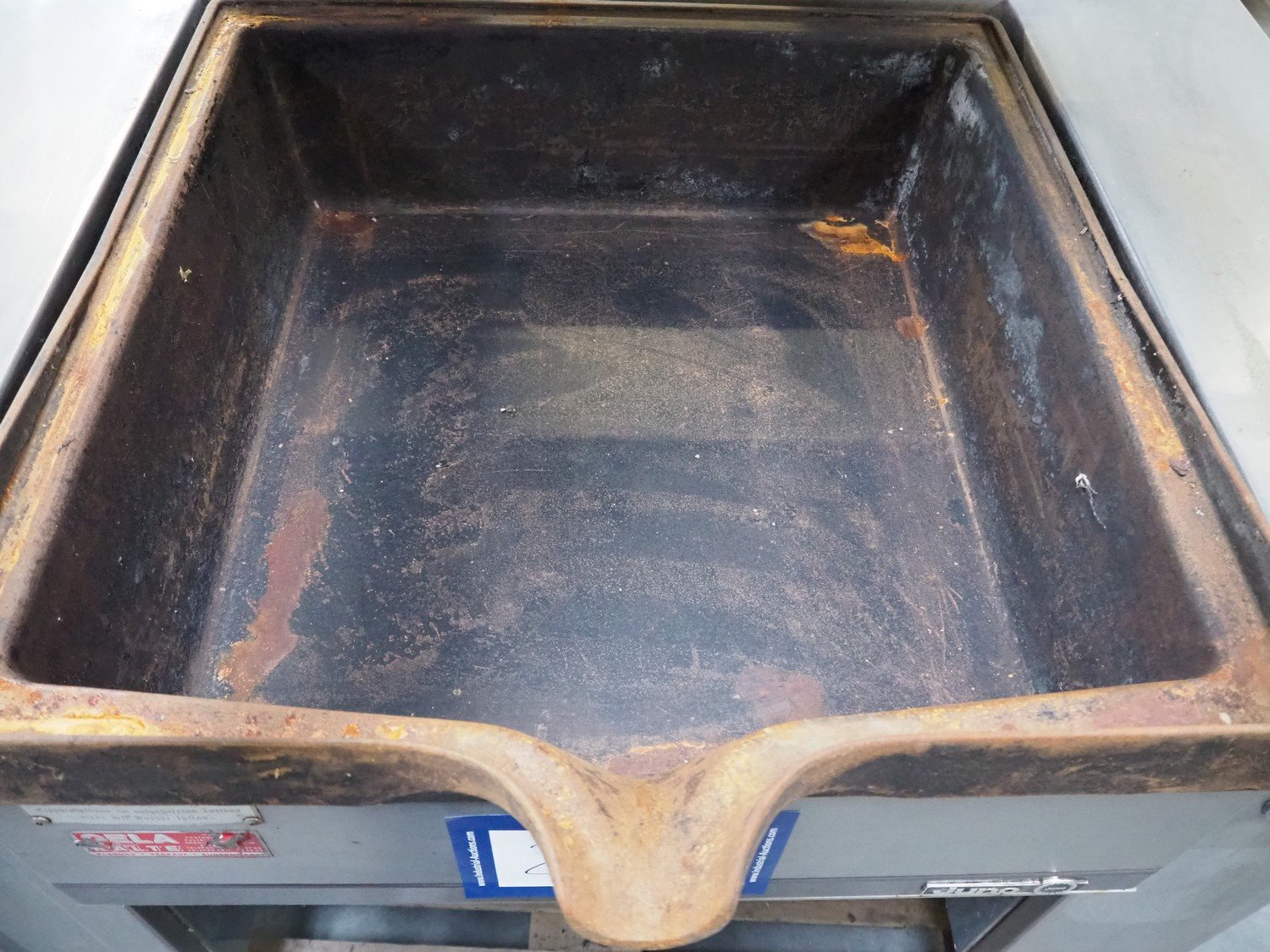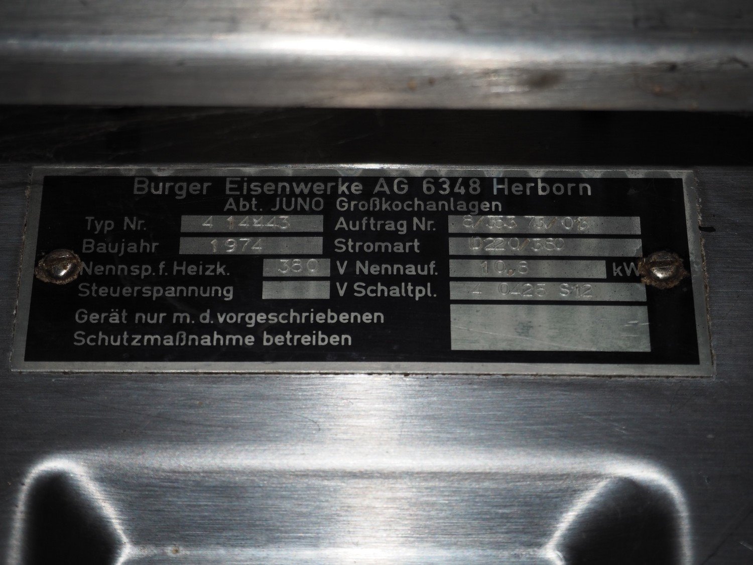 Juno roasting pan, type: 4 14443, year of construction: 1974, 380 V, inside dimensions: 660 mm x 660 mm x 180 mm, total dimensions: 1050 mm x 1000 mm x 1550 mm.