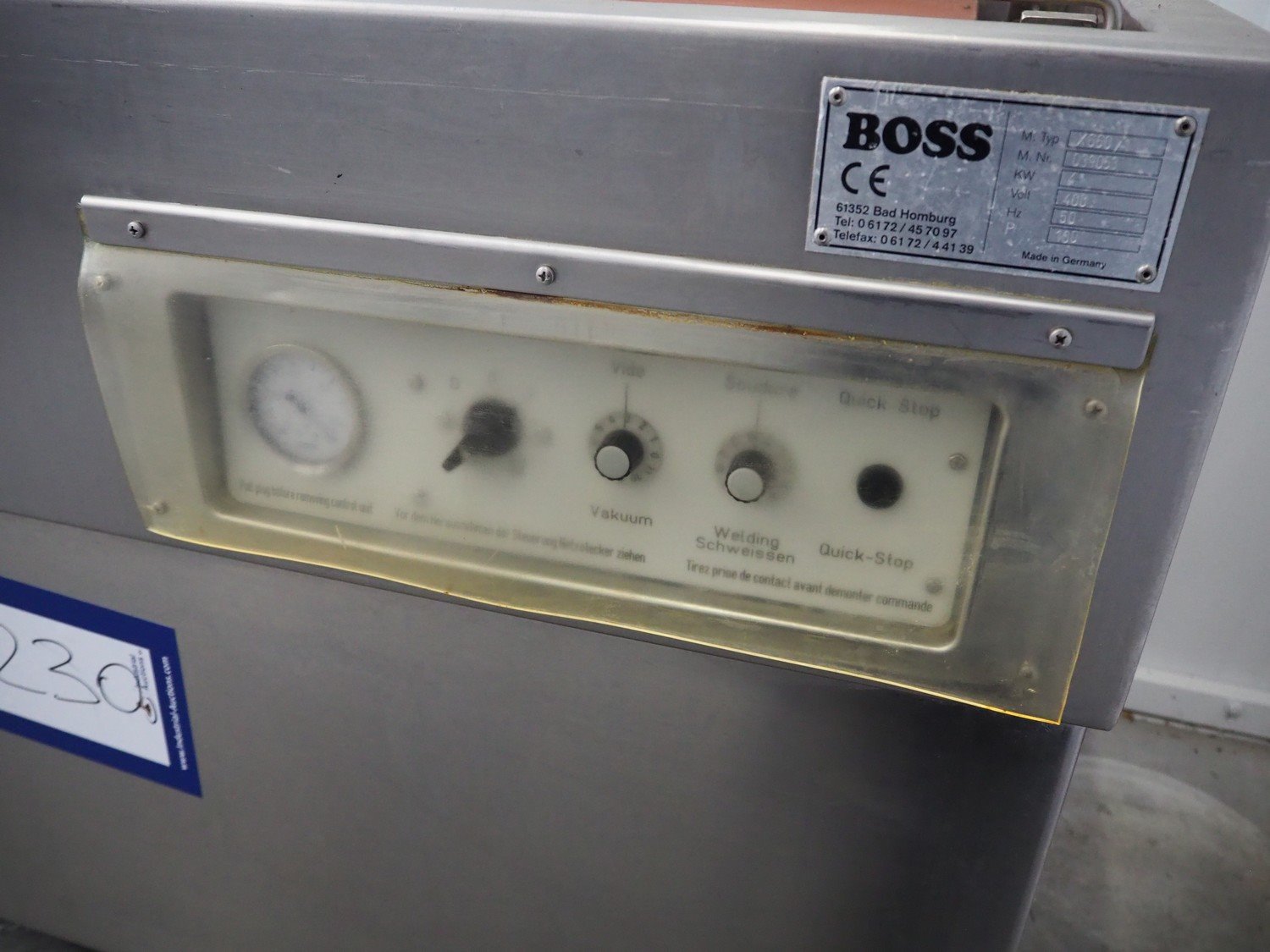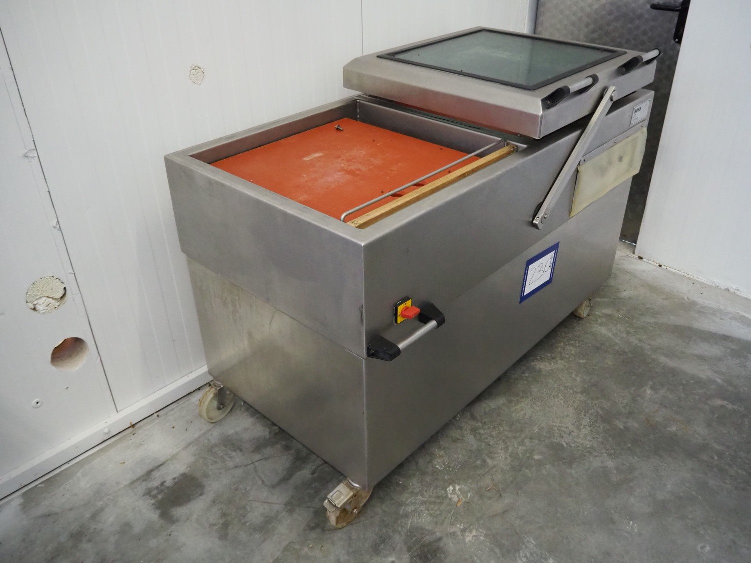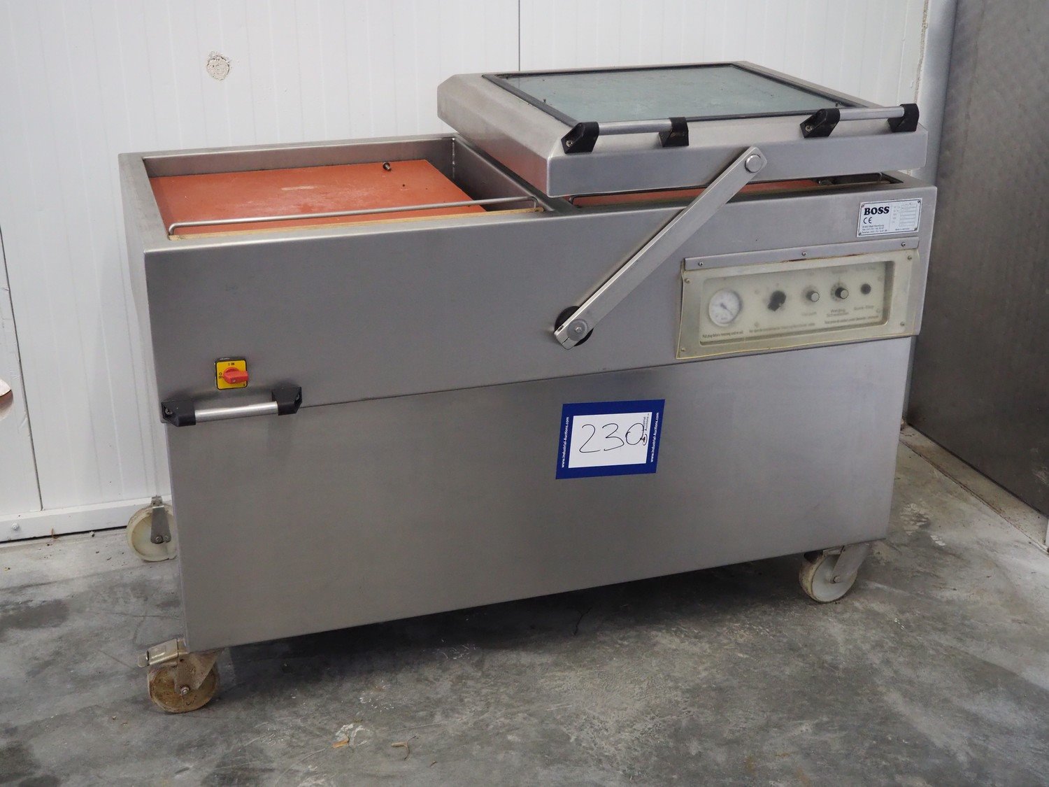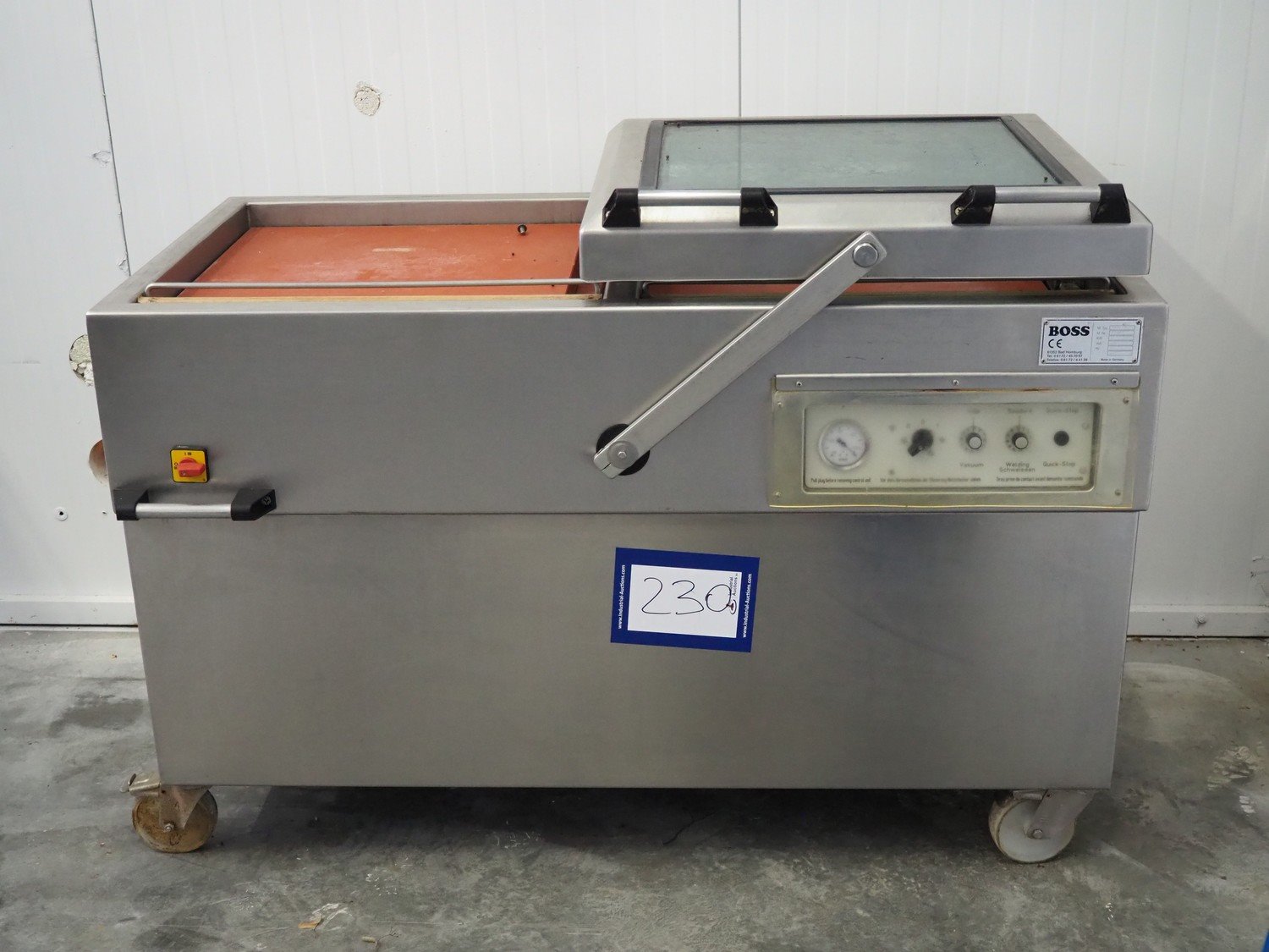Boss mobile double chamber vacuum machine, type: X660/1, machine number: 039053, 400 V, 50 Hz, 4 kW, seal length: (2x) 600 mm, dimensions chamber: (2x) 600 mm x 550 mm, Busch vacuum pump, type: RA 0100 E 503, capacity: 100 m³/h, total dimensions: 1400 mm x 850 mm x 1050 mm.