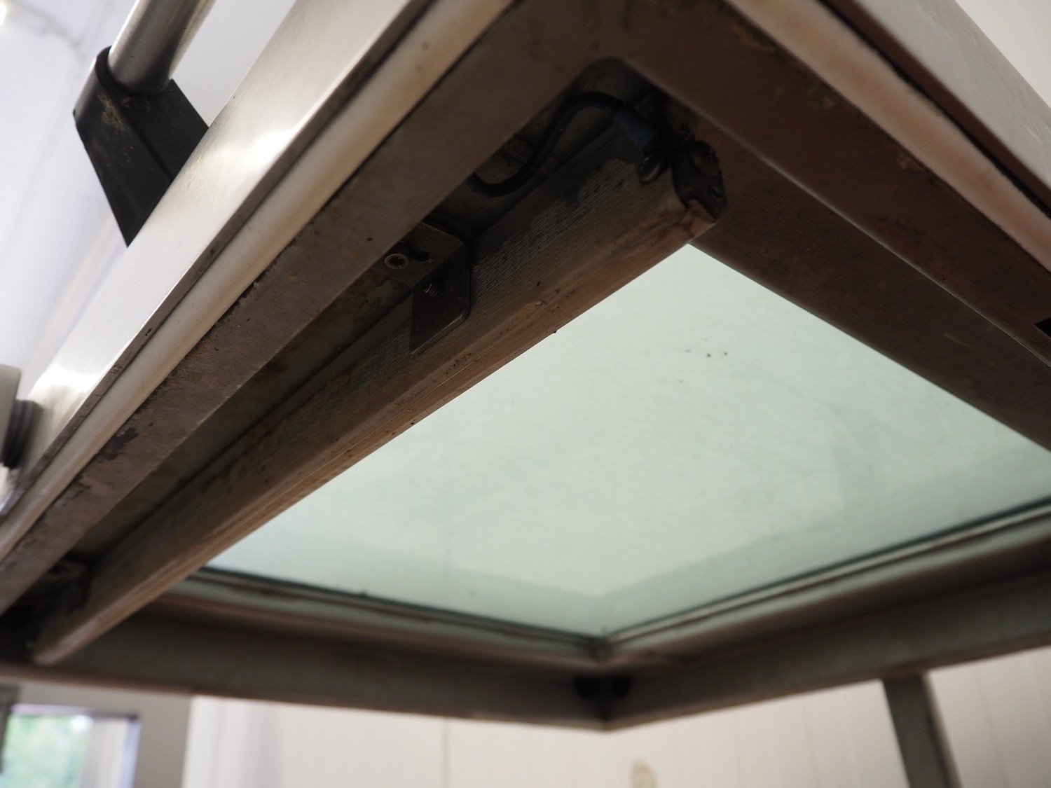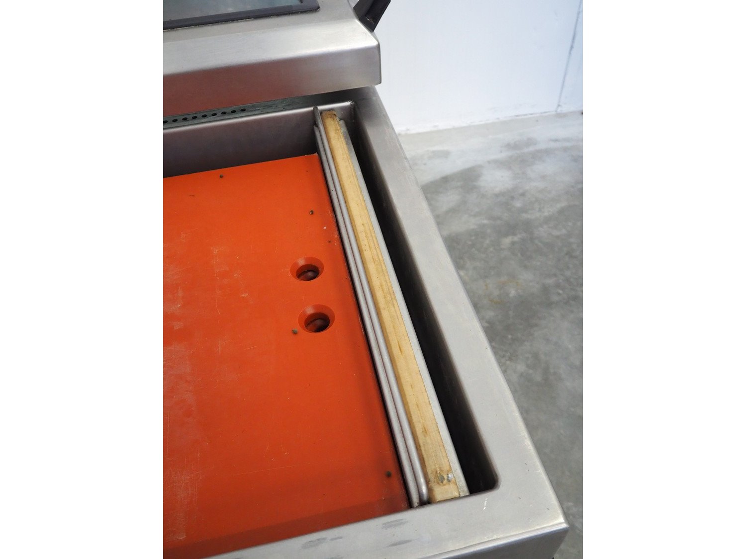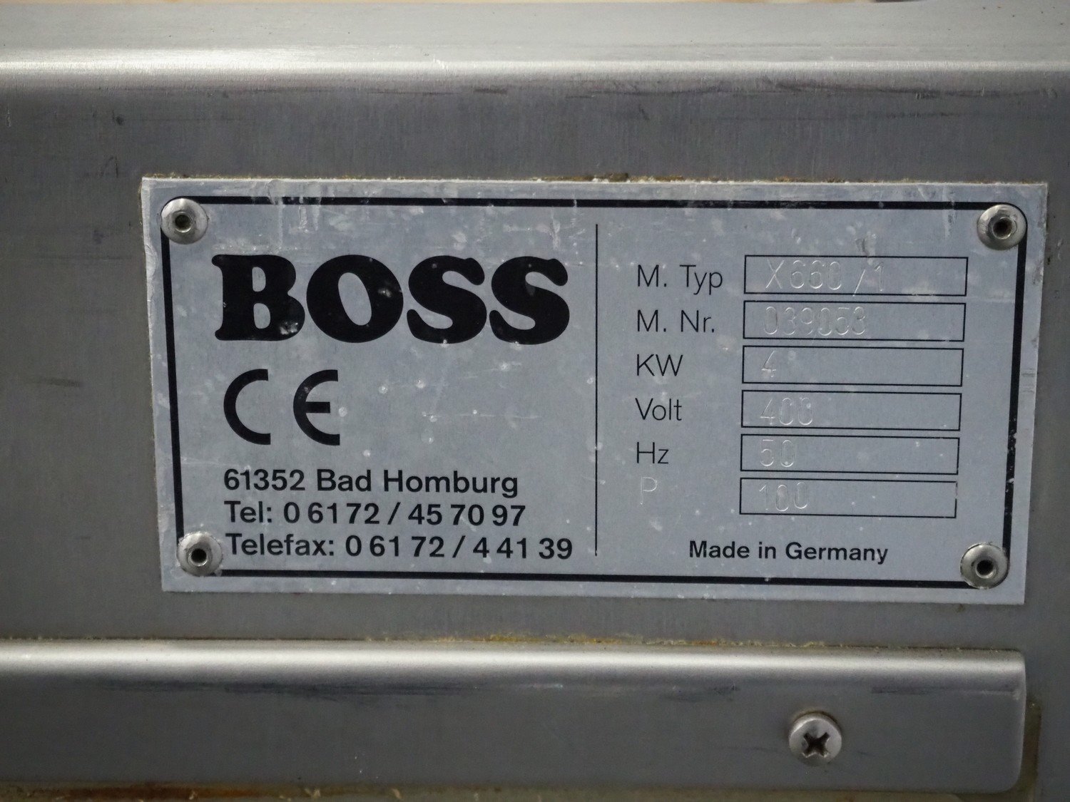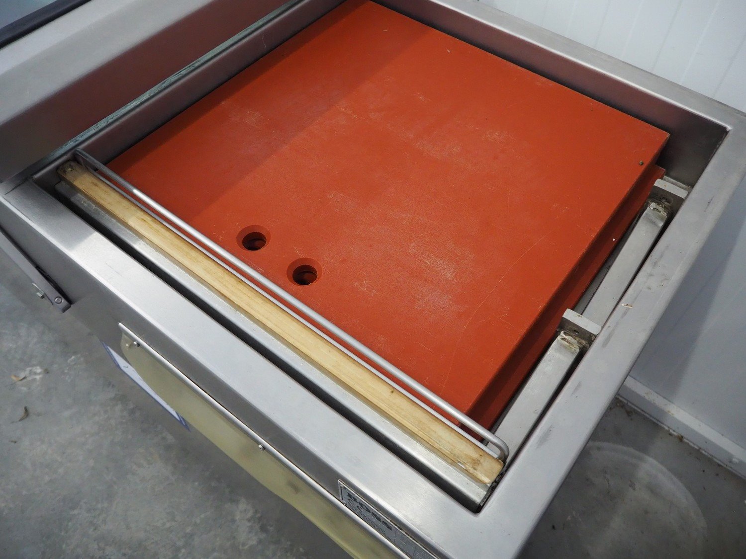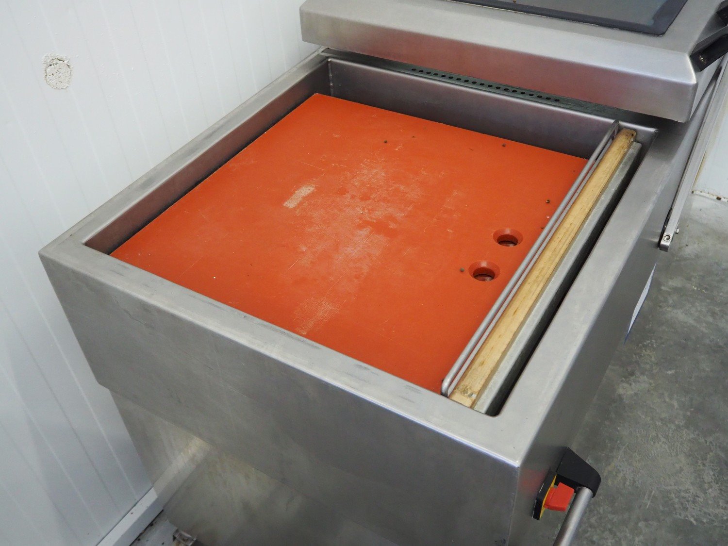 Boss mobile double chamber vacuum machine, type: X660/1, machine number: 039053, 400 V, 50 Hz, 4 kW, seal length: (2x) 600 mm, dimensions chamber: (2x) 600 mm x 550 mm, Busch vacuum pump, type: RA 0100 E 503, capacity: 100 m³/h, total dimensions: 1400 mm x 850 mm x 1050 mm.