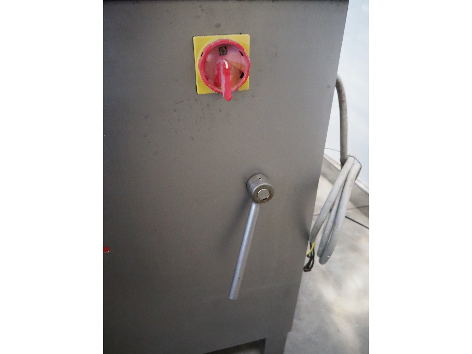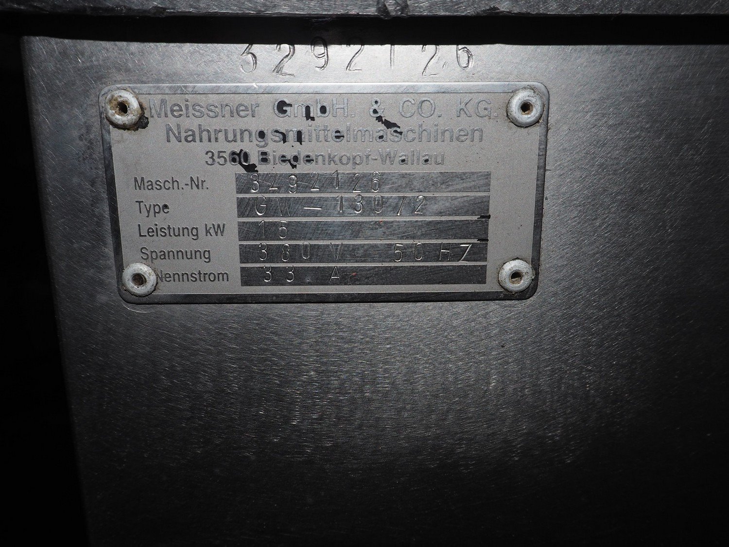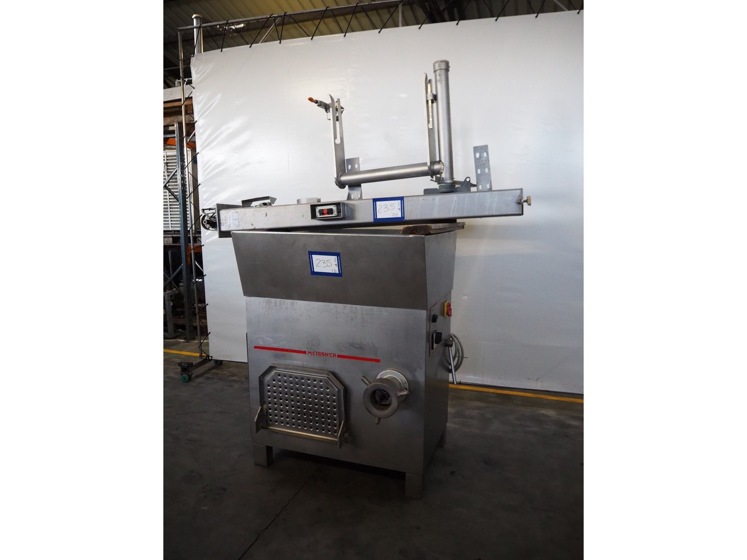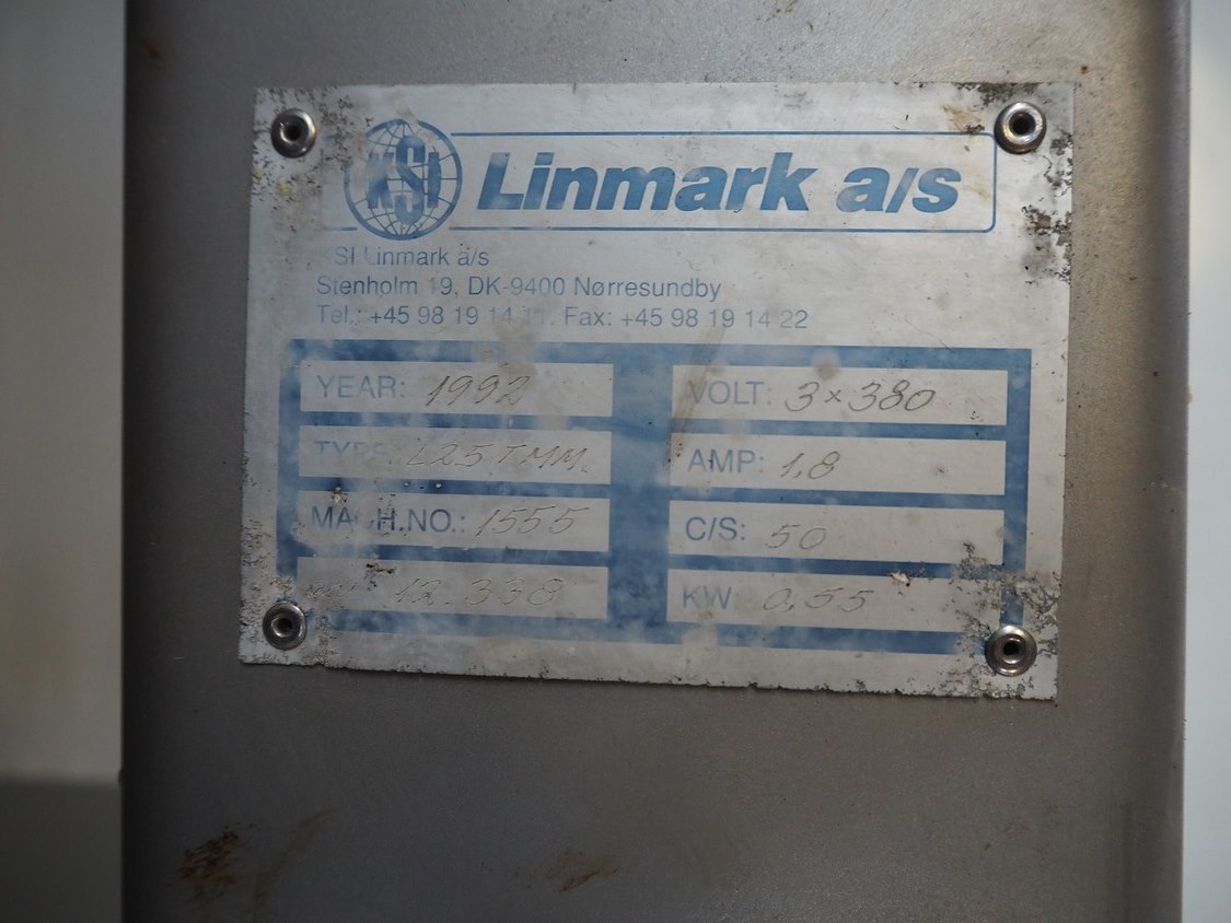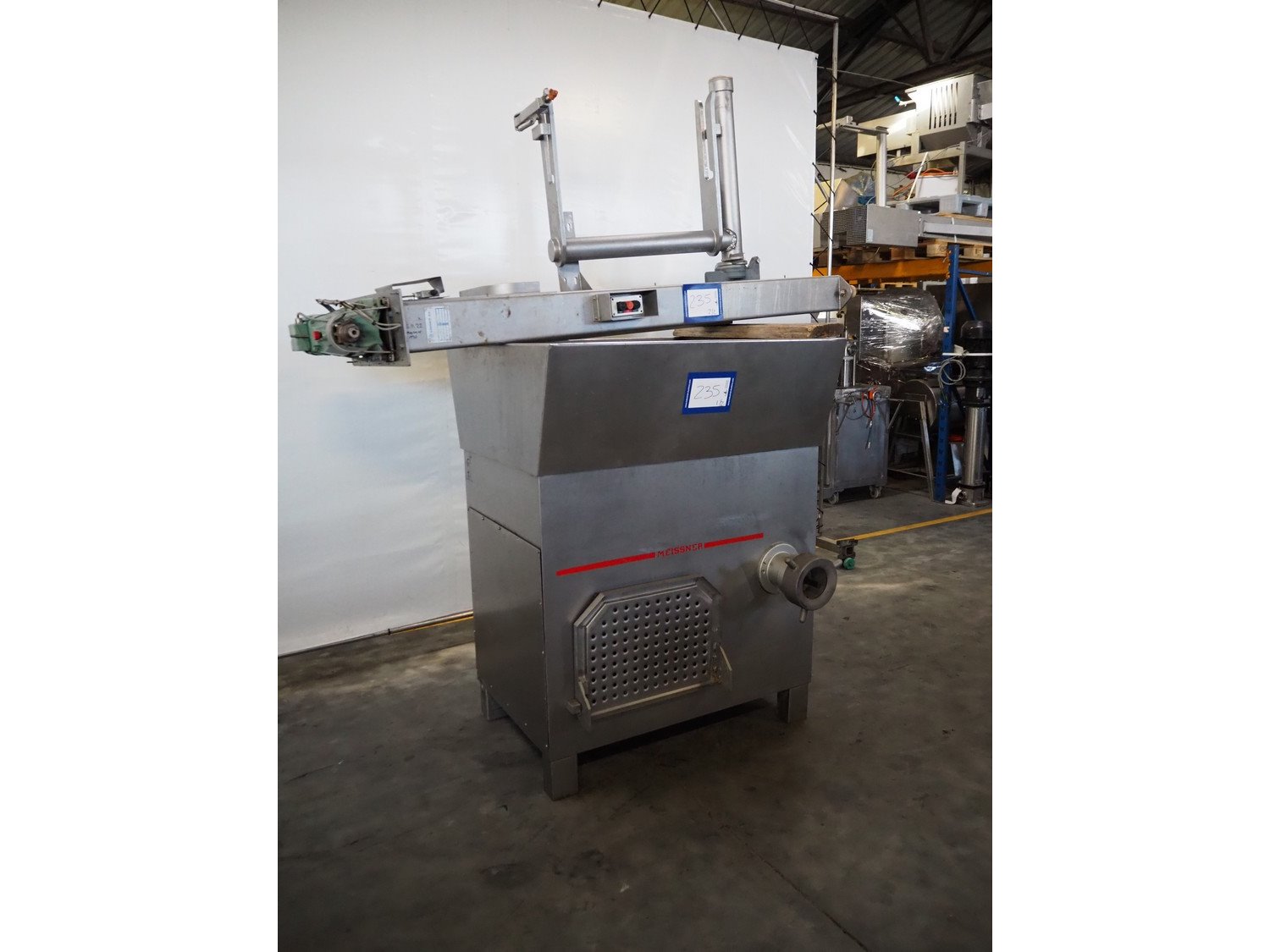 Meissner grinder with Linmark a/s lifter for 200 liter meat bins, type grinder: GW-130/2, number: 3292126, 380 V, 50 Hz, 33 A, 15 kW, plate diameter: 130 mm, total dimensions: 1250 mm x 980 mm x 1540 mm, type lifter: L25TMM, number: 1555, year of construction: 1992, 380 V, 3 Ph, 1.8 A, 0.55 kW, lifting height: 1500 mm, total dimensions: 2250 mm x 600 mm x 1000 mm.
