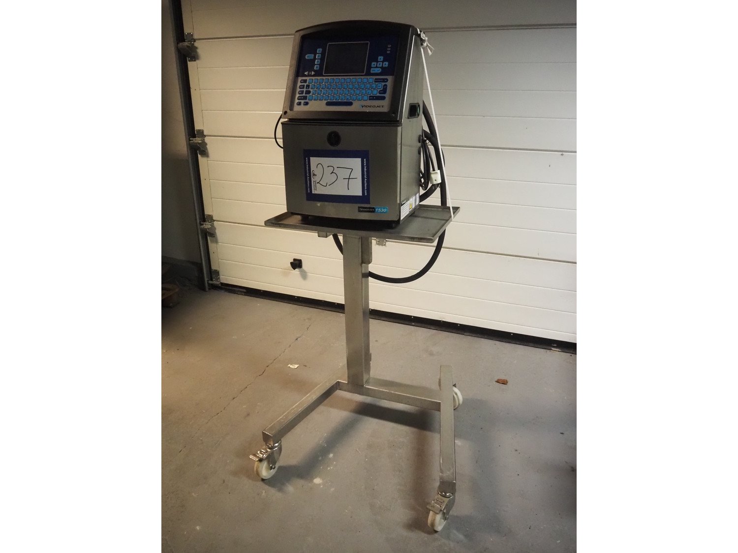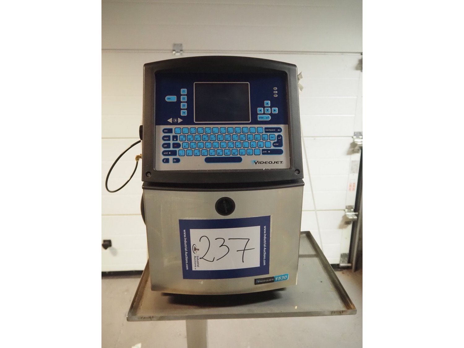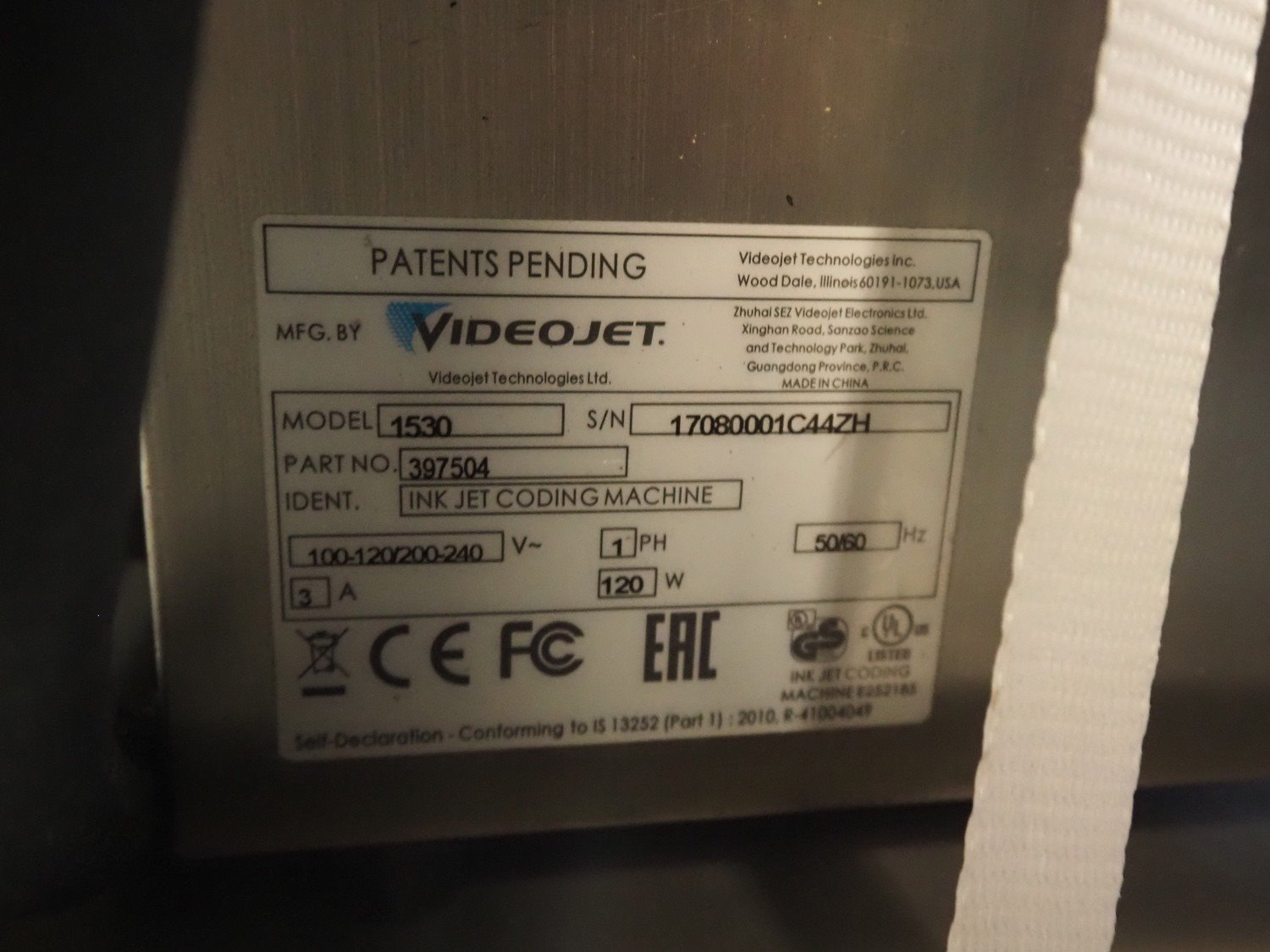 Videojet inkjet printer on s/s mobile frame, model: 1530, serial number: 1708001C44ZH, 100-120/200-240 V, 1 Ph, 50/60 Hz, 3 A, 120 W, dimensions: 700 mm x 700 mm x 1510 mm.
