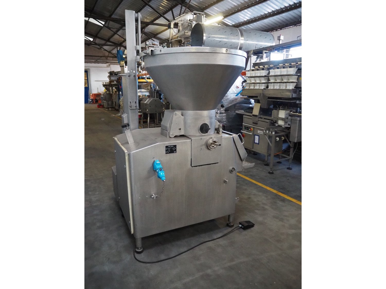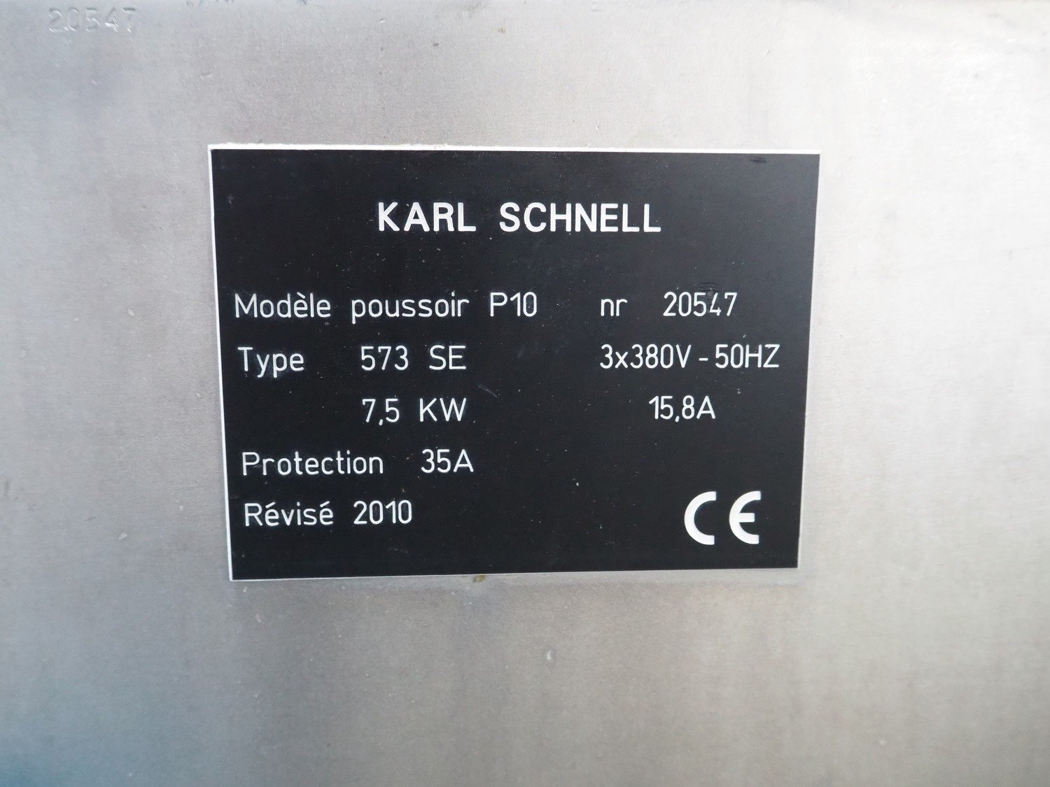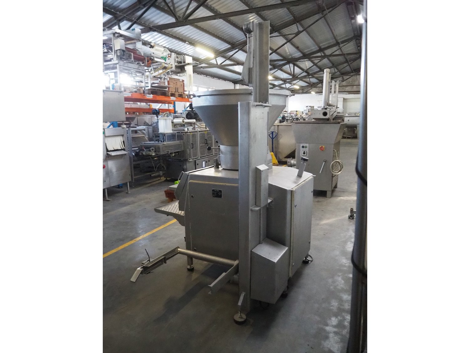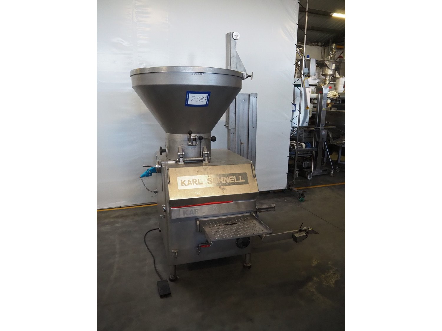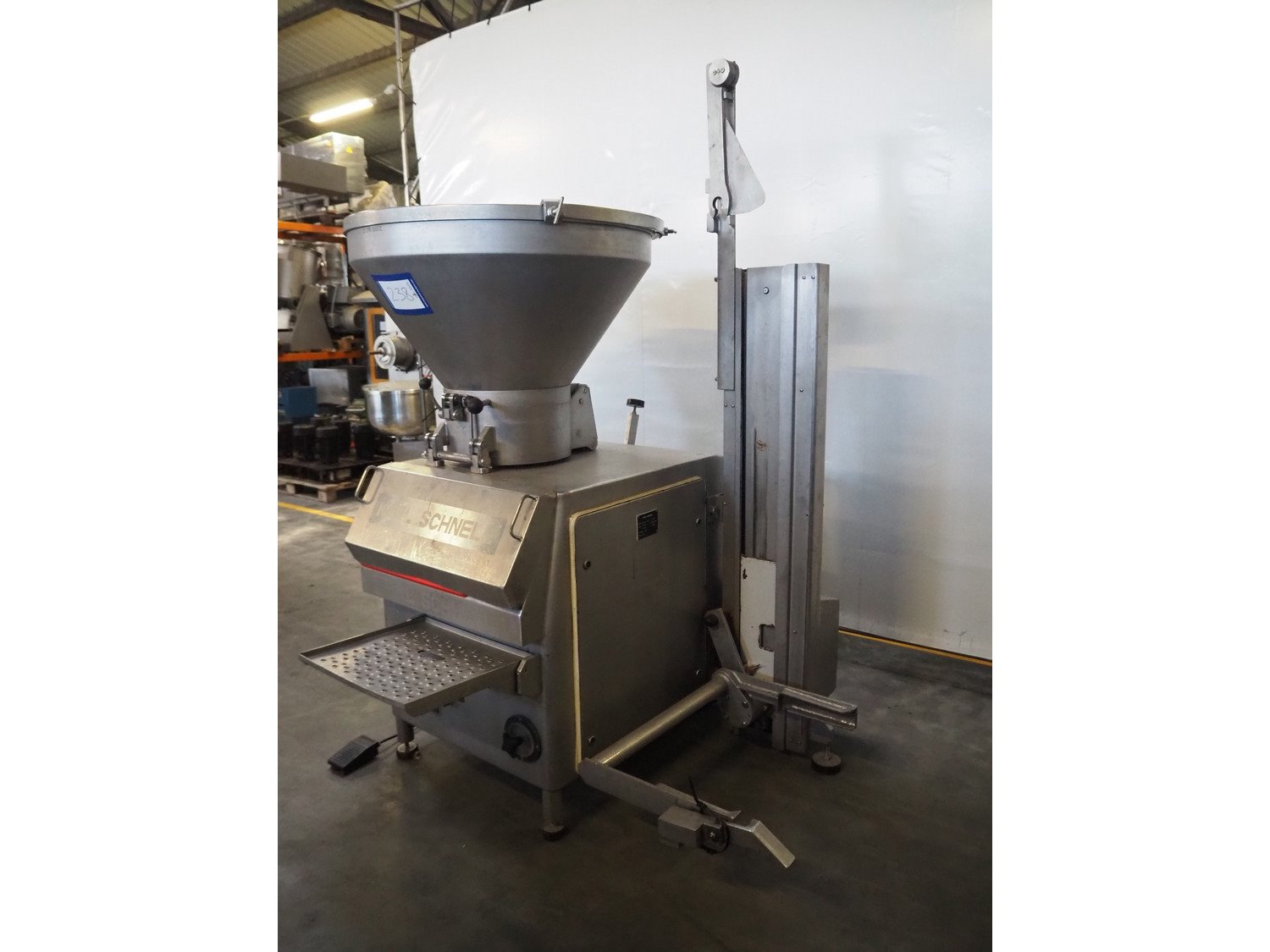 Karl Schnell vacuum filling machine with lifter for 200 liter meat bins, model: P10, type: 573 SE, number: 20547, 380 V, 3 Ph, 50 Hz, 15.8 A, 7.5 kW, Seevic vacuum pump, model: SV45FP, dimensions: 1800 mm x 1370 mm x 2400 mm. Including 3 crates with extra parts.
