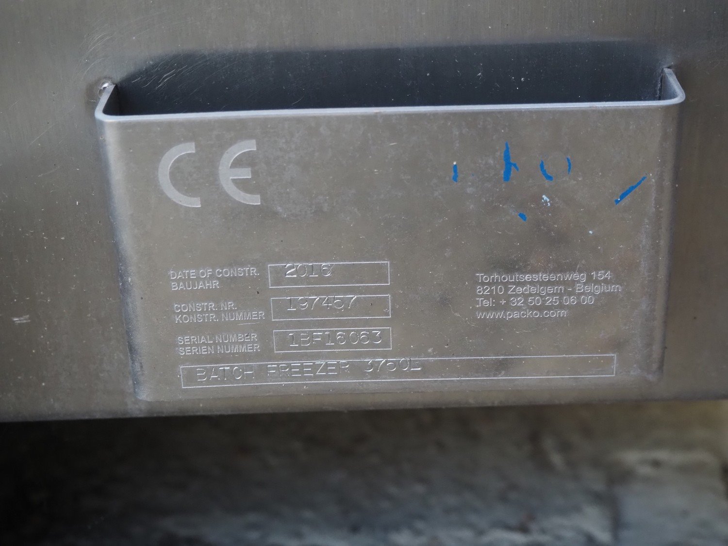 Packo blast chiller, model: Batch Freezer 3750L, serial number: 1BF16063, year of construction: 2016, inside dimensions: 1350 mm x 1250 mm x 2150 mm. Missing fan, without cooling compressor.