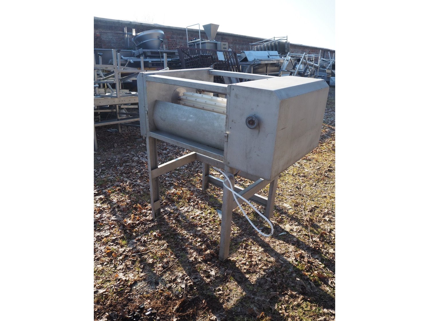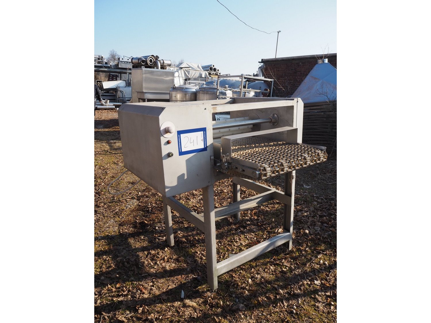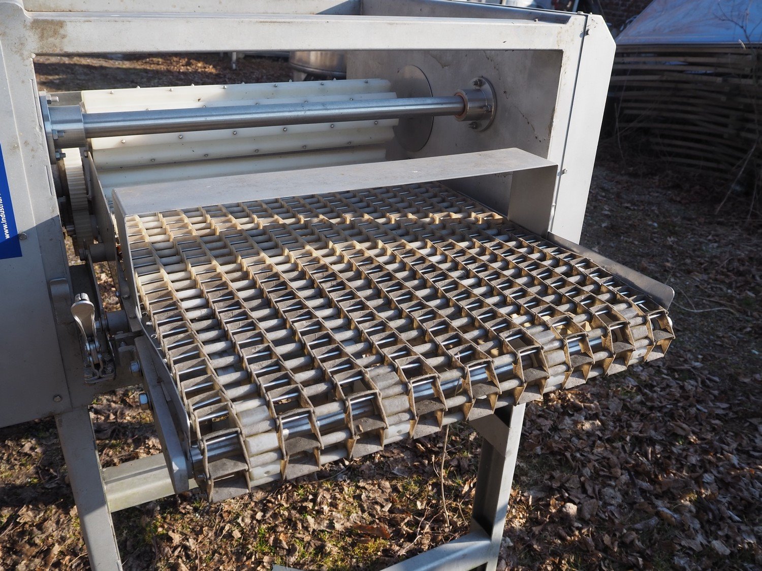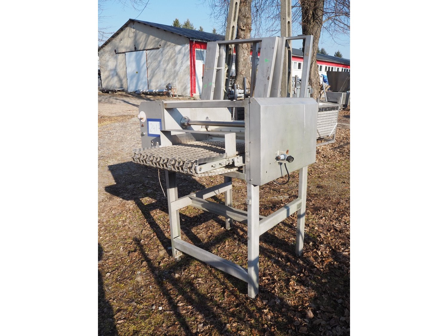 Flattener, machine number: -28, year of construction: 1988, 380 V, 50 Hz, 16 A, plastic mesh belt, working width: 600 mm, total dimensions: 1200 mm x 1160 mm x 1360 mm.