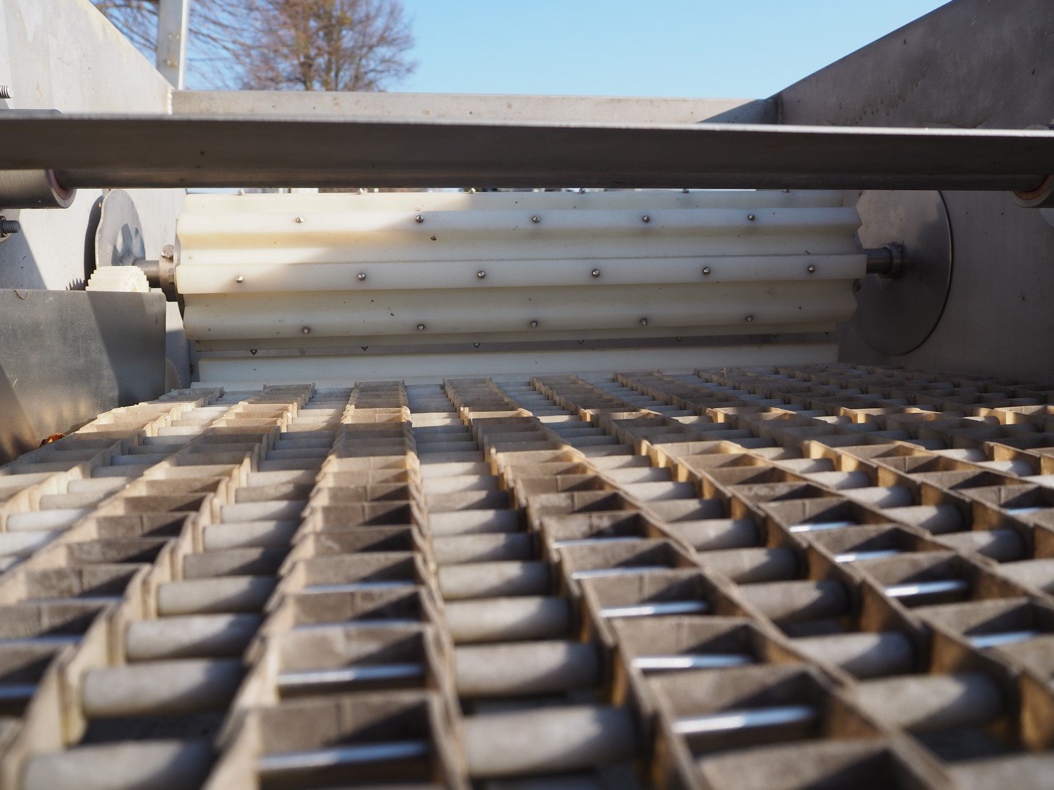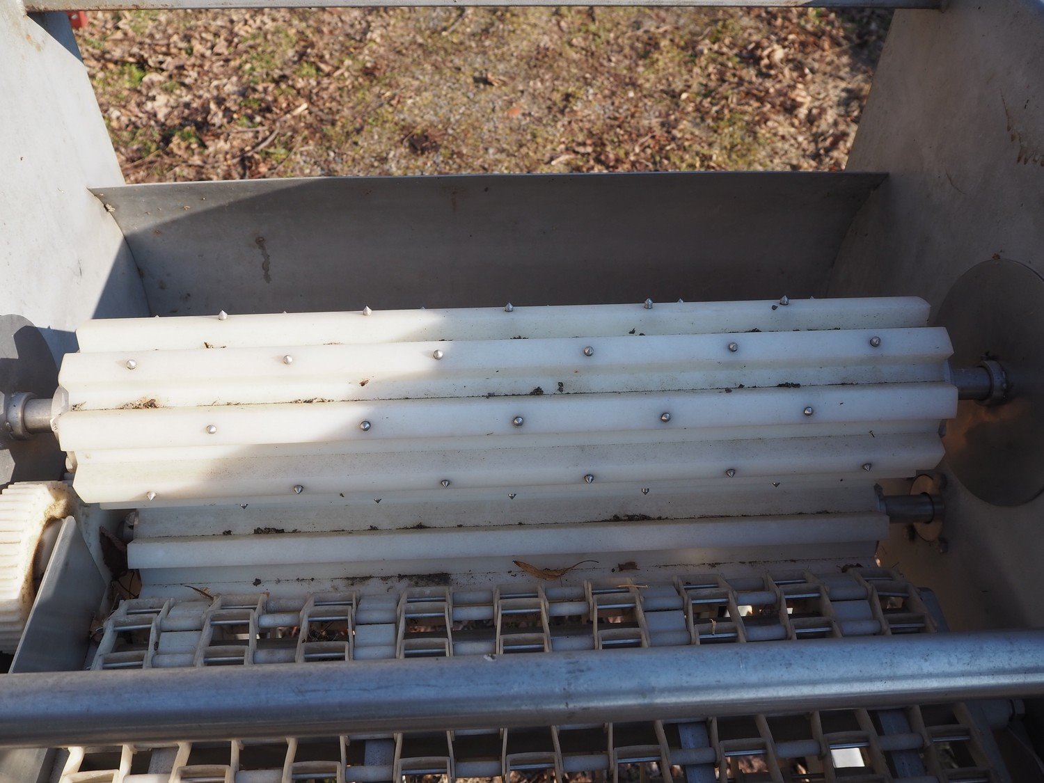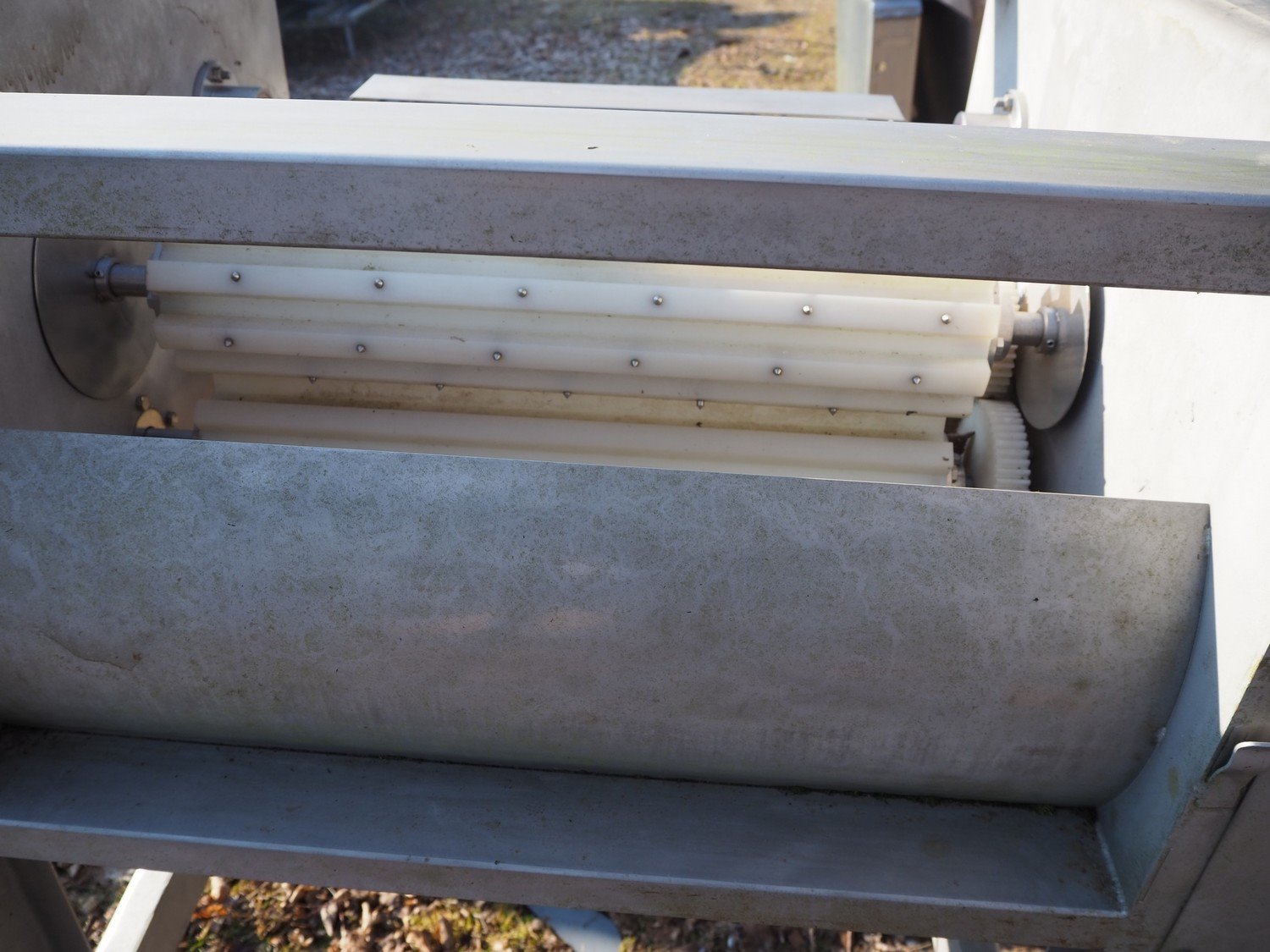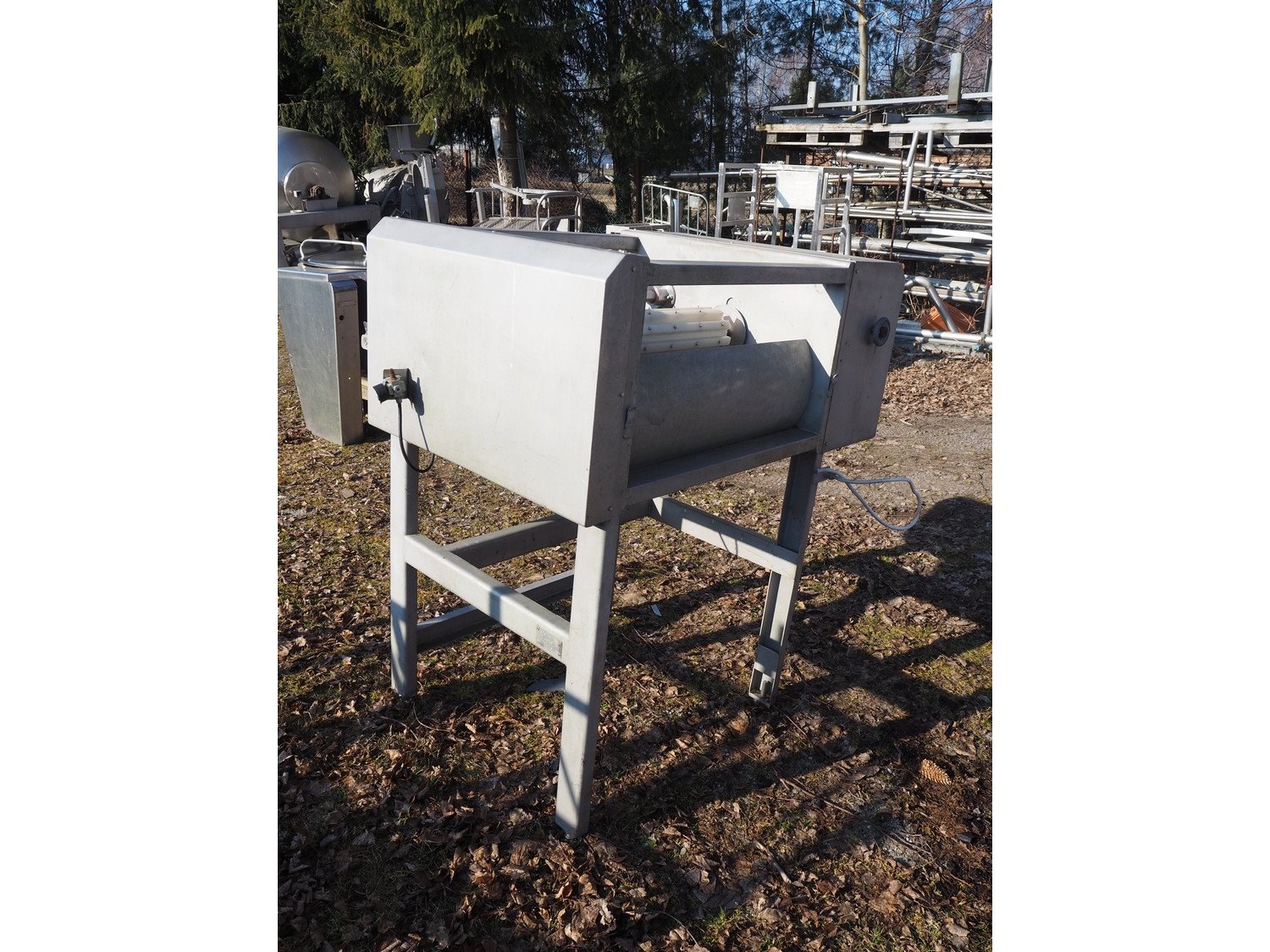 Flattener, machine number: -28, year of construction: 1988, 380 V, 50 Hz, 16 A, plastic mesh belt, working width: 600 mm, total dimensions: 1200 mm x 1160 mm x 1360 mm.