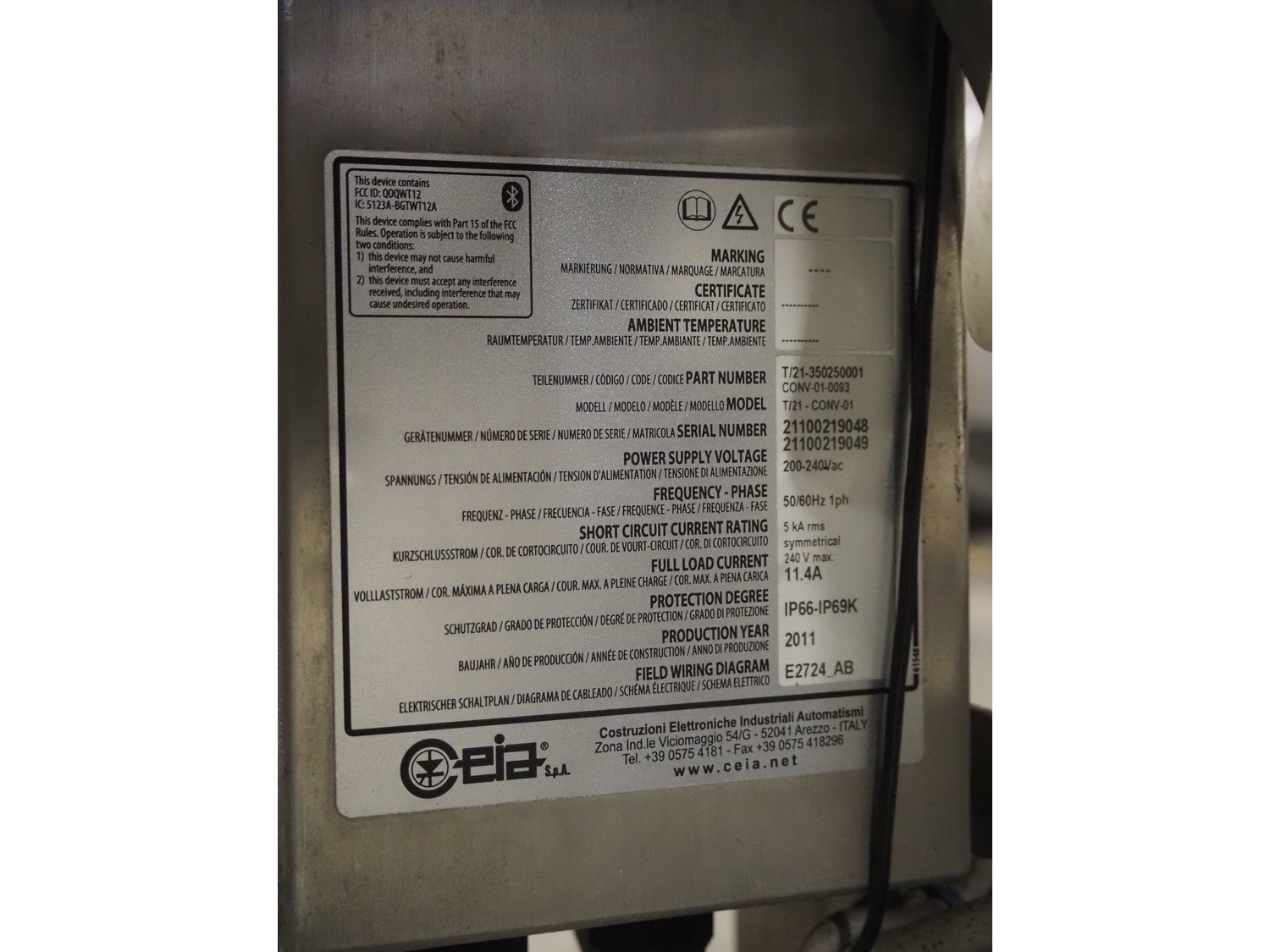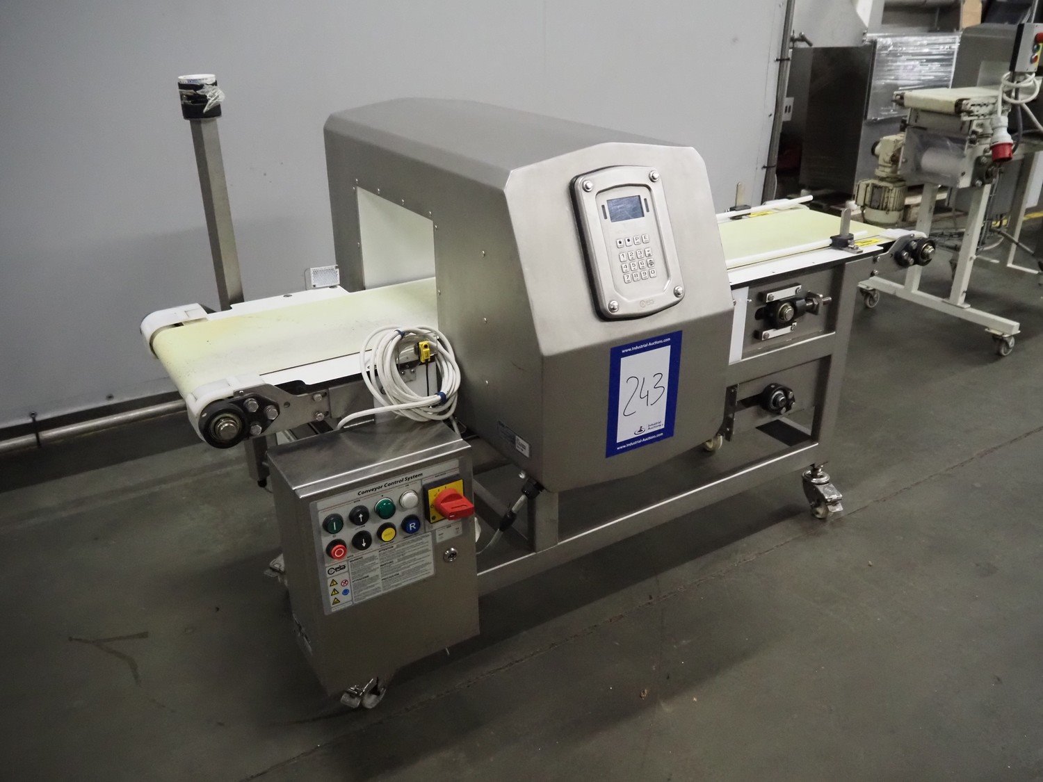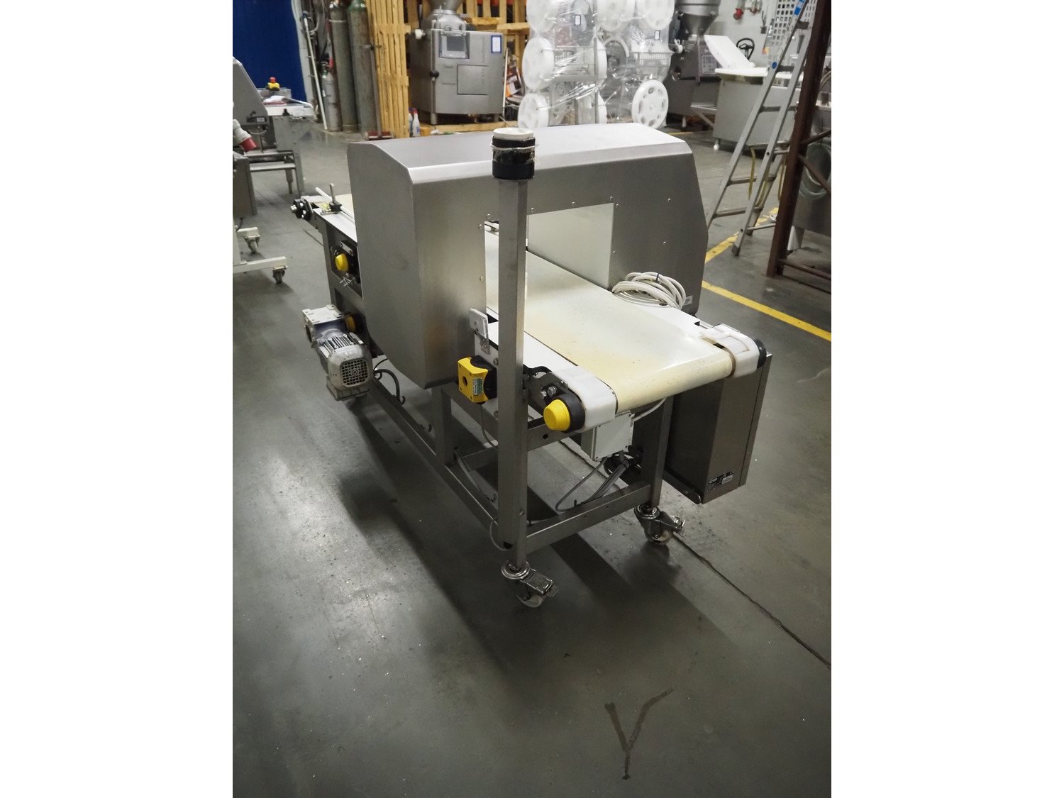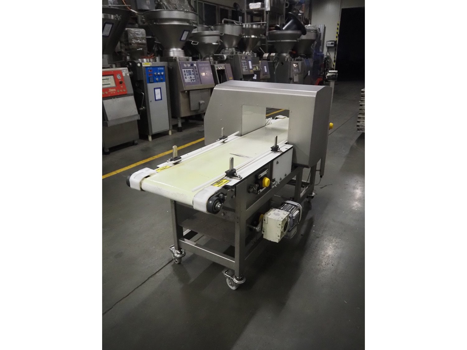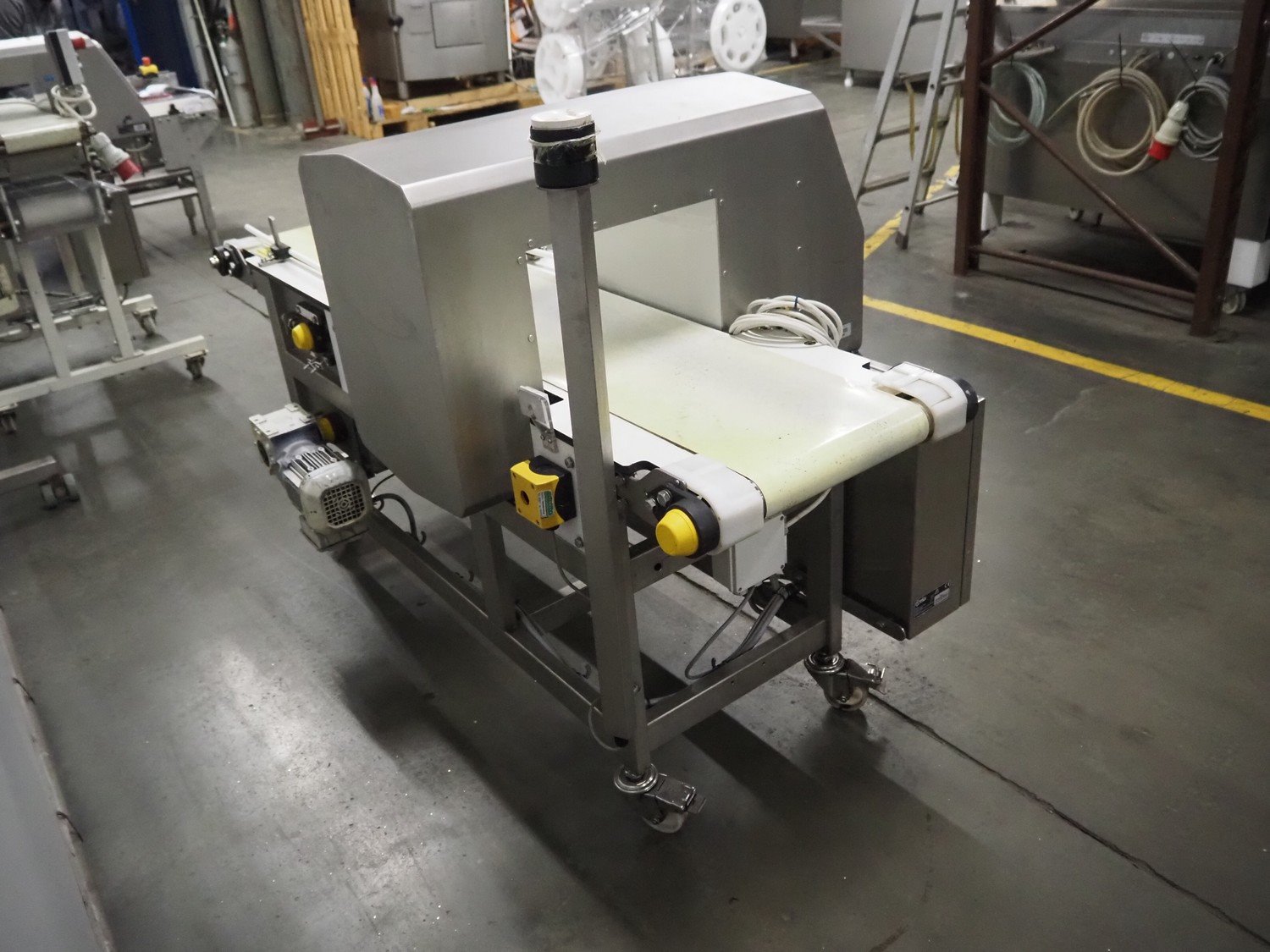 Ceia mobile metal detector, model: T/21, serial number: 21100219048, year of construction: 2011, 200-240 V, 1 Ph, 50/60 Hz, 11.4 A, plastic belt, belt width: 300 mm, clearance: 350 mm x 210 mm, total dimensions: 1820 mm x 850 mm x 1130 mm.