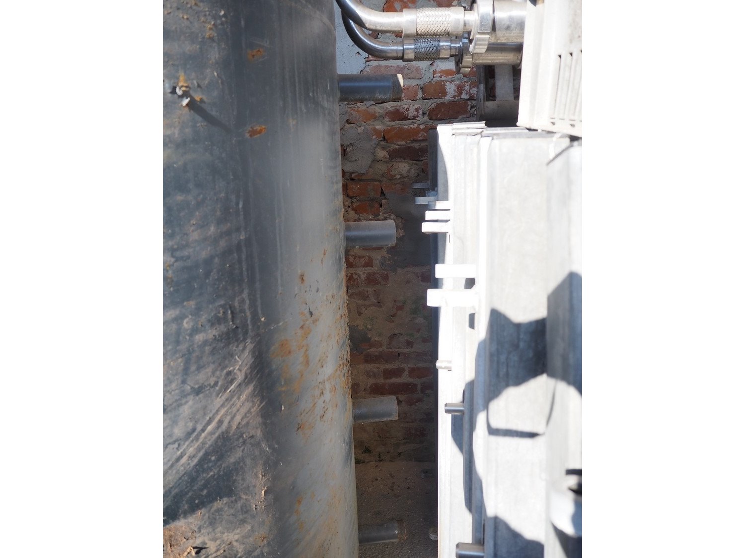 Steel heat exchanger, dimensions: 1500 mm x 1500 mm x 2800 mm.
