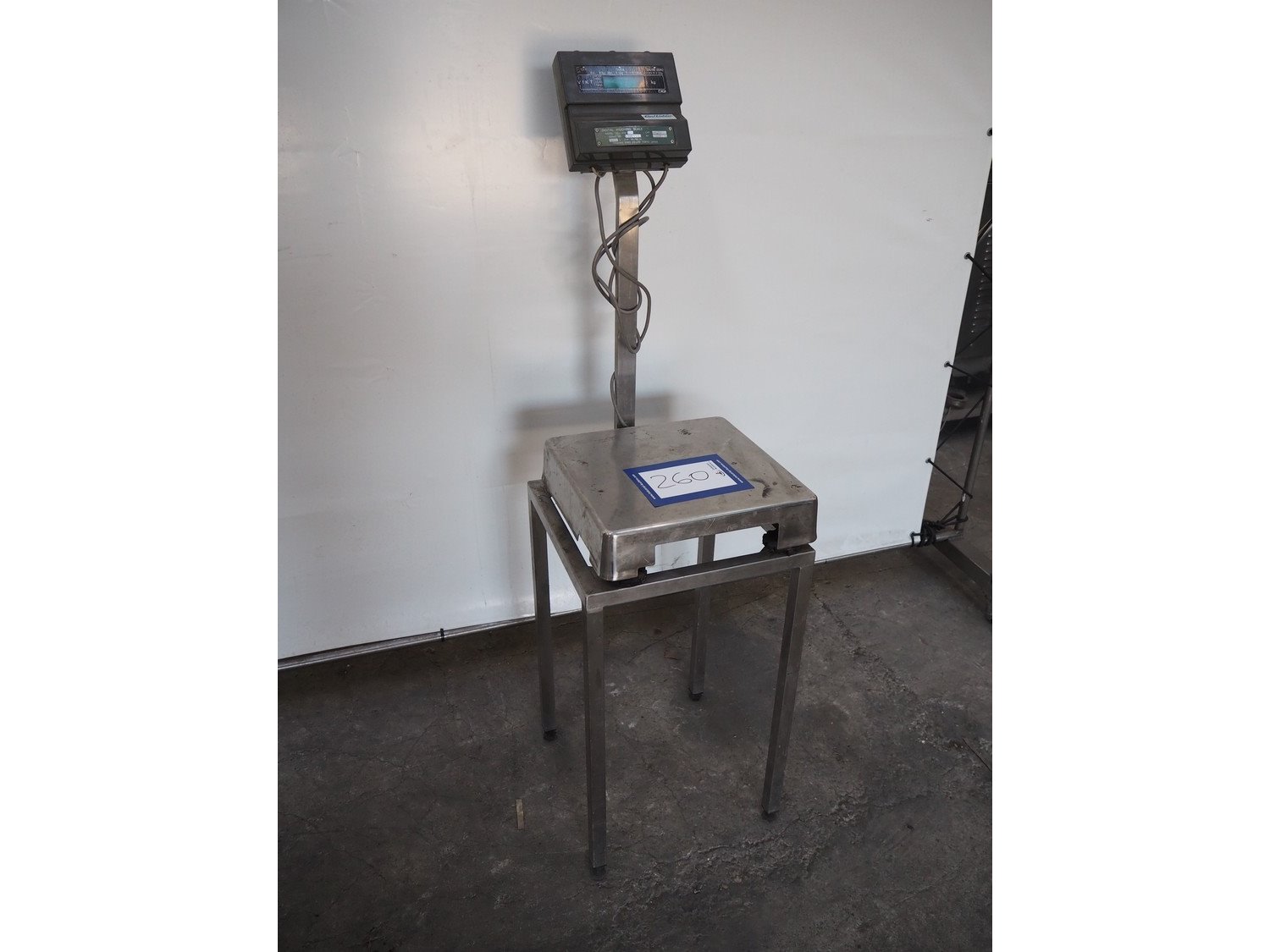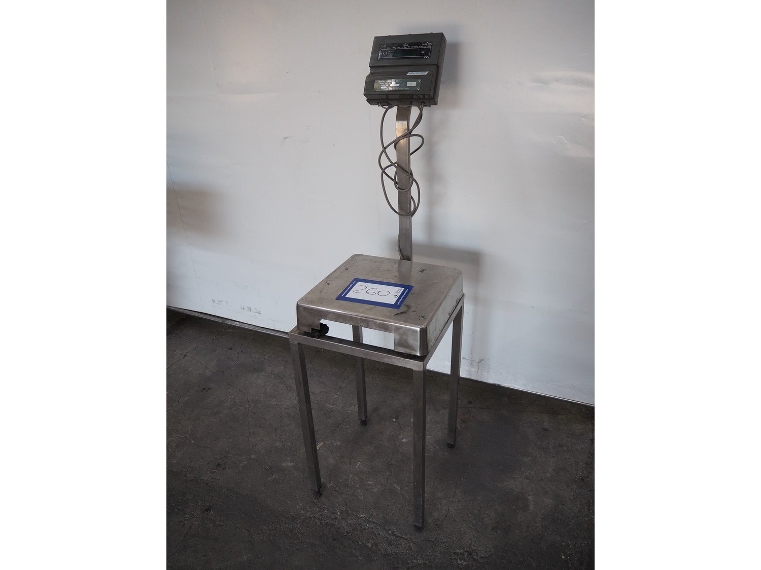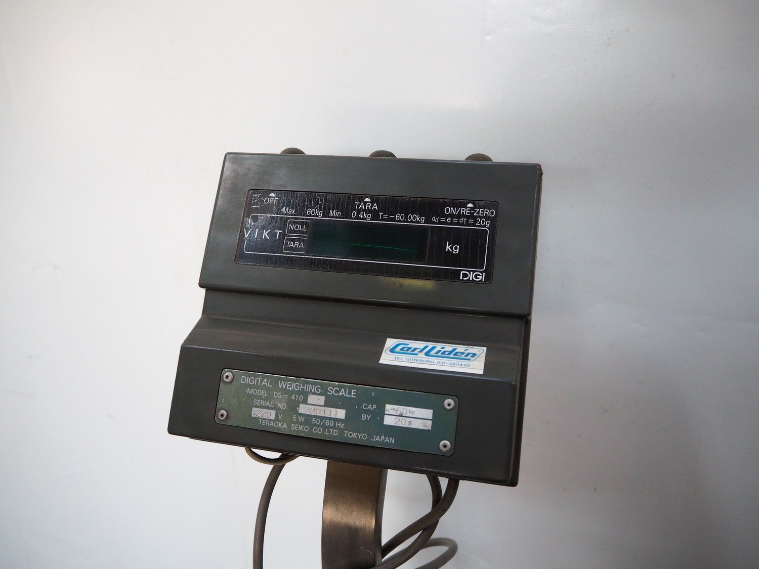 Teraoka Seiko Co, Ltd. weighing scale, model: DS-410, serial number: 306111, 220 V, 50/60 Hz, 5 kW, maximum capacity: 60 kg, minimum capacity: 0.4 kg, T= 60.00 kg, dimensions scale: 400 mm x 400 mm, total dimensions: 450 mm x 420 mm x 1550 mm.