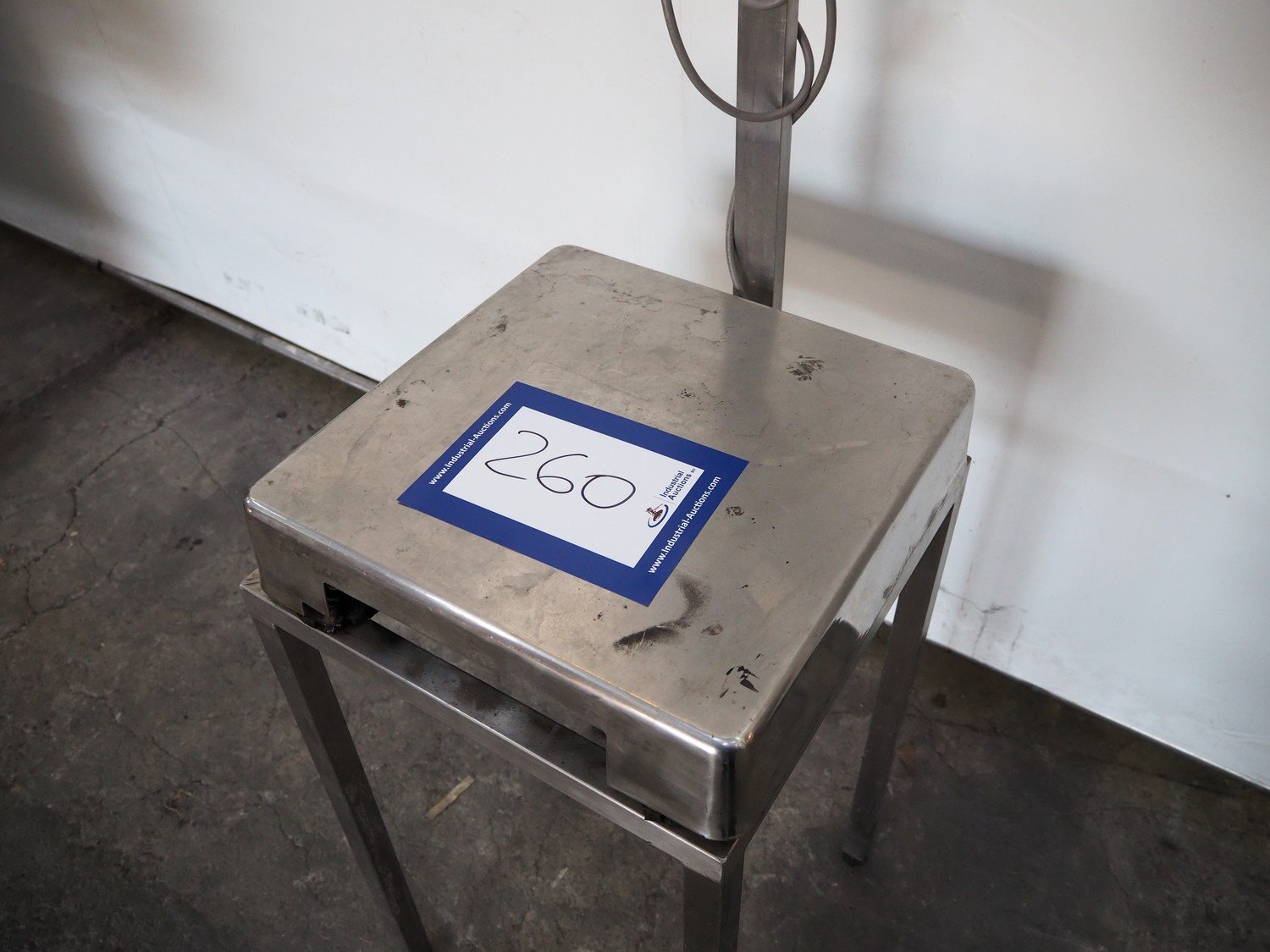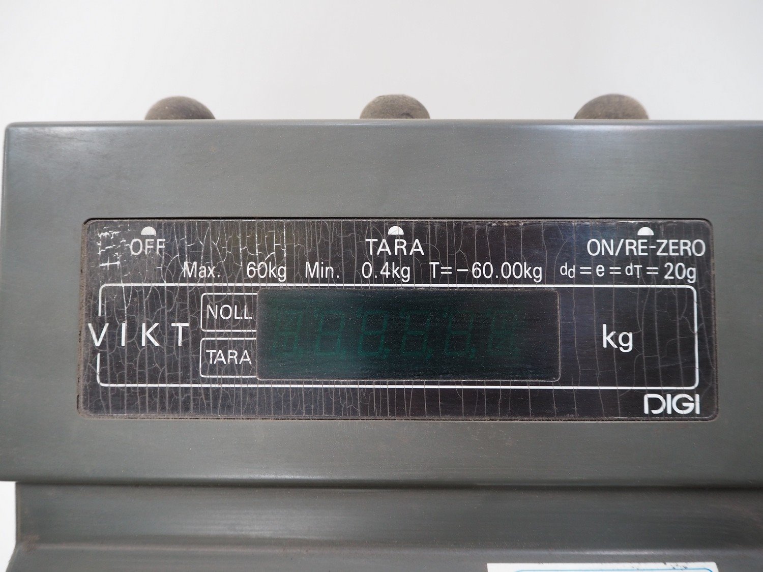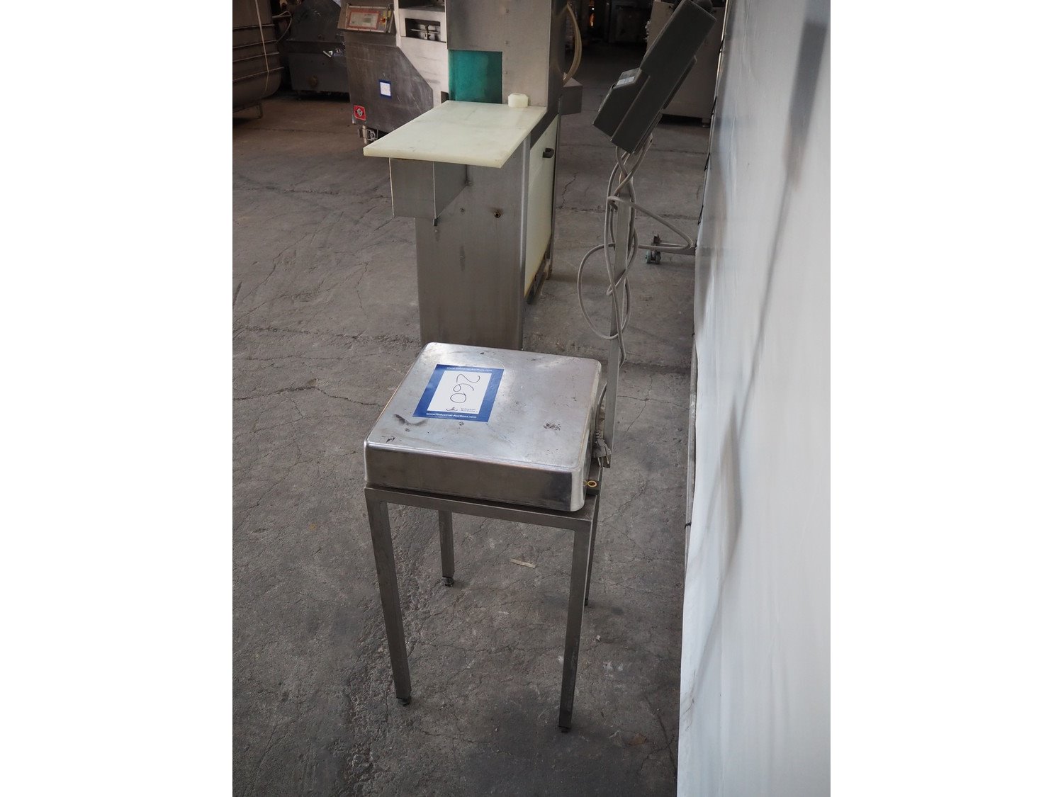 Teraoka Seiko Co, Ltd. weighing scale, model: DS-410, serial number: 306111, 220 V, 50/60 Hz, 5 kW, maximum capacity: 60 kg, minimum capacity: 0.4 kg, T= 60.00 kg, dimensions scale: 400 mm x 400 mm, total dimensions: 450 mm x 420 mm x 1550 mm.