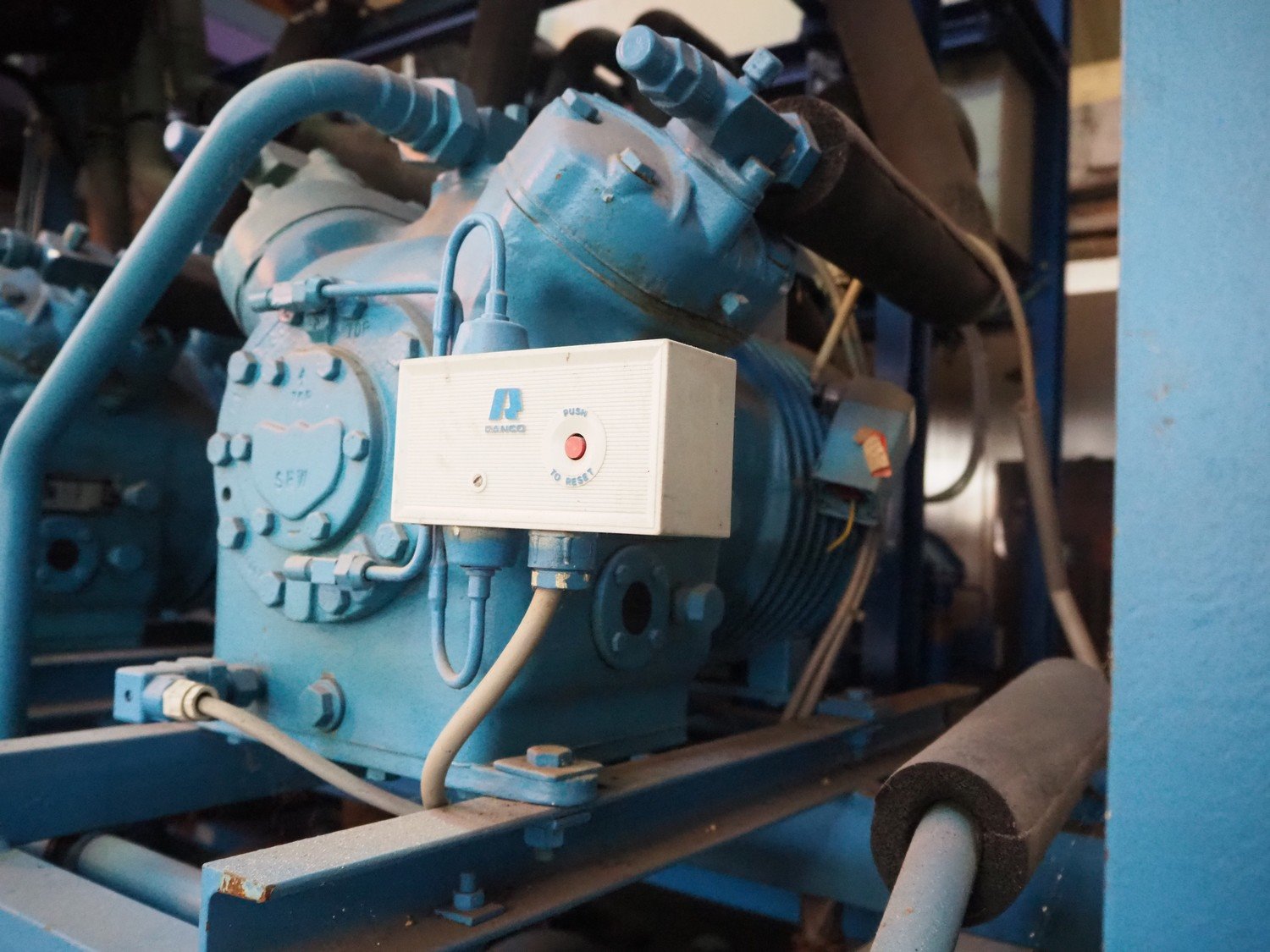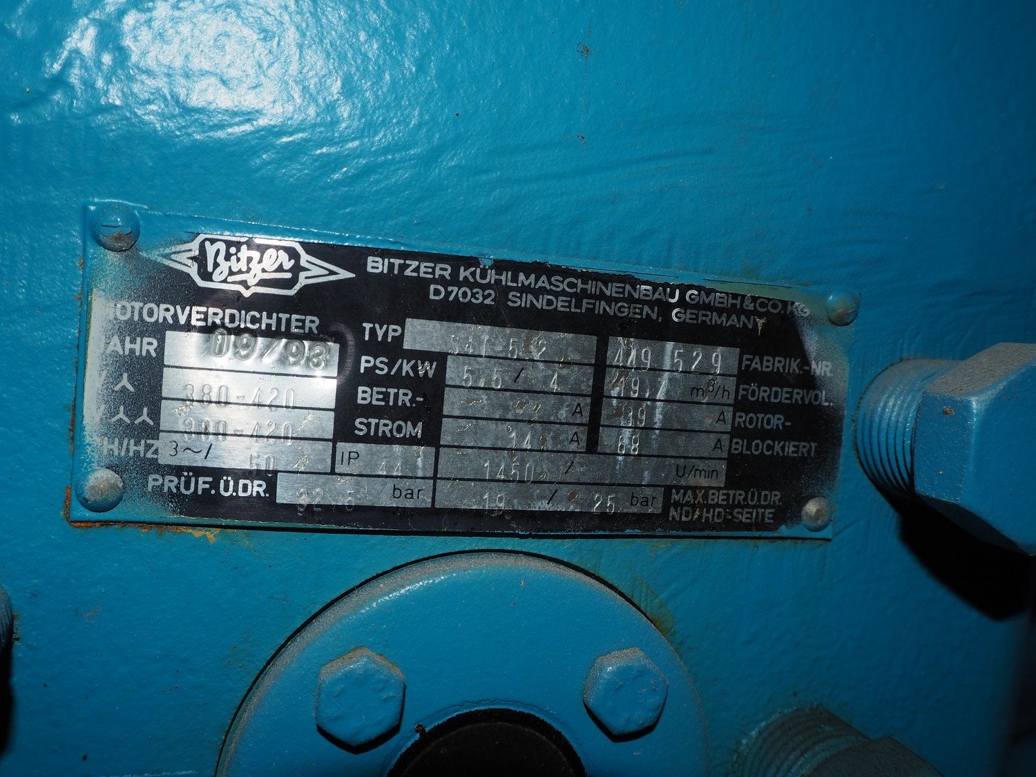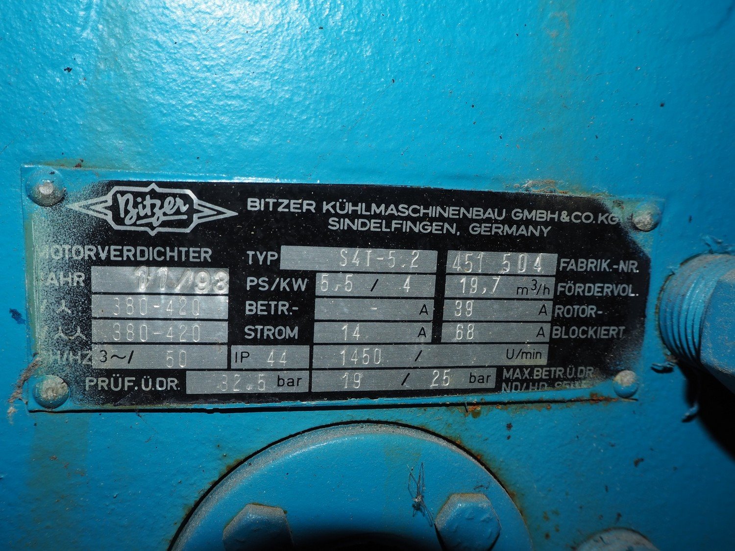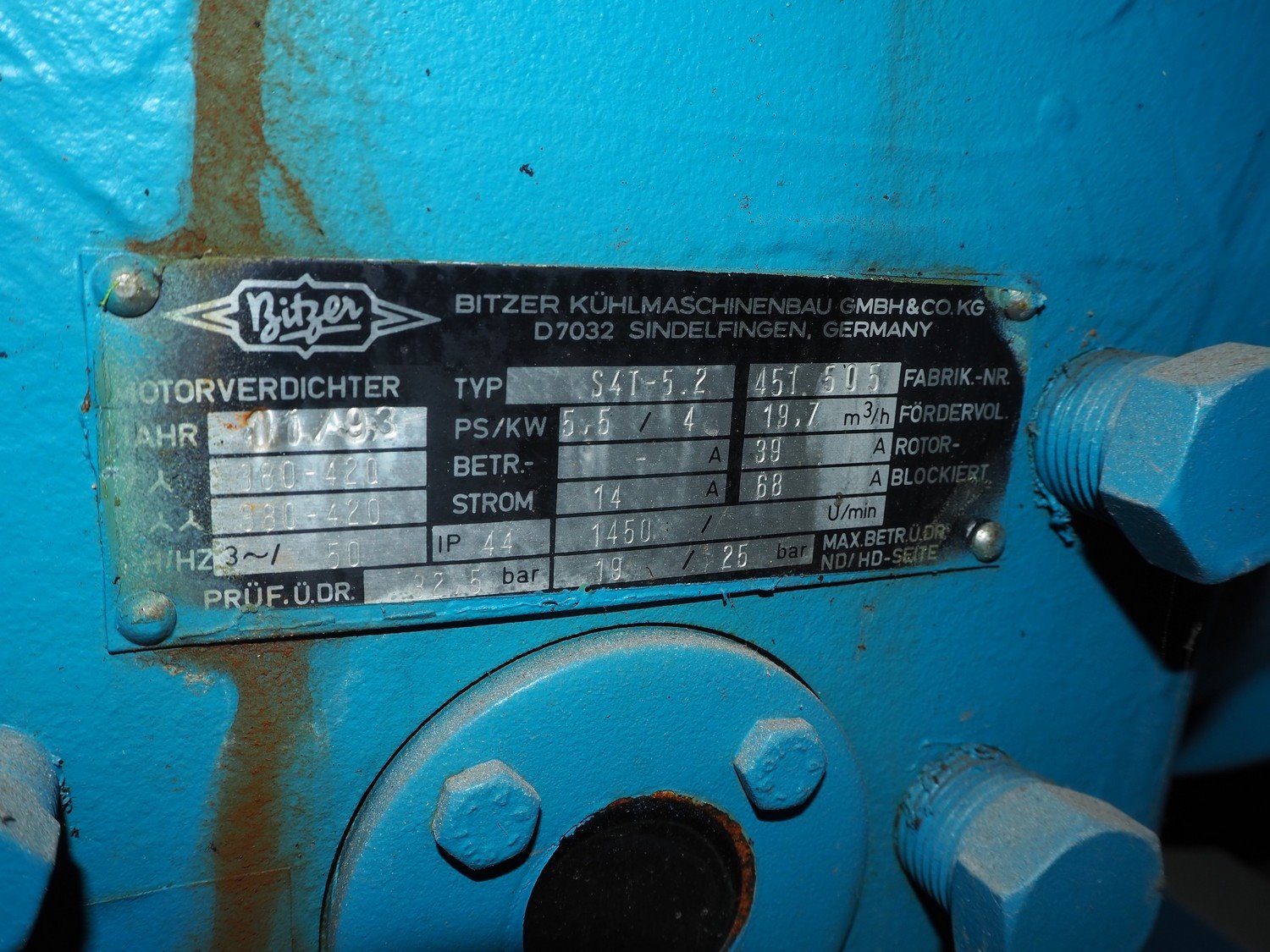 Linde cooling unit, type: VHM 325-4501, serial number: 11805, year of construction: 1993, 400/230 V, 50 Hz, consisting of 3 Bitzer cooling compressors, (3x) type: S4T-5.2, fabric number: 451 504, 380-420 V, 3 Ph, 50 Hz, 5.5/4 kW, 1450 rpm, 19/25 bar, refrigerant: R22, 19.7 m³/h, dimensions: 2100 mm x 790 mm x 1900 mm.