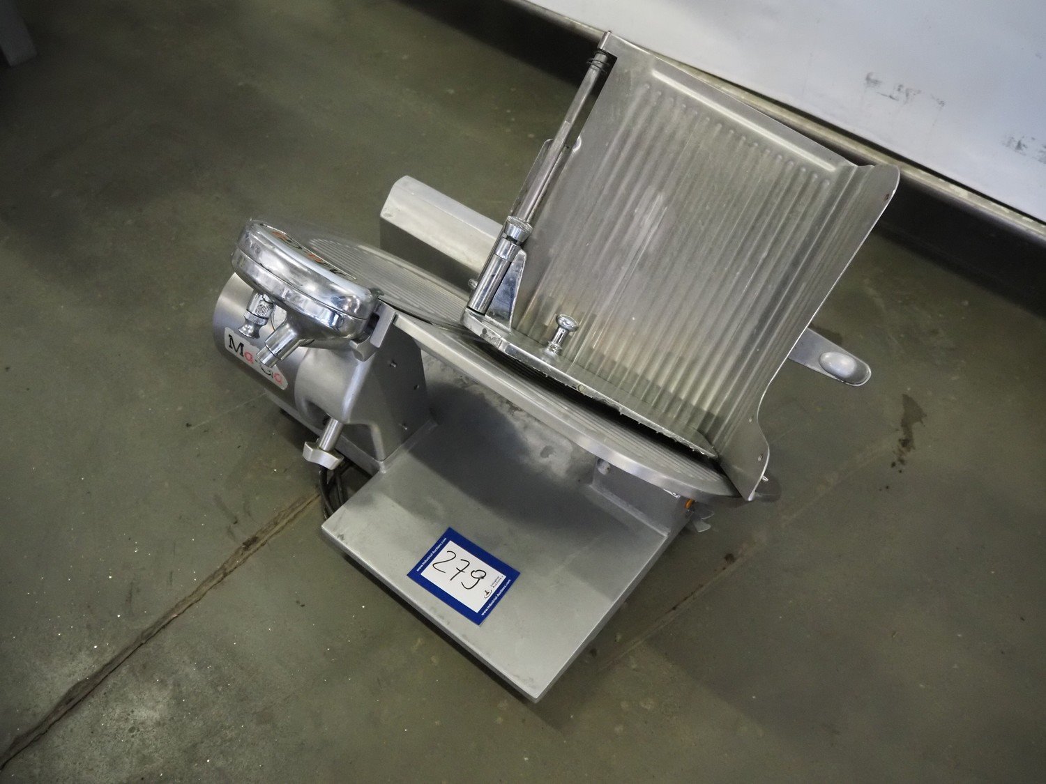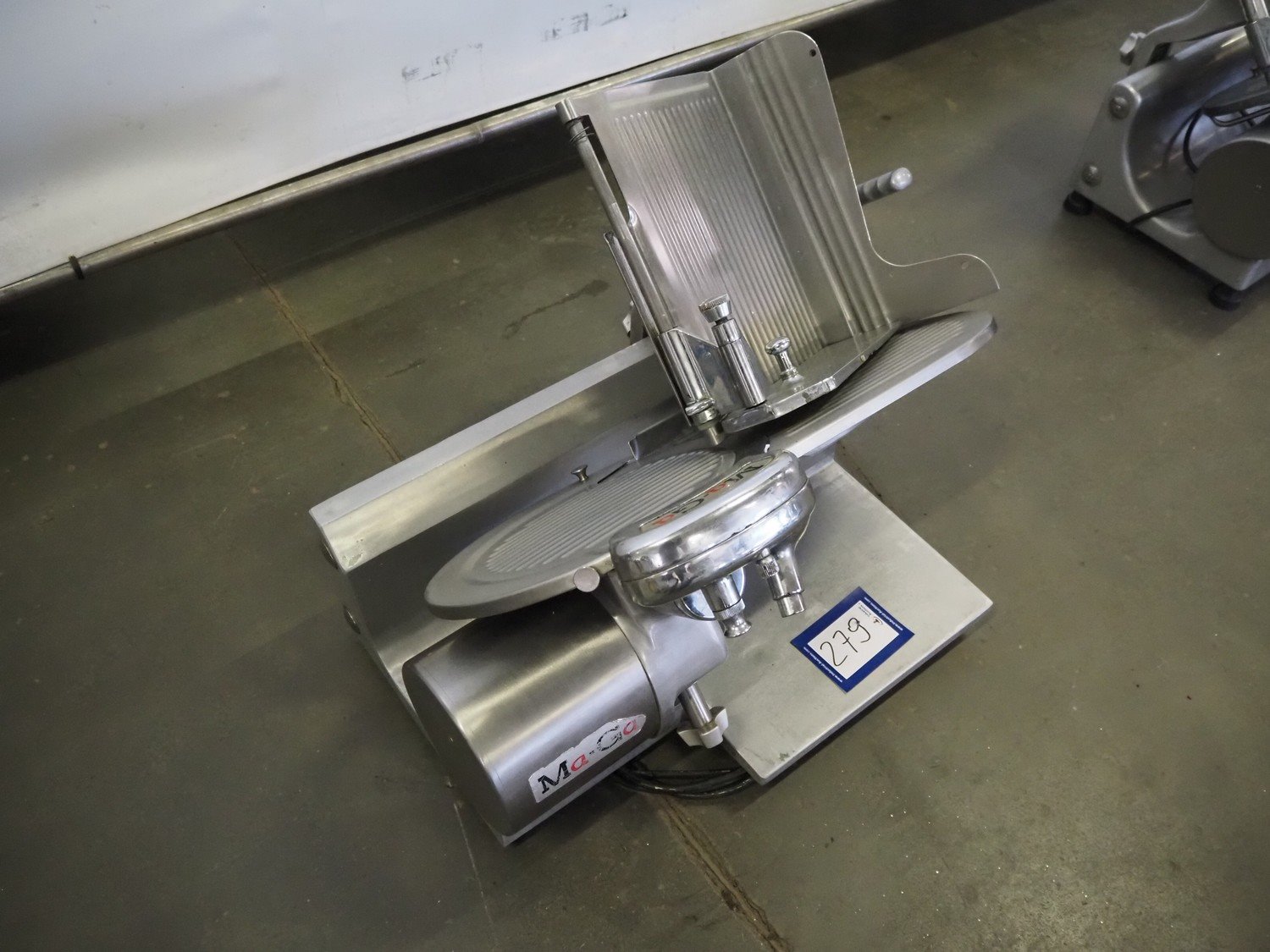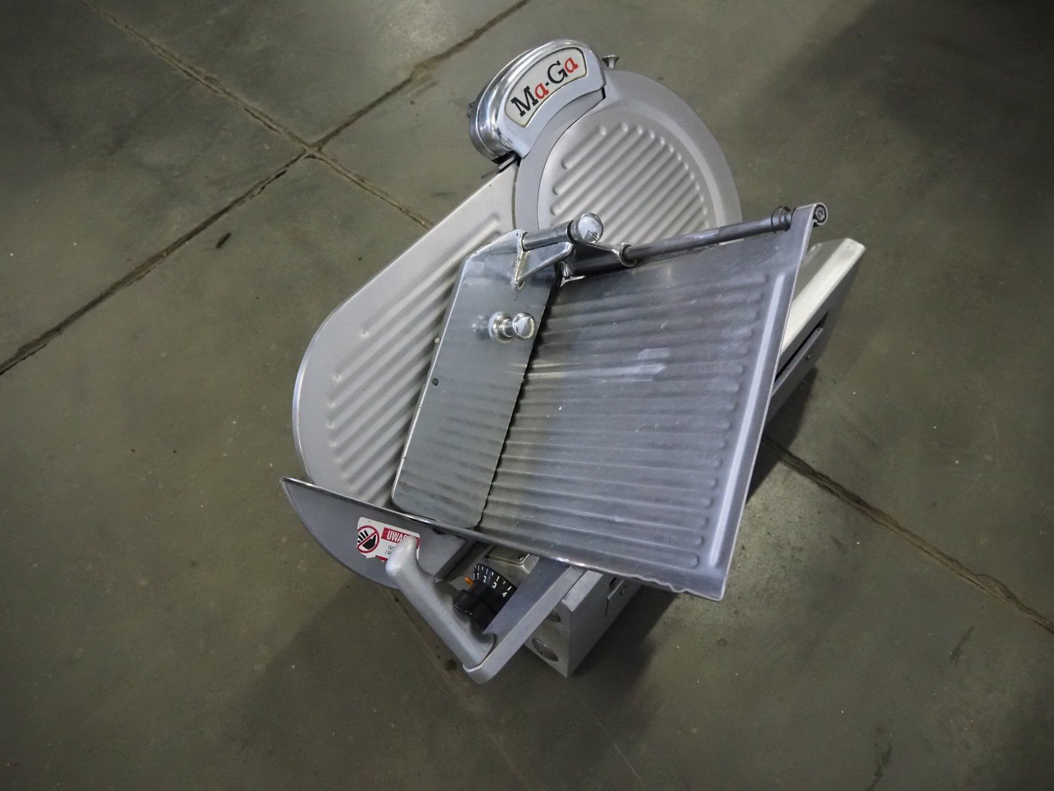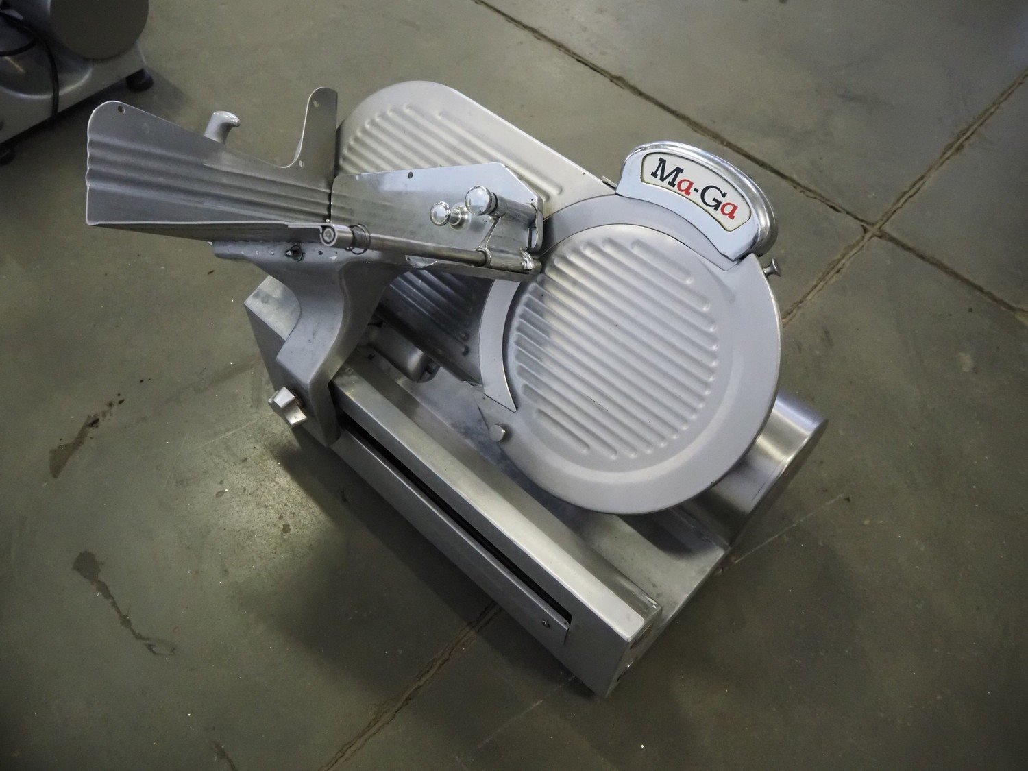 Ma-Ga table model slicer with knife sharpener, model: P, number: 26 734, year of construction: 1993, 220 V, 1 Ph, 50 Hz, 180 W, weight: 36 kg, dimensions: 600 mm x 500 mm x 500 mm.