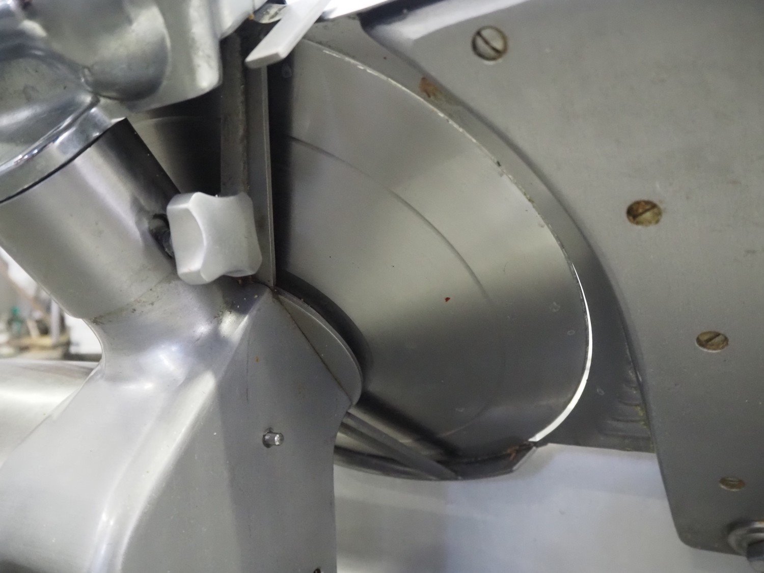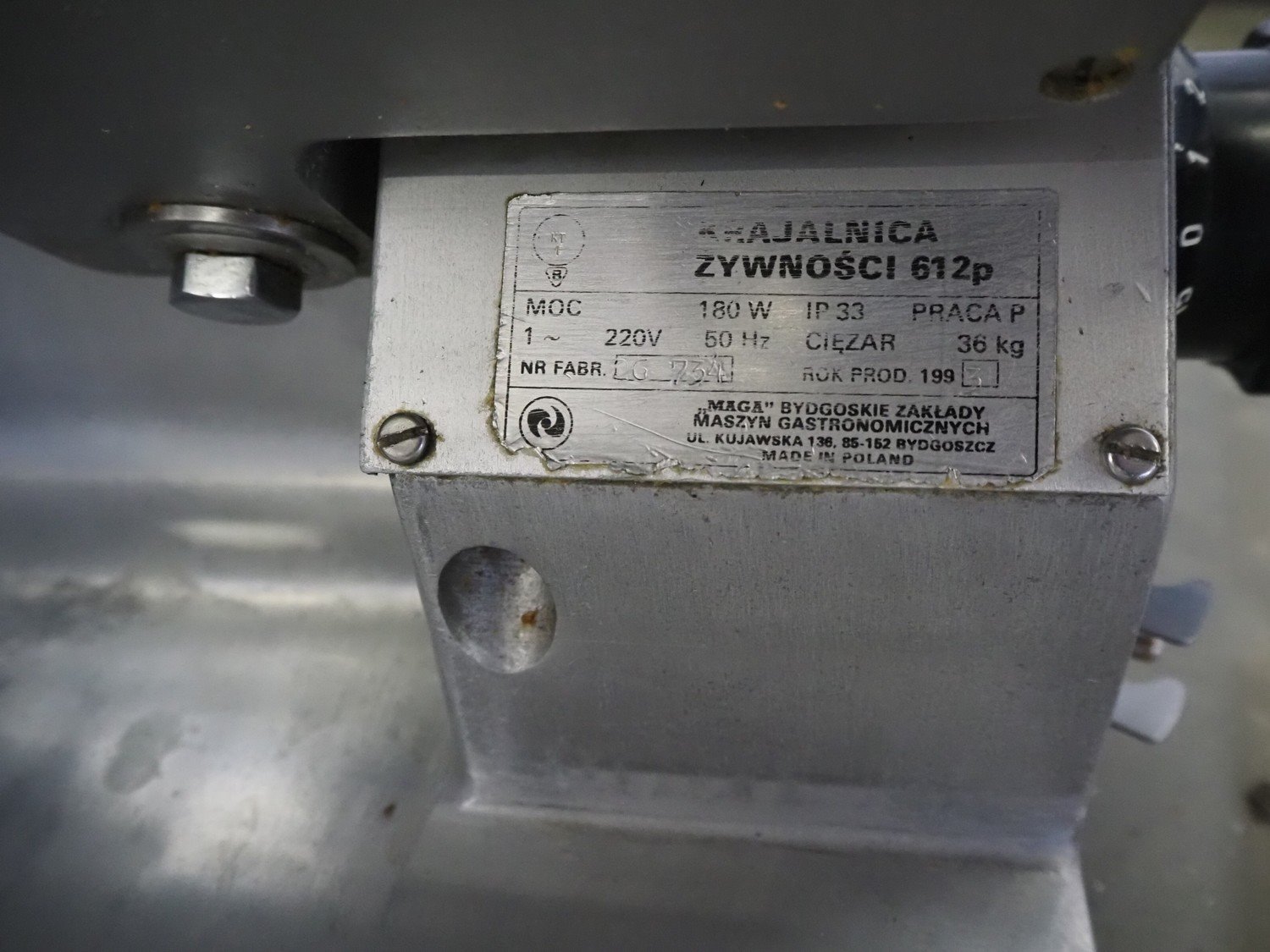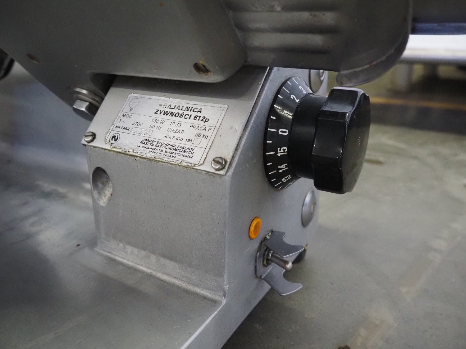 Ma-Ga table model slicer with knife sharpener, model: P, number: 26 734, year of construction: 1993, 220 V, 1 Ph, 50 Hz, 180 W, weight: 36 kg, dimensions: 600 mm x 500 mm x 500 mm.