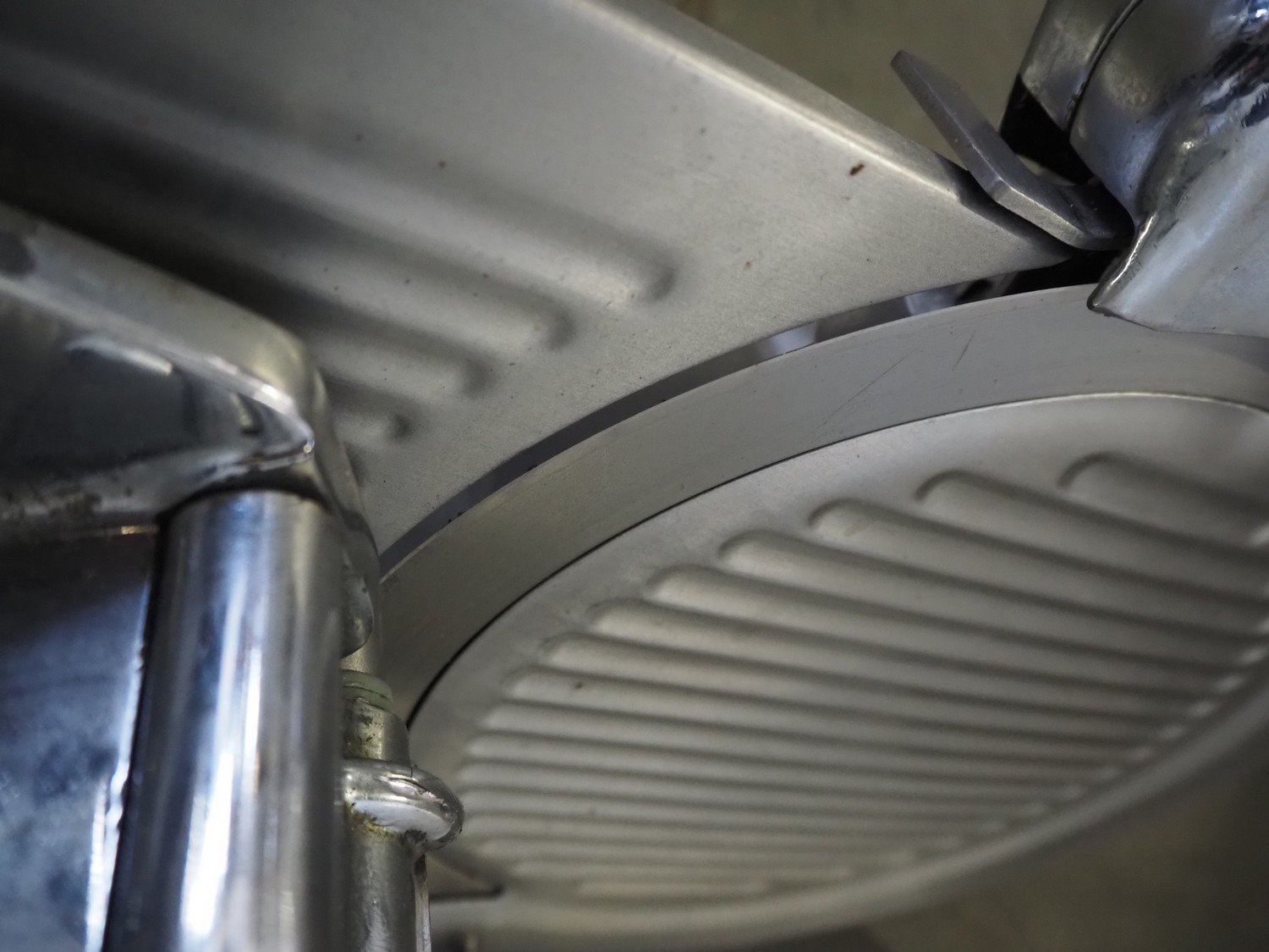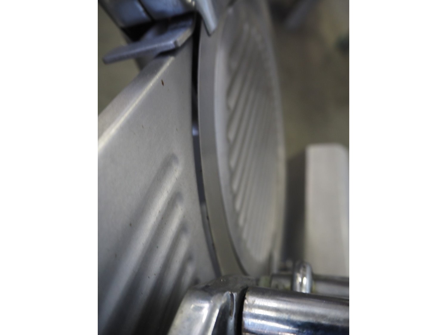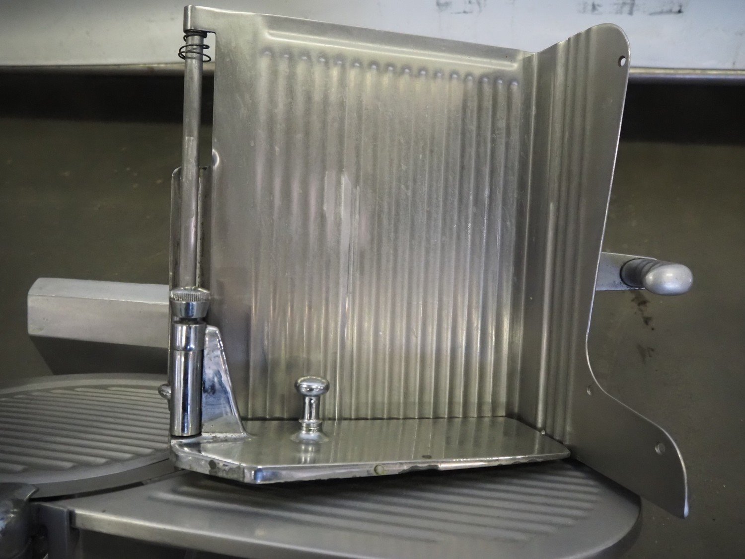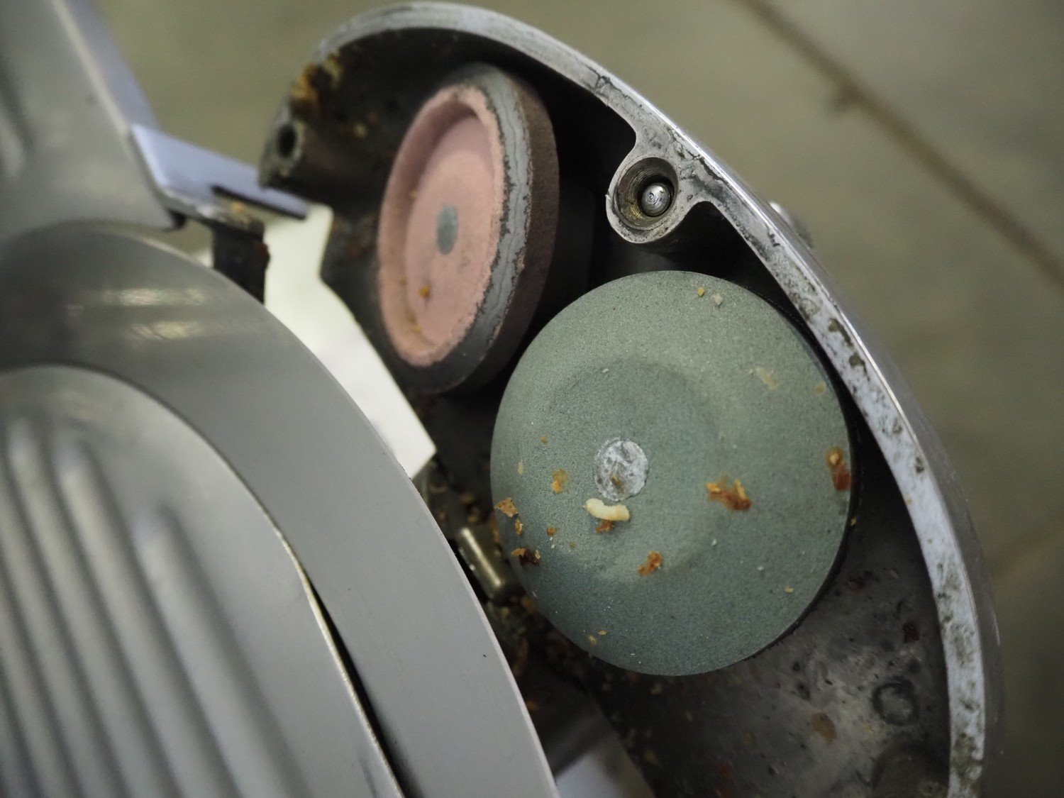 Ma-Ga table model slicer with knife sharpener, model: P, number: 26 734, year of construction: 1993, 220 V, 1 Ph, 50 Hz, 180 W, weight: 36 kg, dimensions: 600 mm x 500 mm x 500 mm.