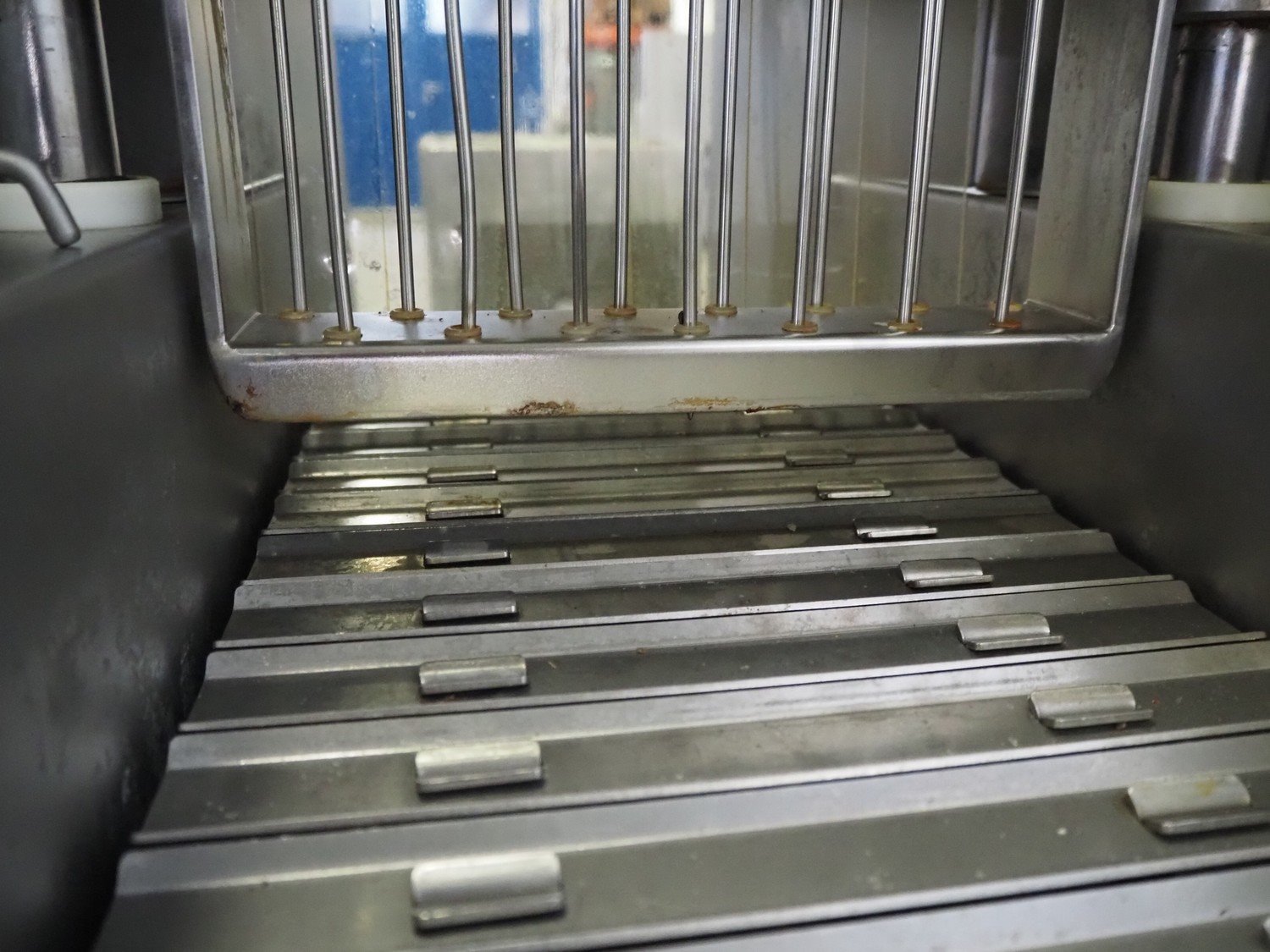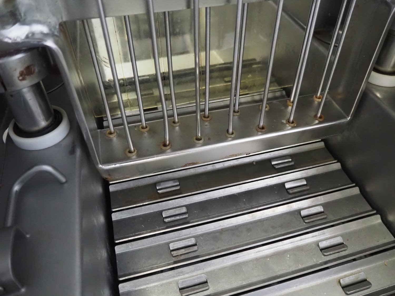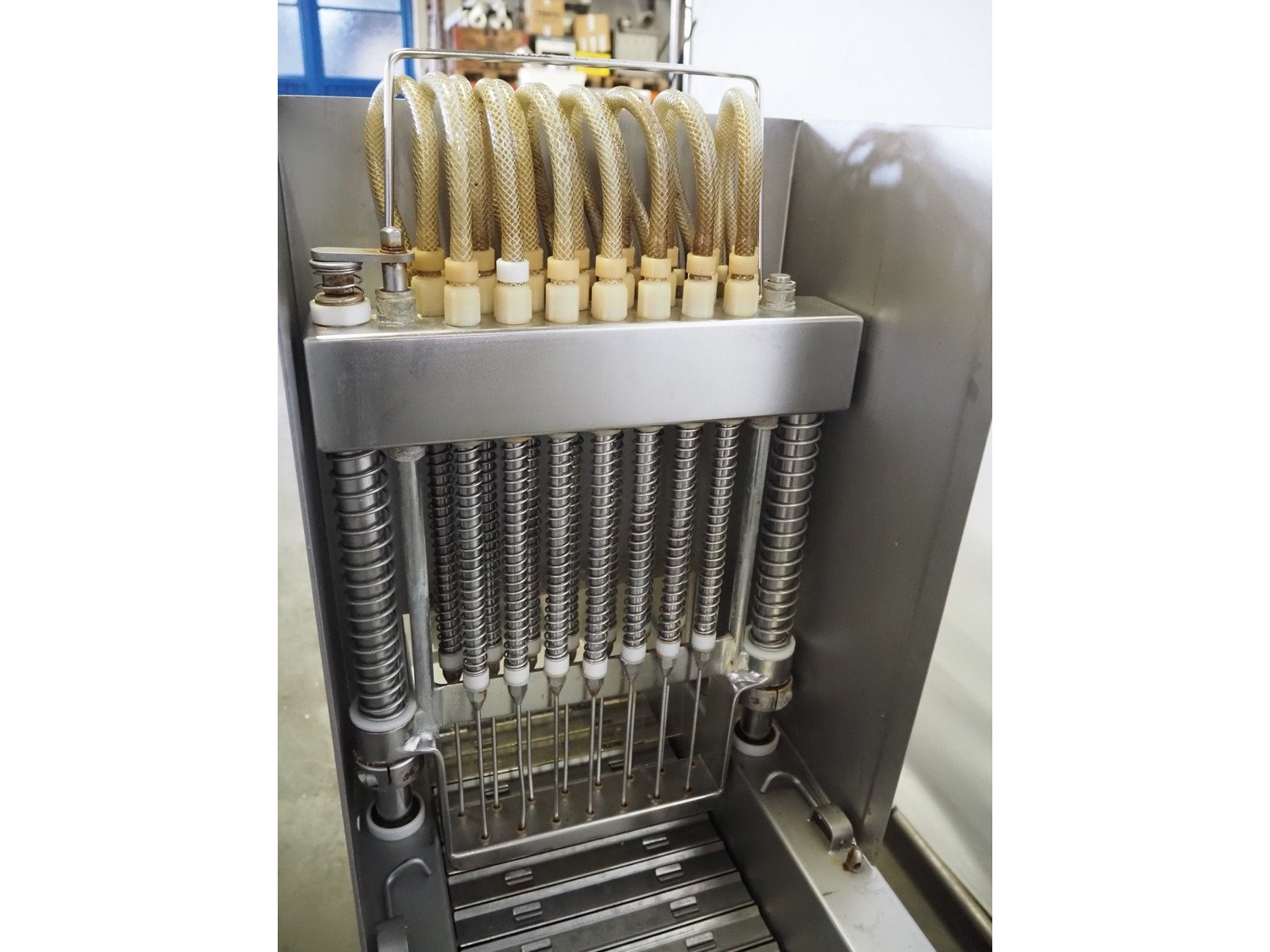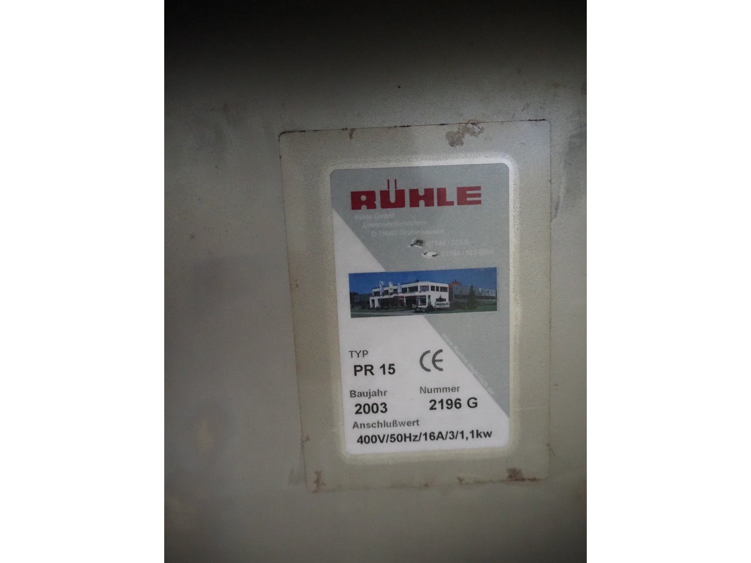 Rühle injector, type: PR 15, number: 2196 G, year of construction: 2003, 400 V, 3 Ph, 50 Hz, 16 A, 1.1 kW, 15 needles, s/s belt, belt width: 260 mm, total dimensions: 1150 mm x 450 mm x 1400 mm.