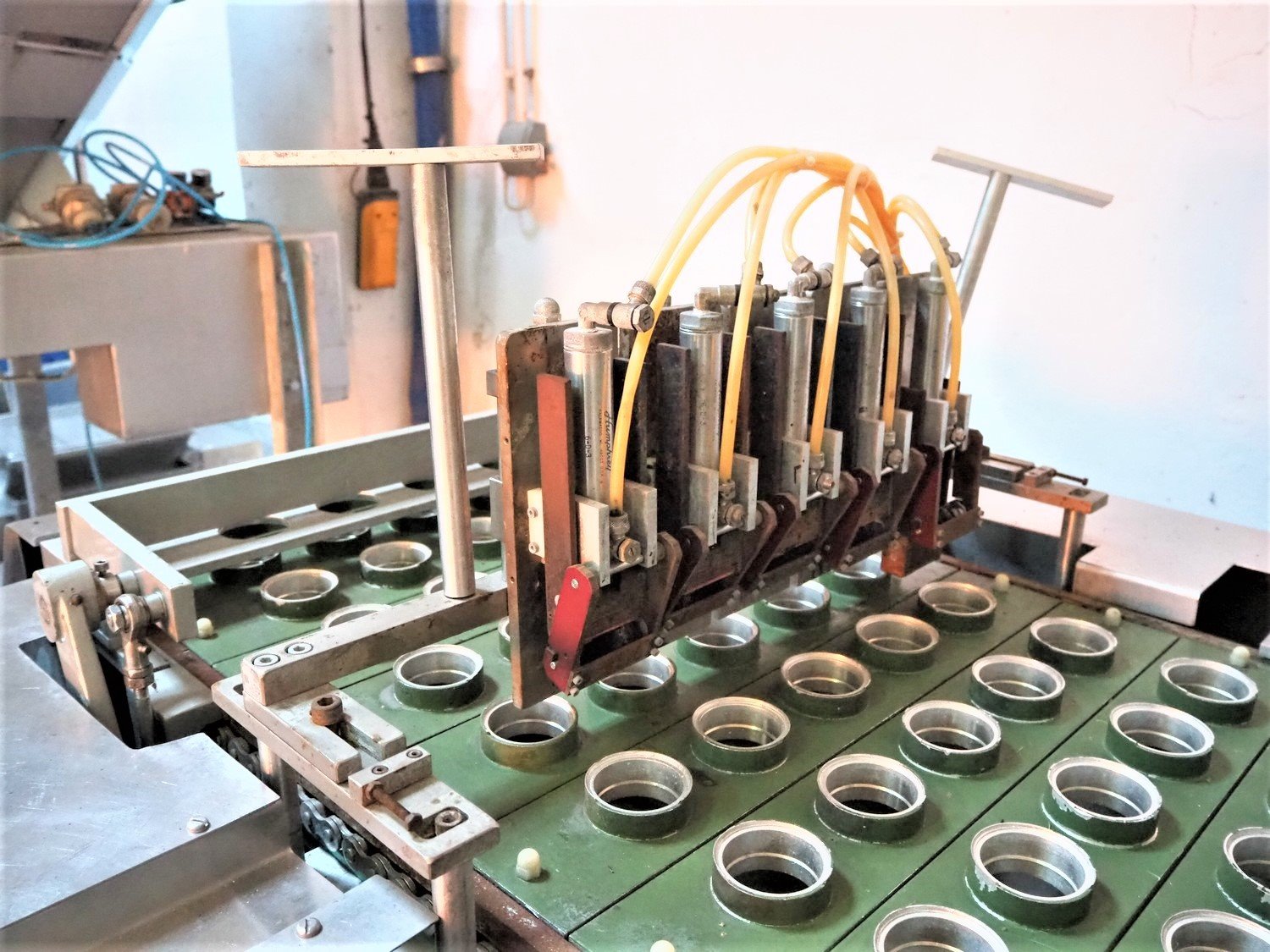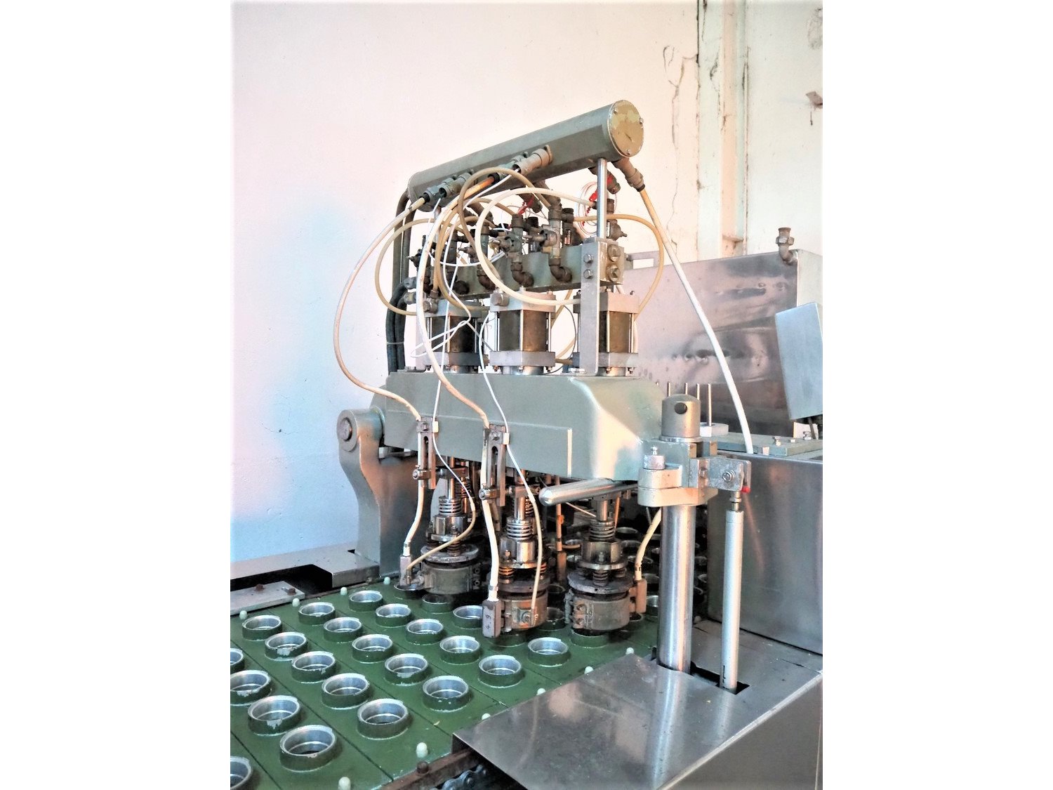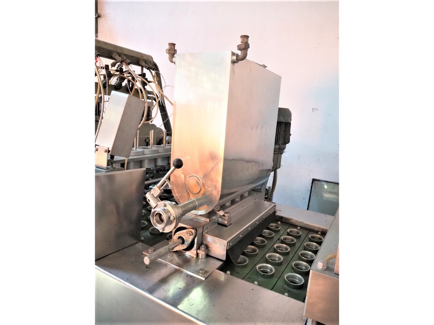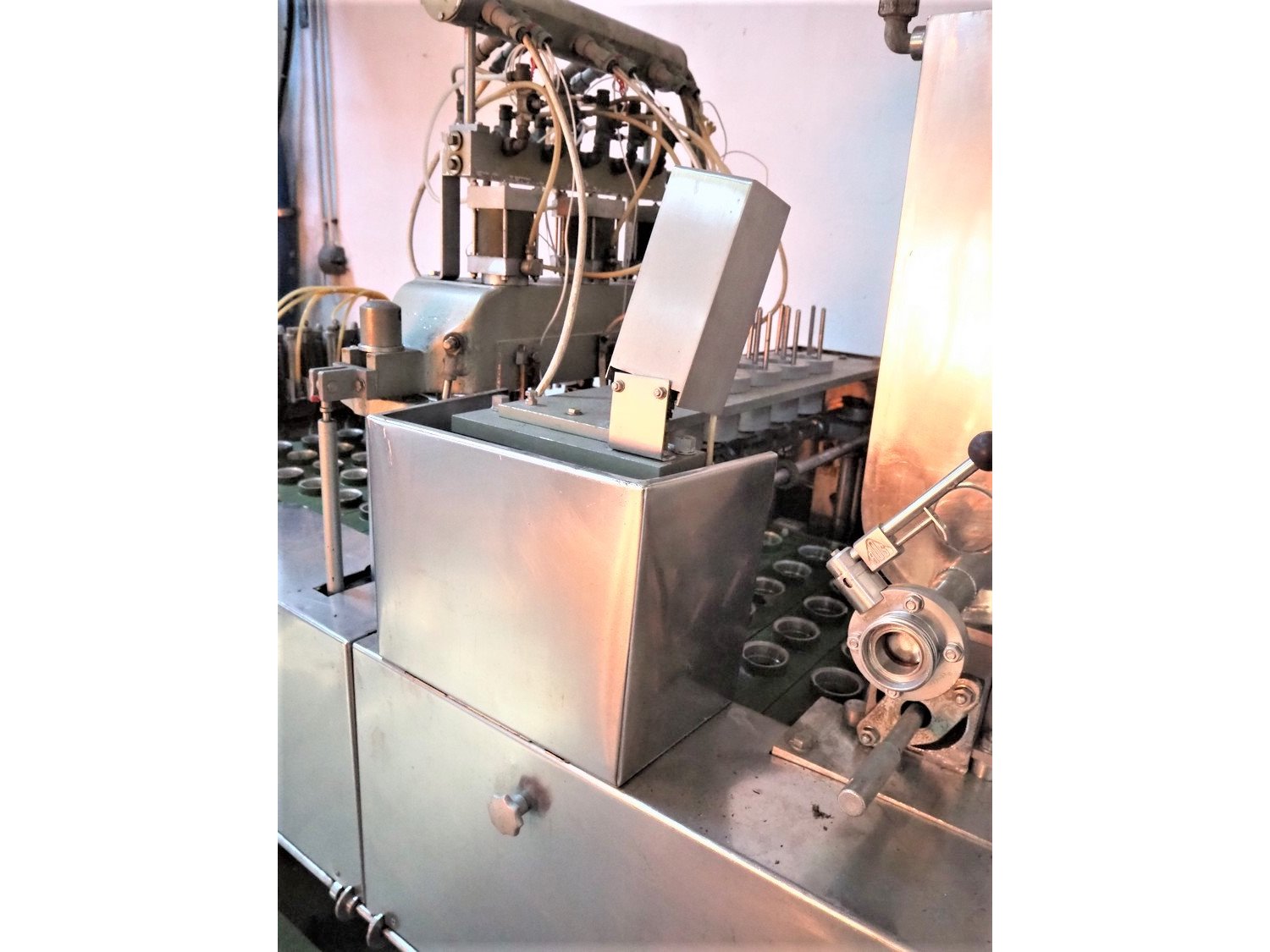 Hamba cup filling and sealing machine, machine number: 45 002, diameter cup: 55 mm, total dimensions: 3900 mm x 1150 mm x 2100 mm.