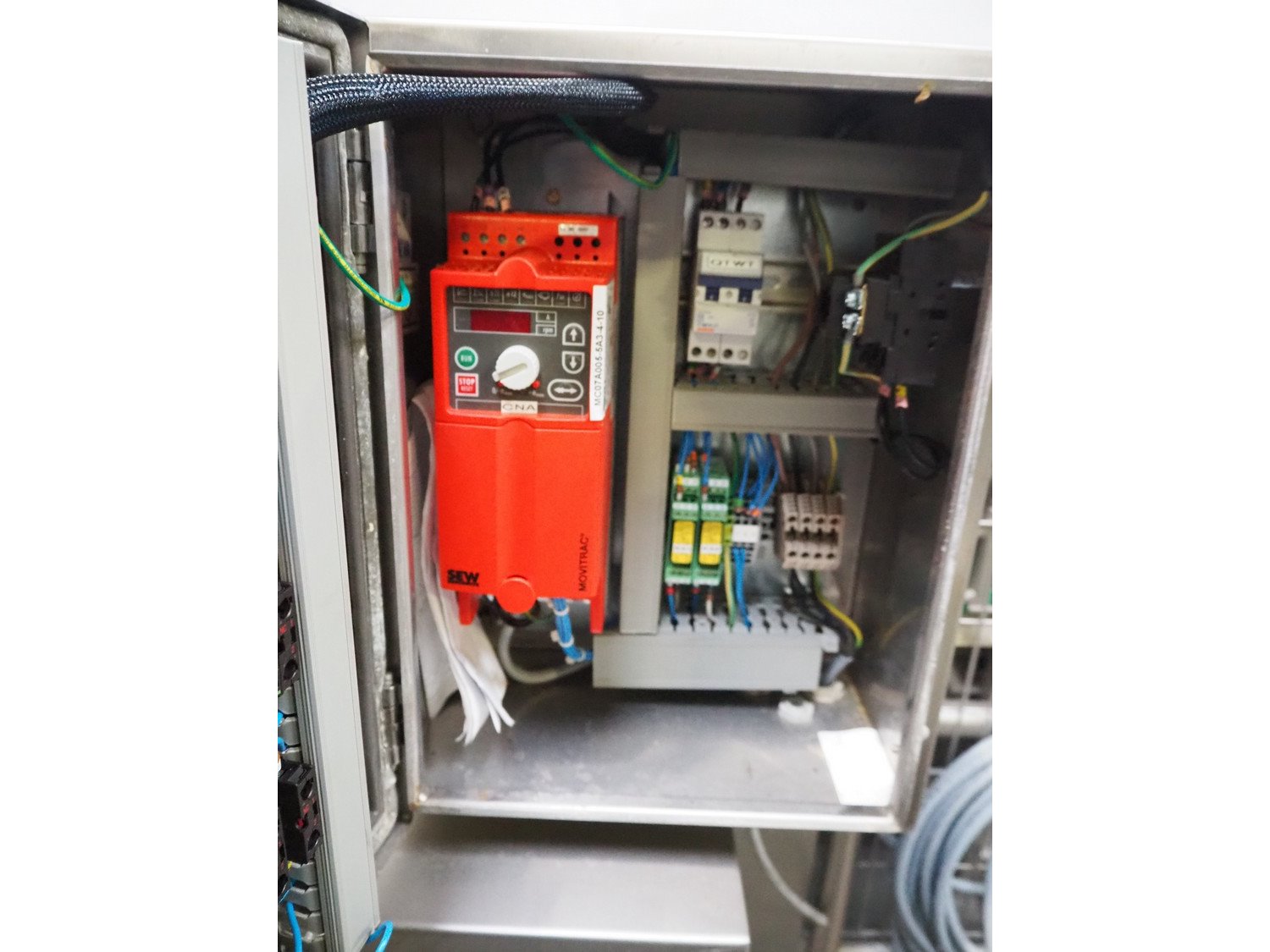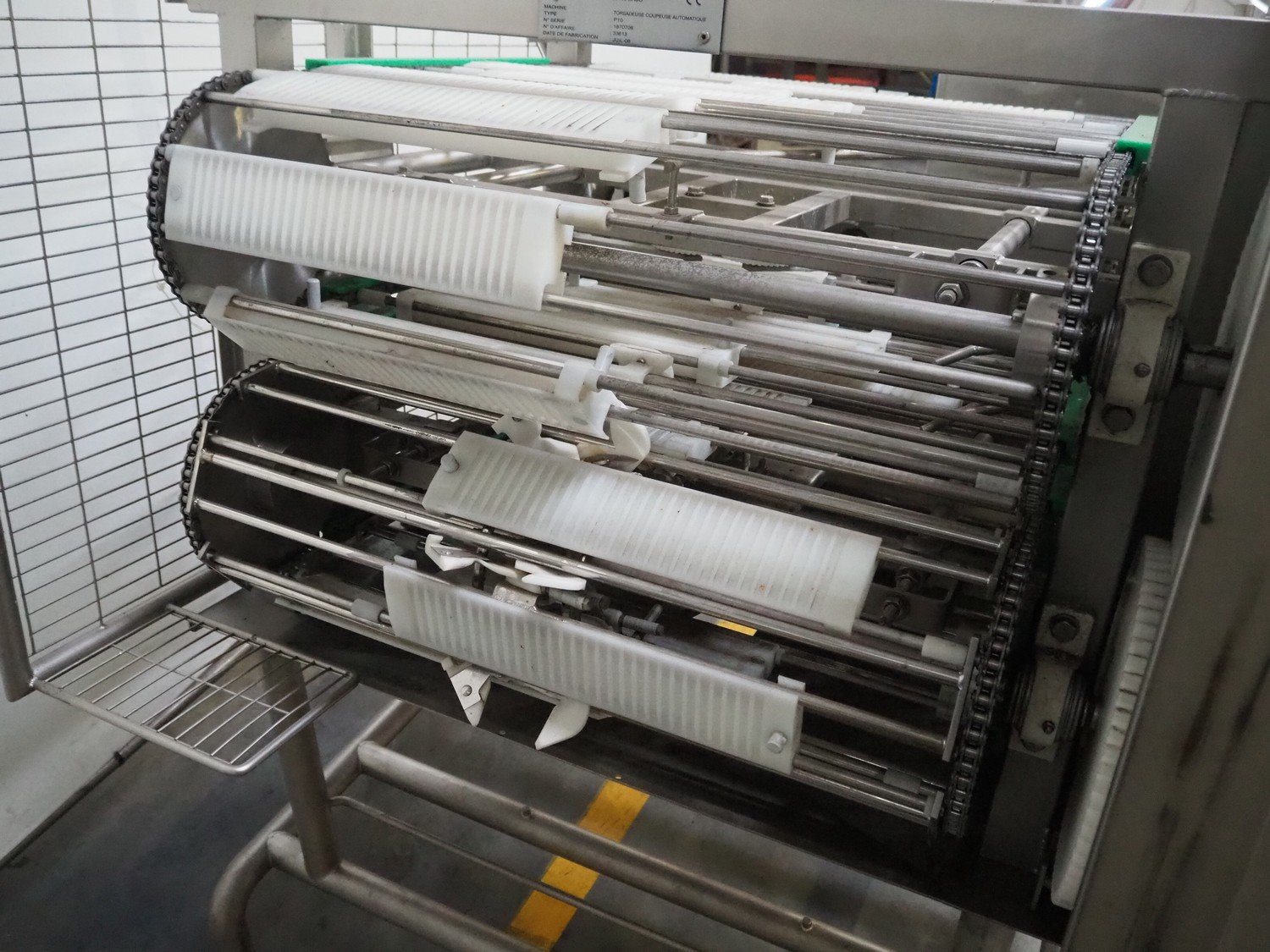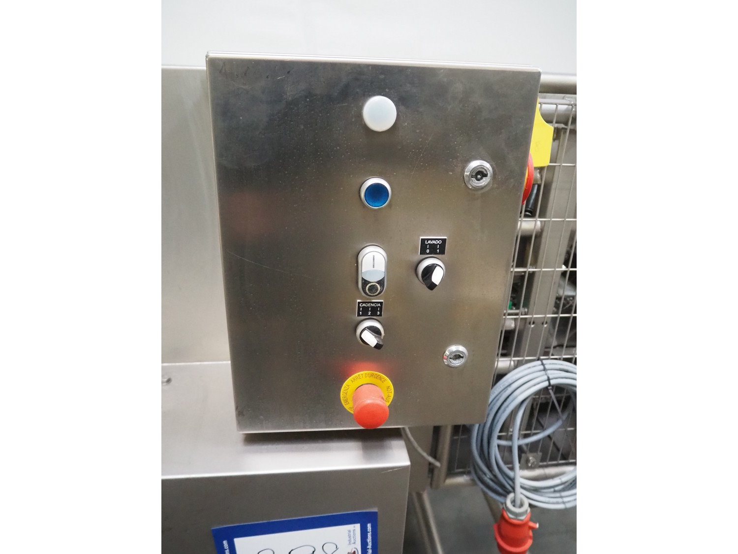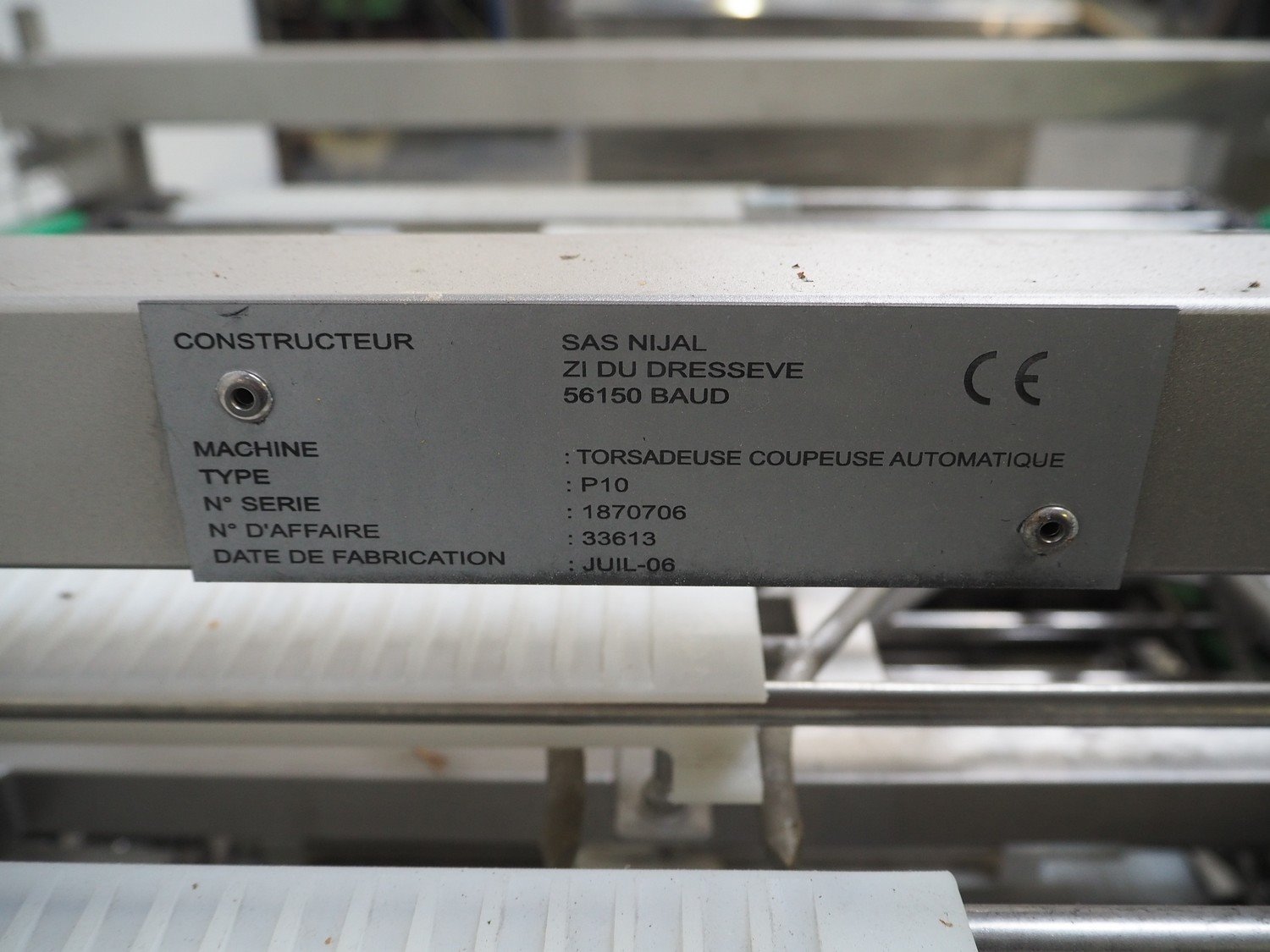SAS Nijal twisting and cutting machine for sausages, machine: Torsadeuse Coupeuse Automatique, type: P10, serial number: 1870706, year of construction: 2006, working width: 700 mm, total dimensions: 1250 mm x 1200 mm x 1500 mm.