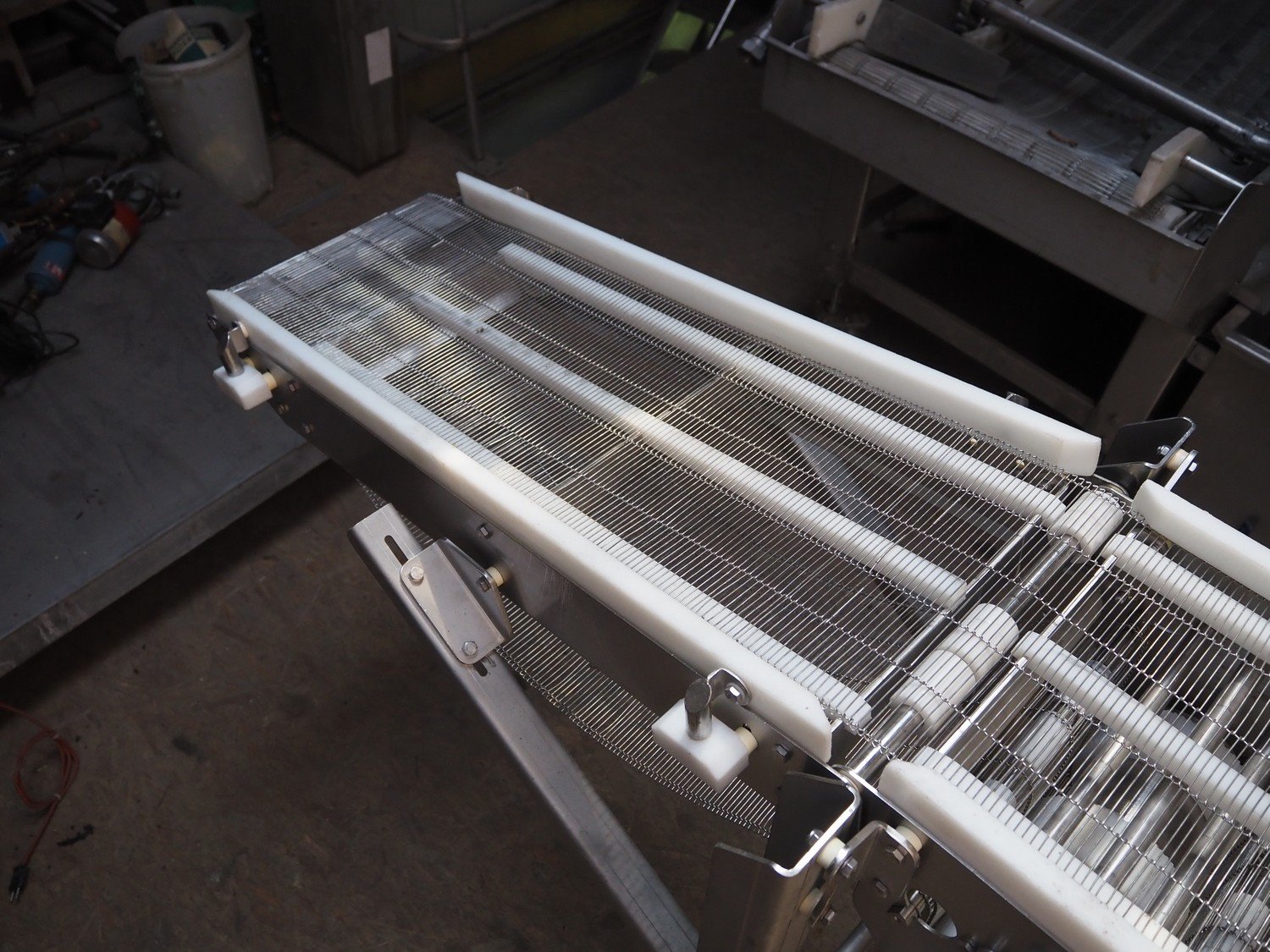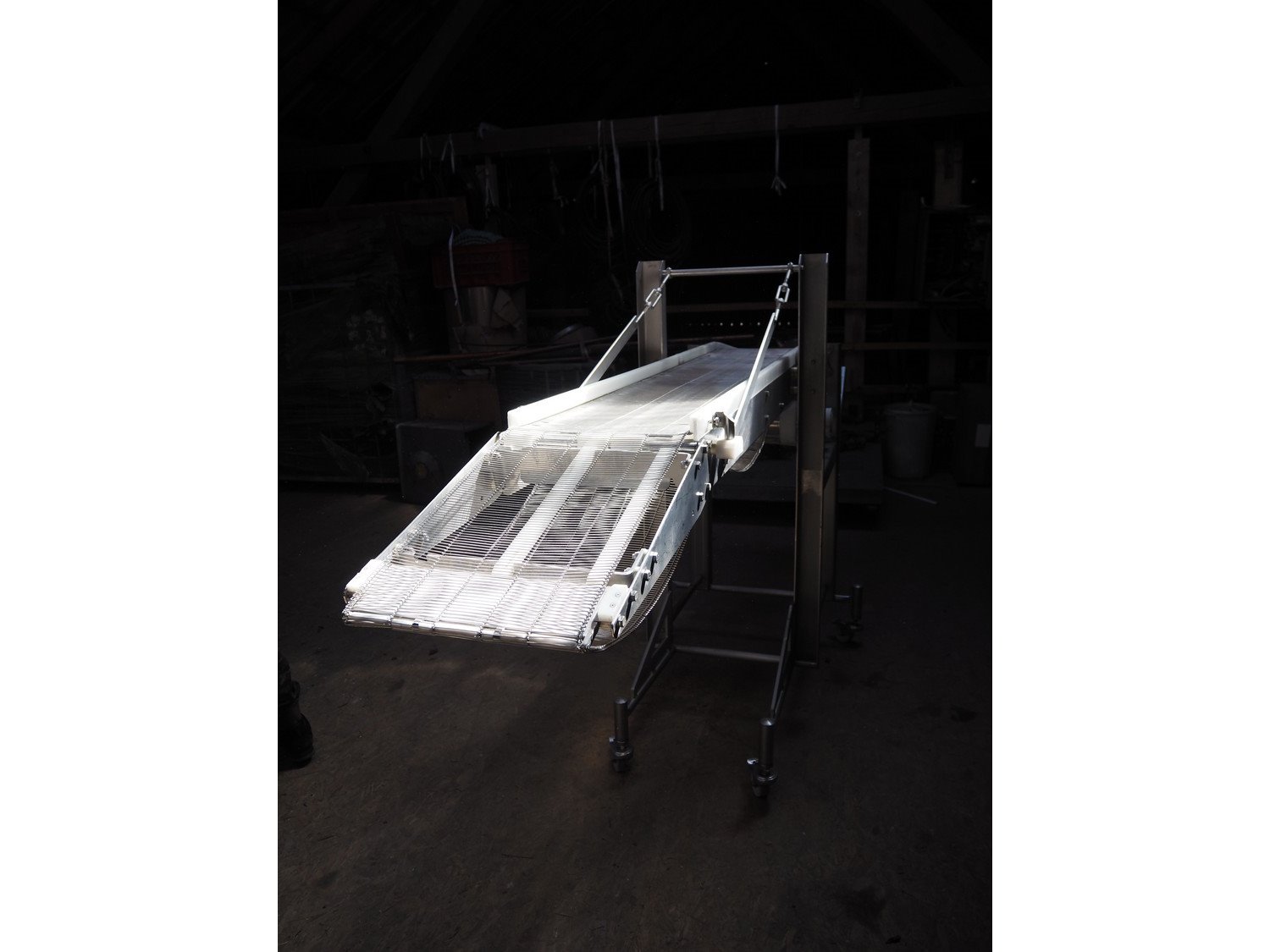 Mobile transport belt, s/s mesh belt, belt width: 340 mm, total dimensions: 3150 mm x 850 mm x 1480 mm.