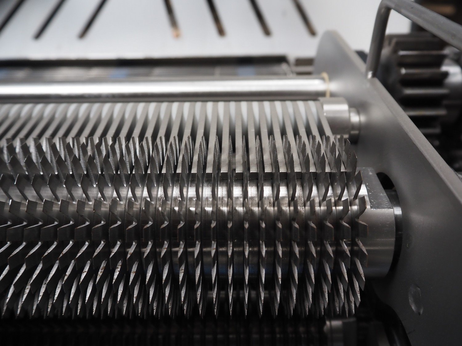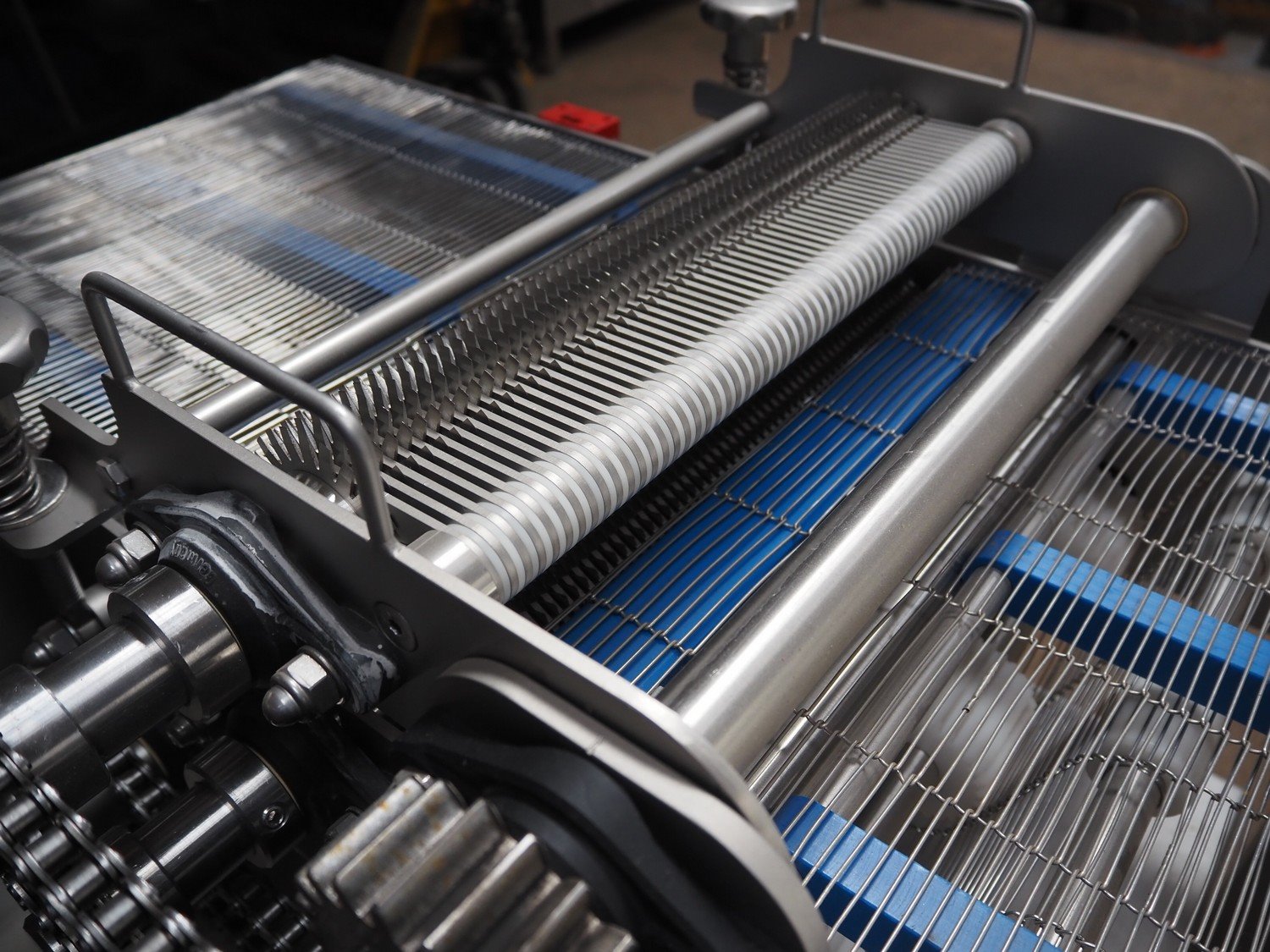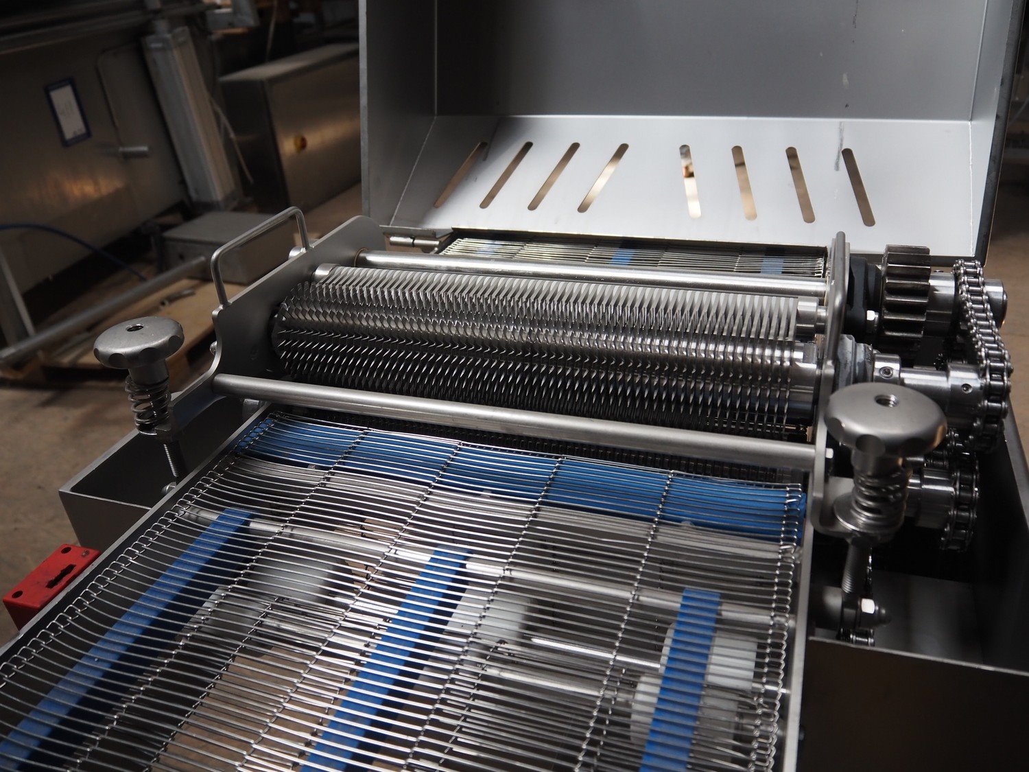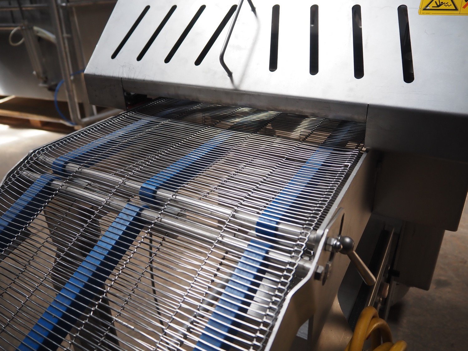 Alco food machines GmbH mobile tenderizer, type: ASC 400 N, serial number: 04301220, year of construction: 2009, 400 V, 0.55 kW, weight: 220 kg, s/s mesh belt, belt width: 400 mm, working width: 400 mm, total dimensions: 1600 mm x 660 mm x 1120 mm.