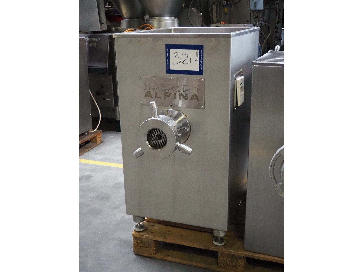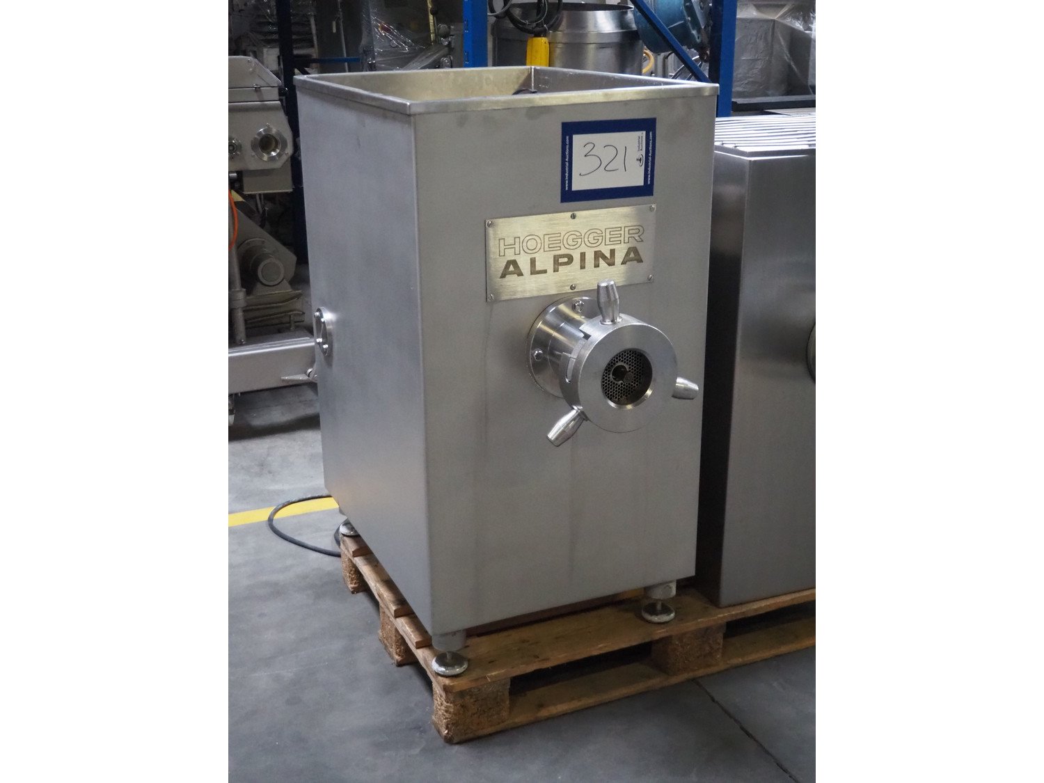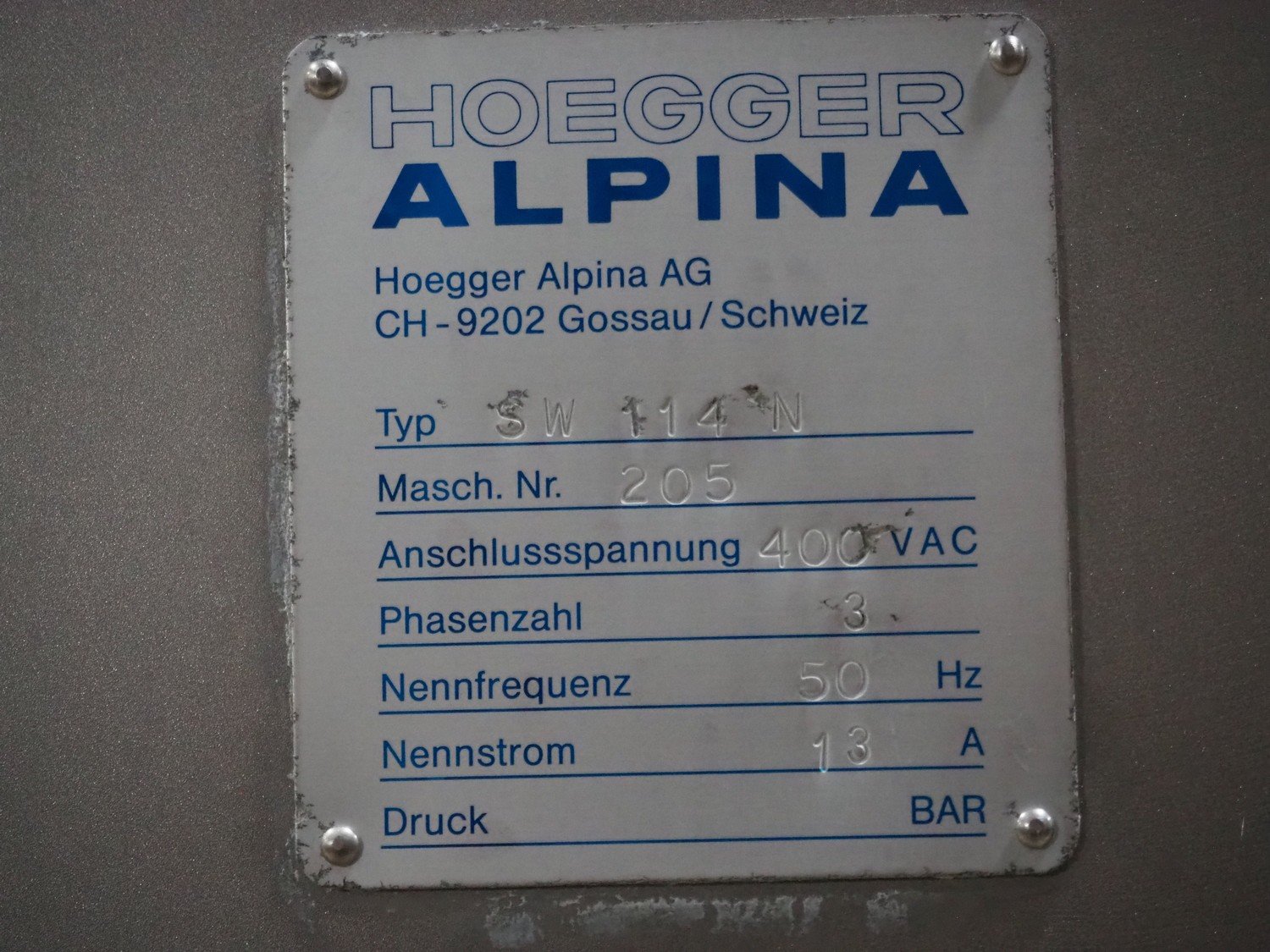 Hoegger Alpina grinder, type: SW 114 N, machine number: 205, 400 V, 3 Ph, 50 Hz, 13 A, plate diameter: 114 mm, total dimensions: 1000 mm x 600 mm x 1300 mm.