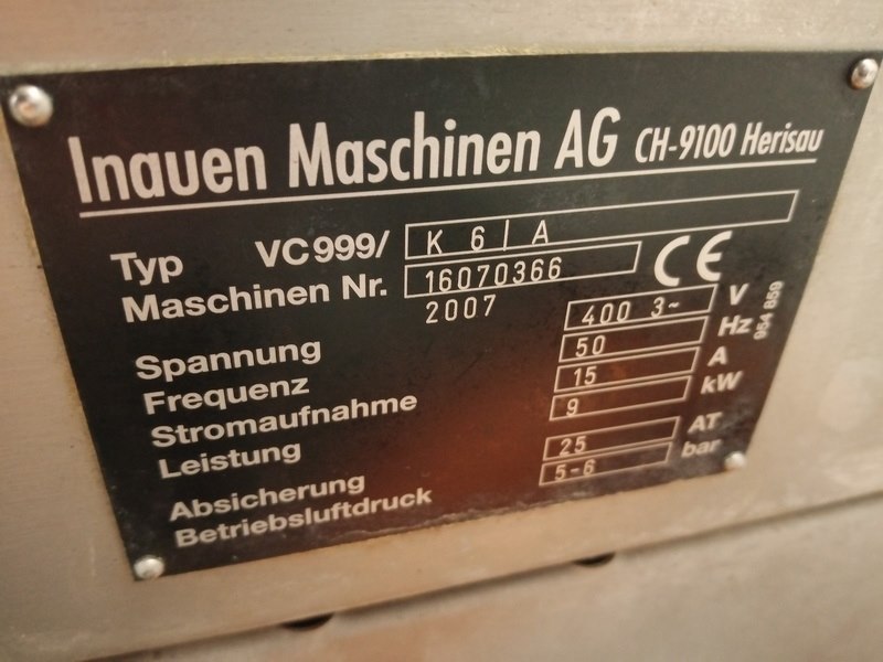 Inauen Maschinen AG mobile vacuum machine, type: VC999/K 6 | A, machine number: 1607366, year of construction: 2007, 400 V, 3 Ph, 50 Hz, 15 A, 9 kW, seal length: 920 mm and (2x) 500 mm, dimensions chamber: 920 mm x 500 mm, total dimensions: 1100 mm x 900 mm x 1100 mm. Without vacuum pump.