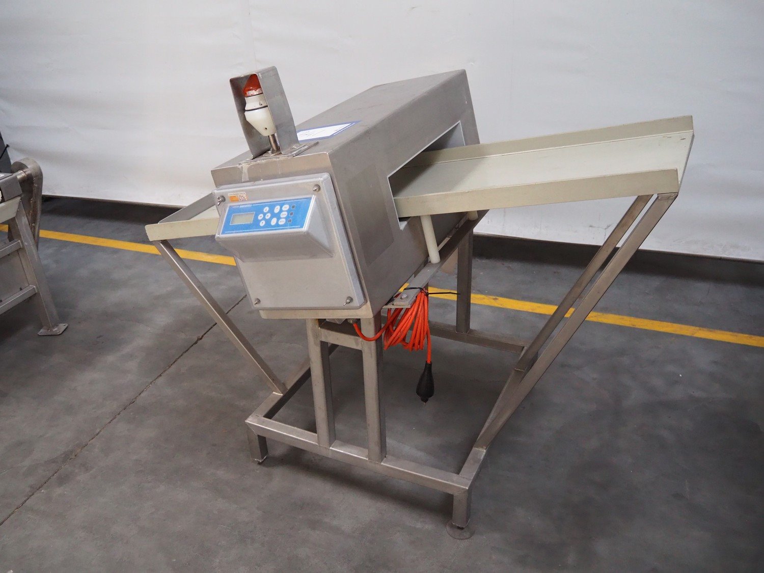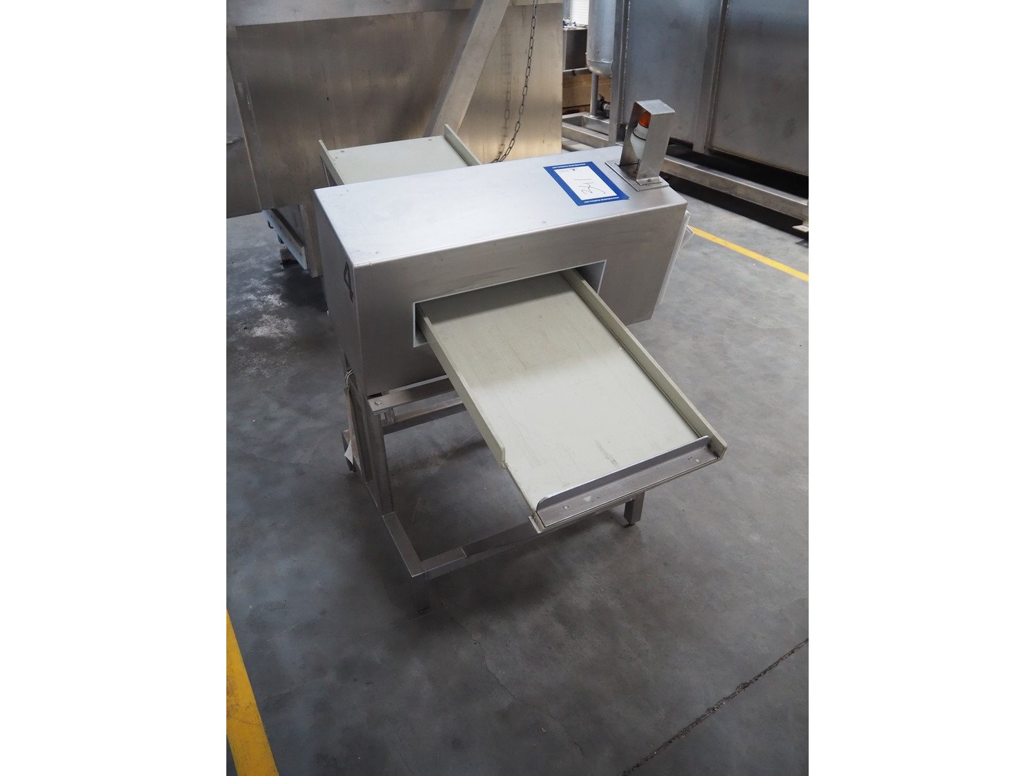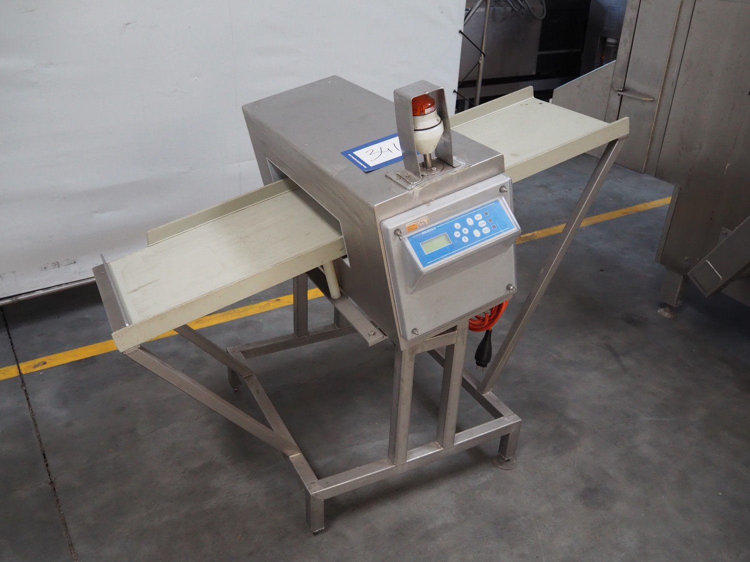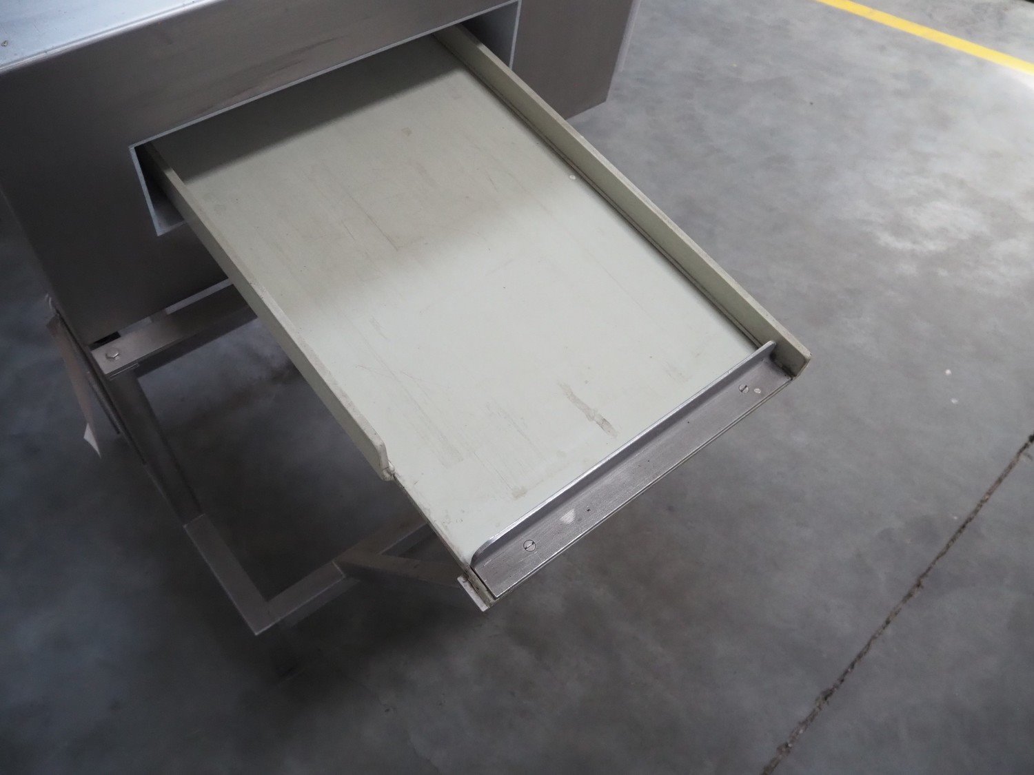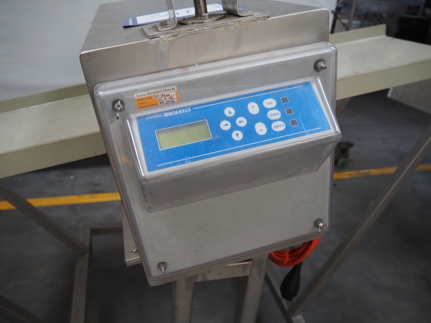 Boekels metal detector, year of construction: 1999, 230 V, 50/60 Hz, without belt, belt width: 400 mm, clearance: 410 mm x 100 mm, elevating height: 1000 mm, total dimensions: 1550 mm x 950 mm x 1250 mm.