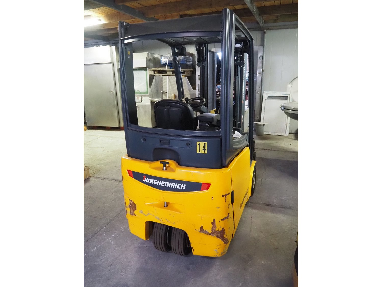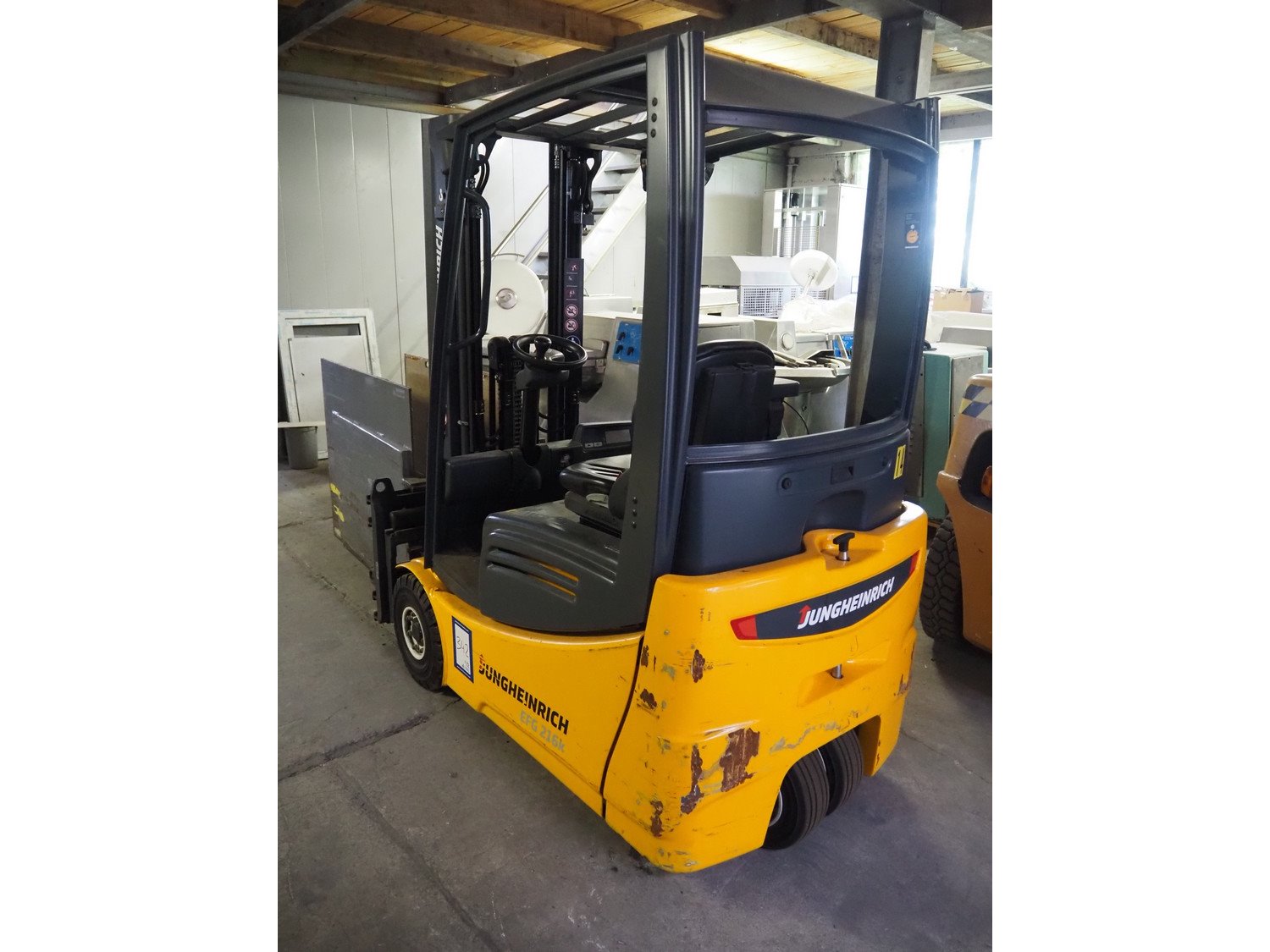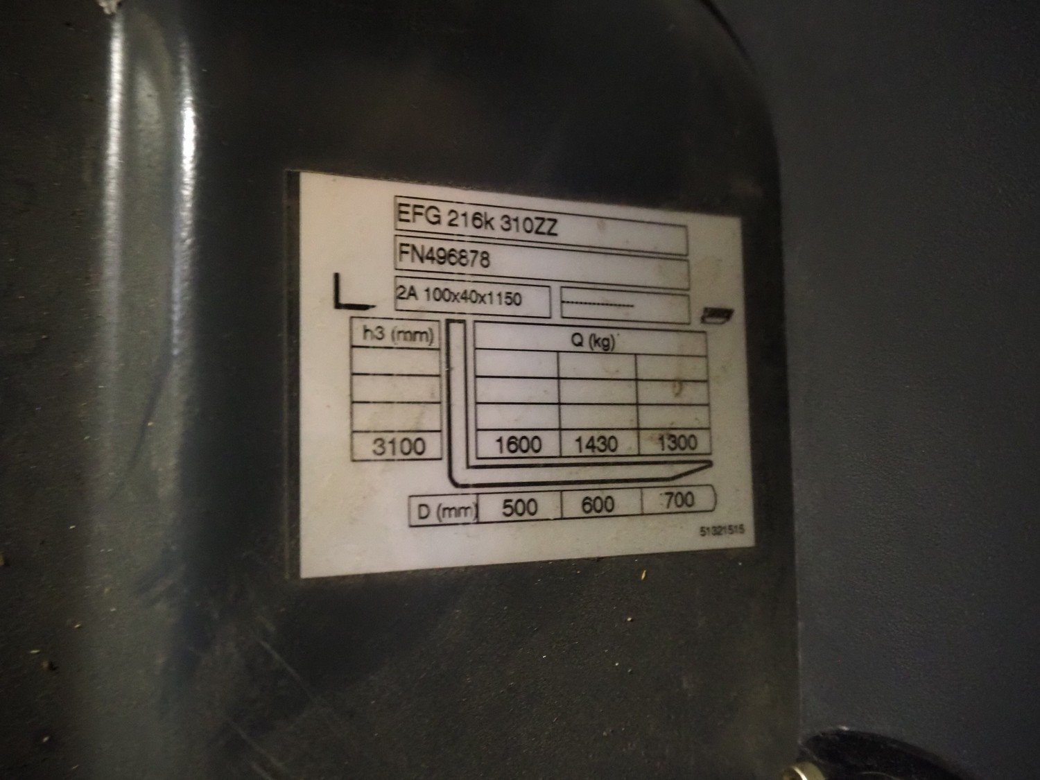 Jungheinrich forklift truck, type: EFG 216K, serial number: FN496878, year of construction: 2015, capacity: 1600 kg, weight: 2293 kg, Kaup bale clamp, clamp dimensions: 1180 mm x 990 mm, Hoppecke battery, type: trak basic, serial number: 45015380, 400 V, 50 Hz, 10 A, 7.2 kVA, weight: 29.50 kg, total dimensions: 3160 mm x 11050 mm x 2060 mm.