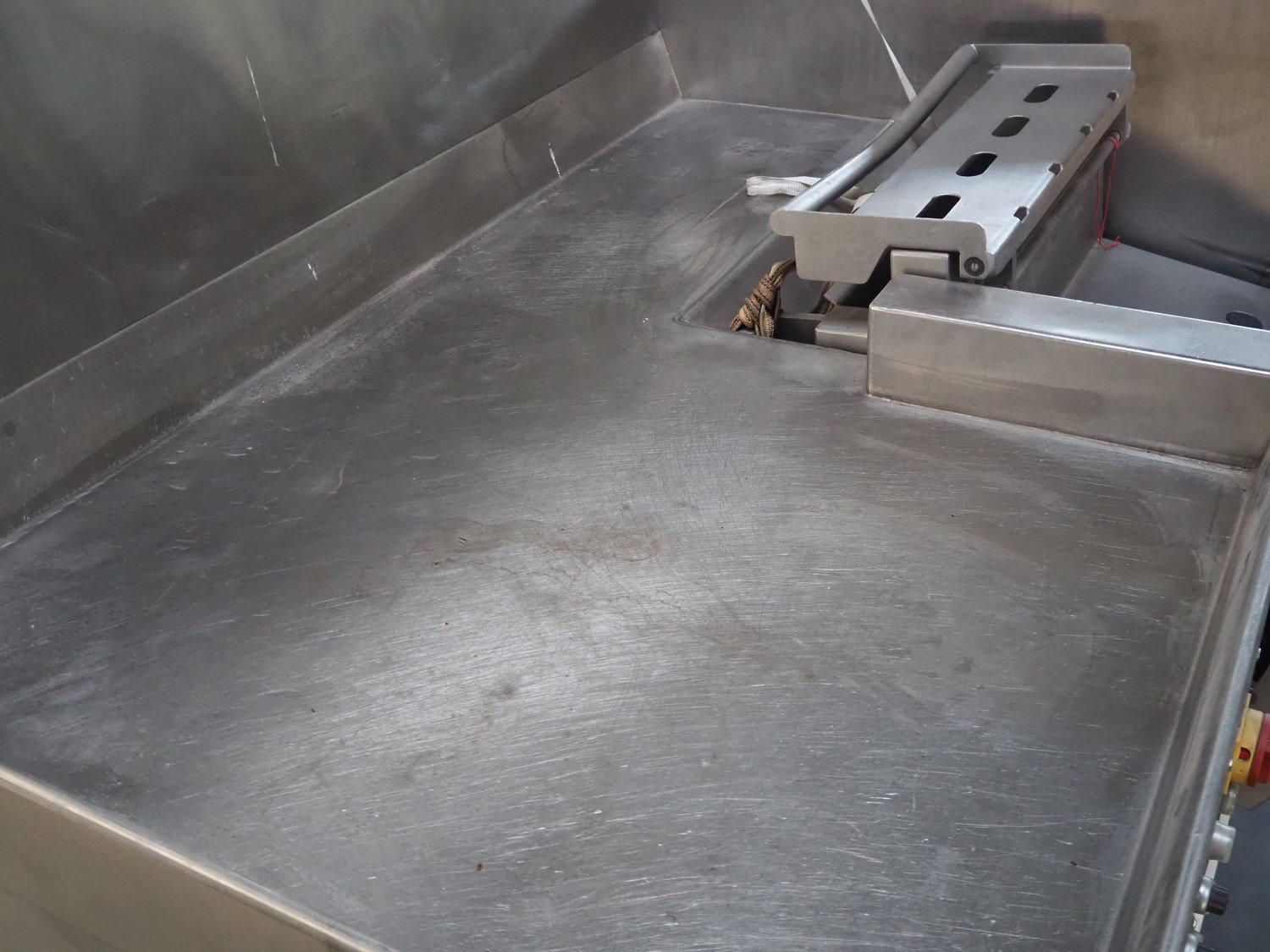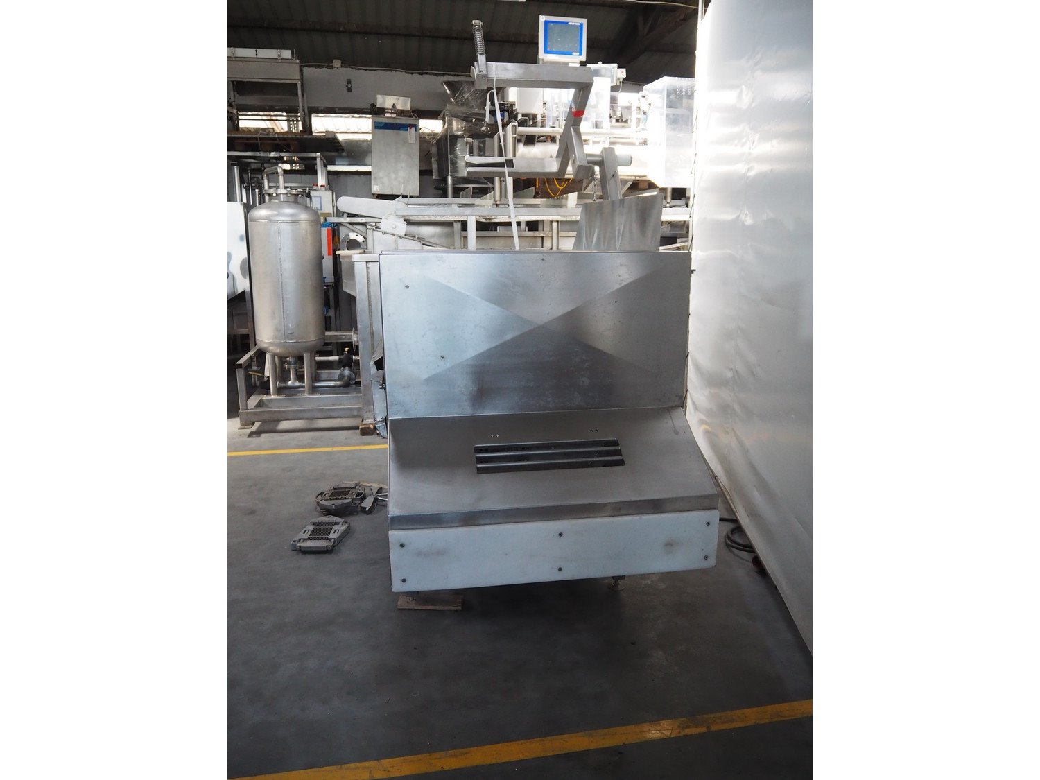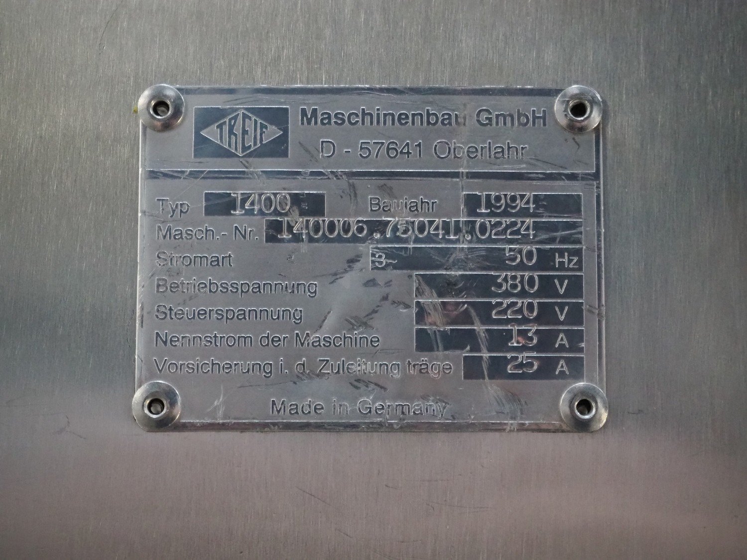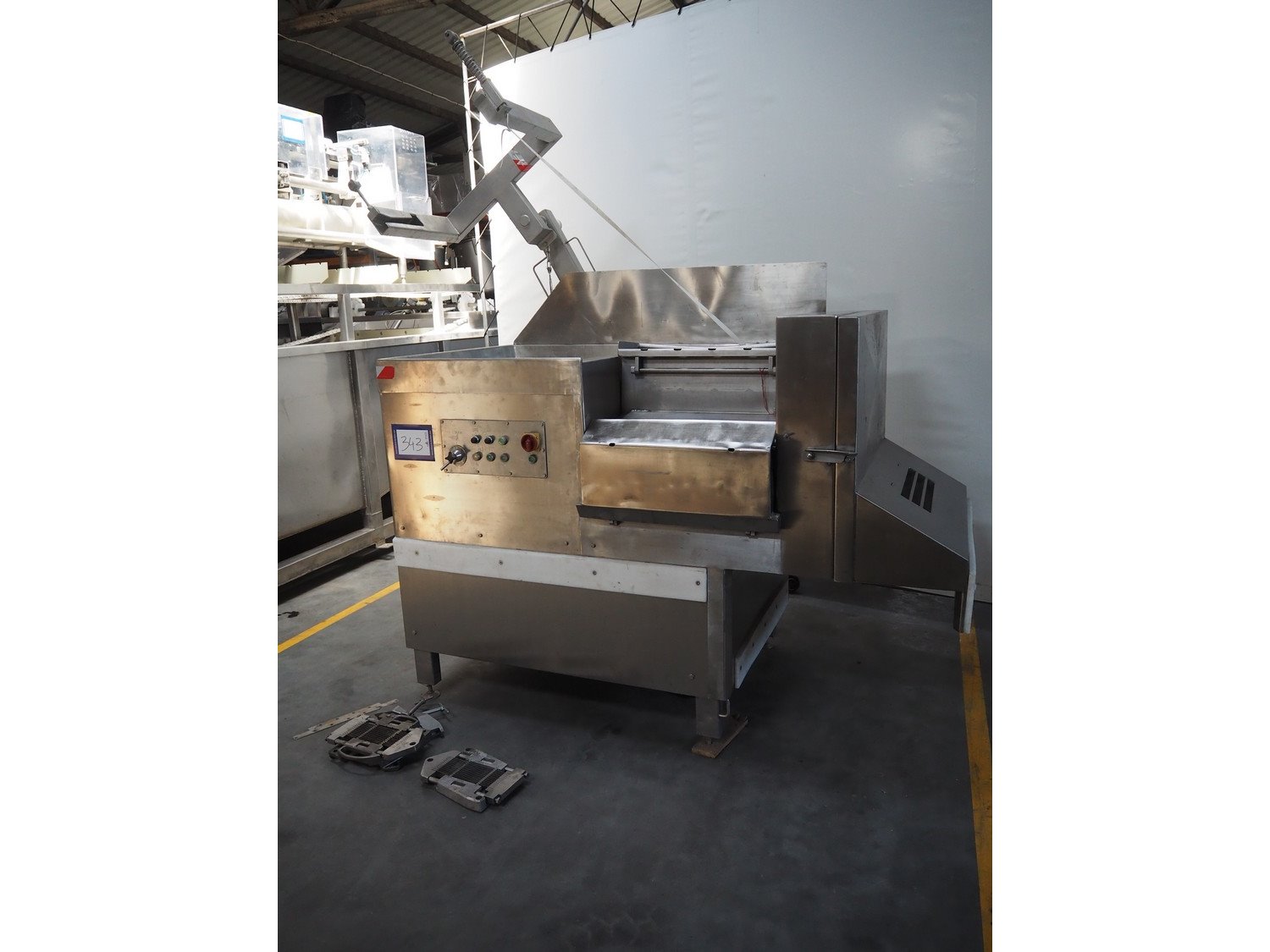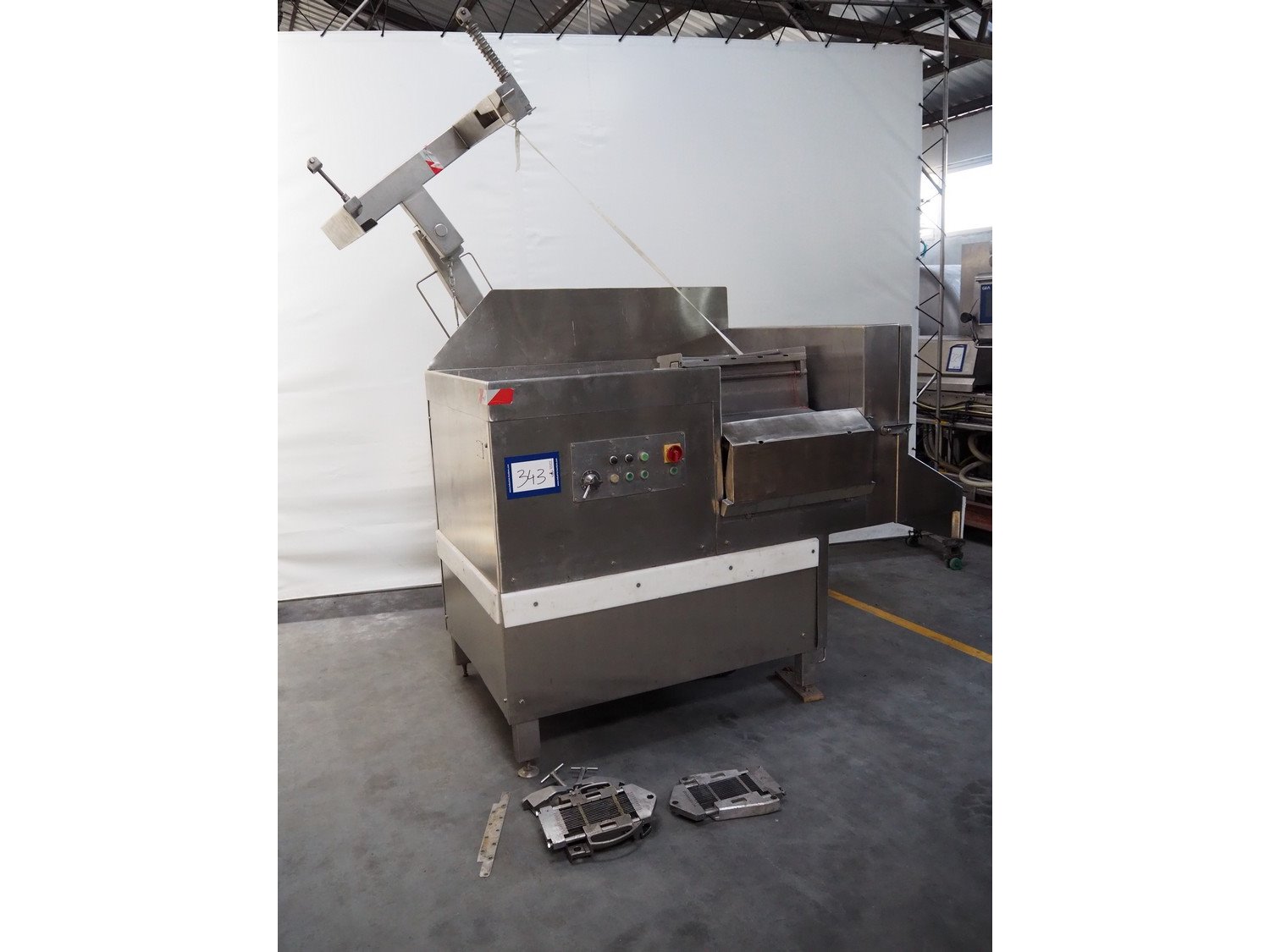 Treif Maschinenbau GmbH dicer with lifter for 200 liter meat bins, type: 1400, machine number: 140006.75041.0224, year of construction: 1994, 380 V, 3 Ph, 50 Hz, 13 A, chamber dimensions: 550 mm x 150 mm x 120 mm, distance between knives: 25 mm, total dimensions: 2600 mm x 1400 mm x 2800 mm. Including extra knife grid, distance between knives: 5 mm.