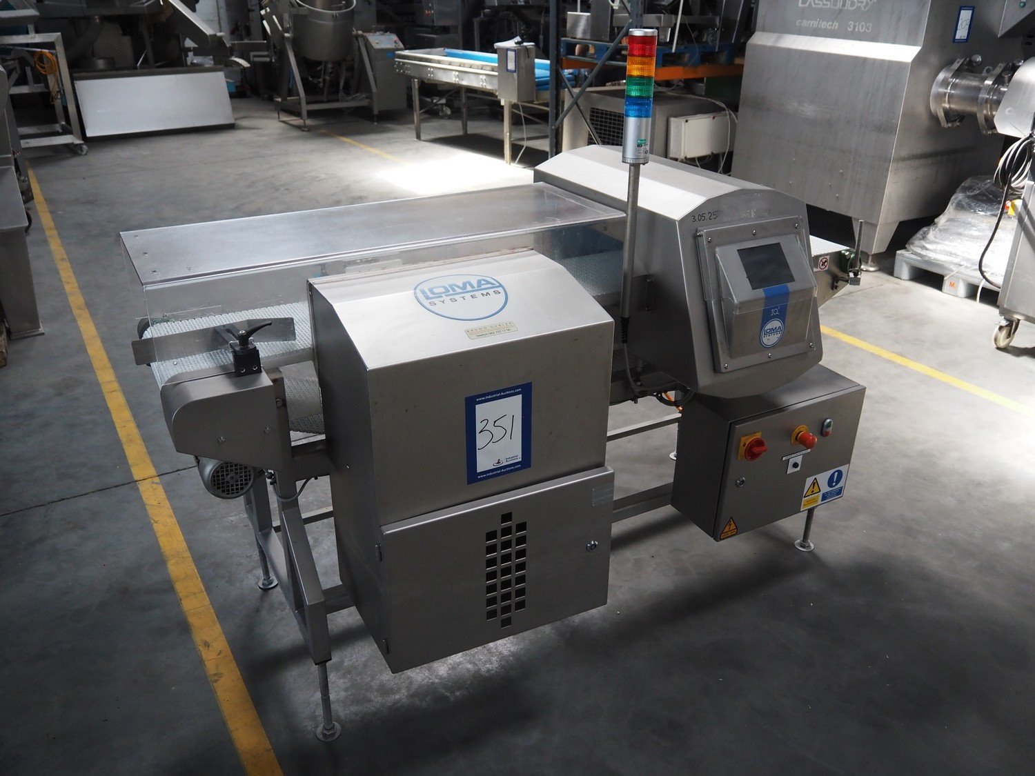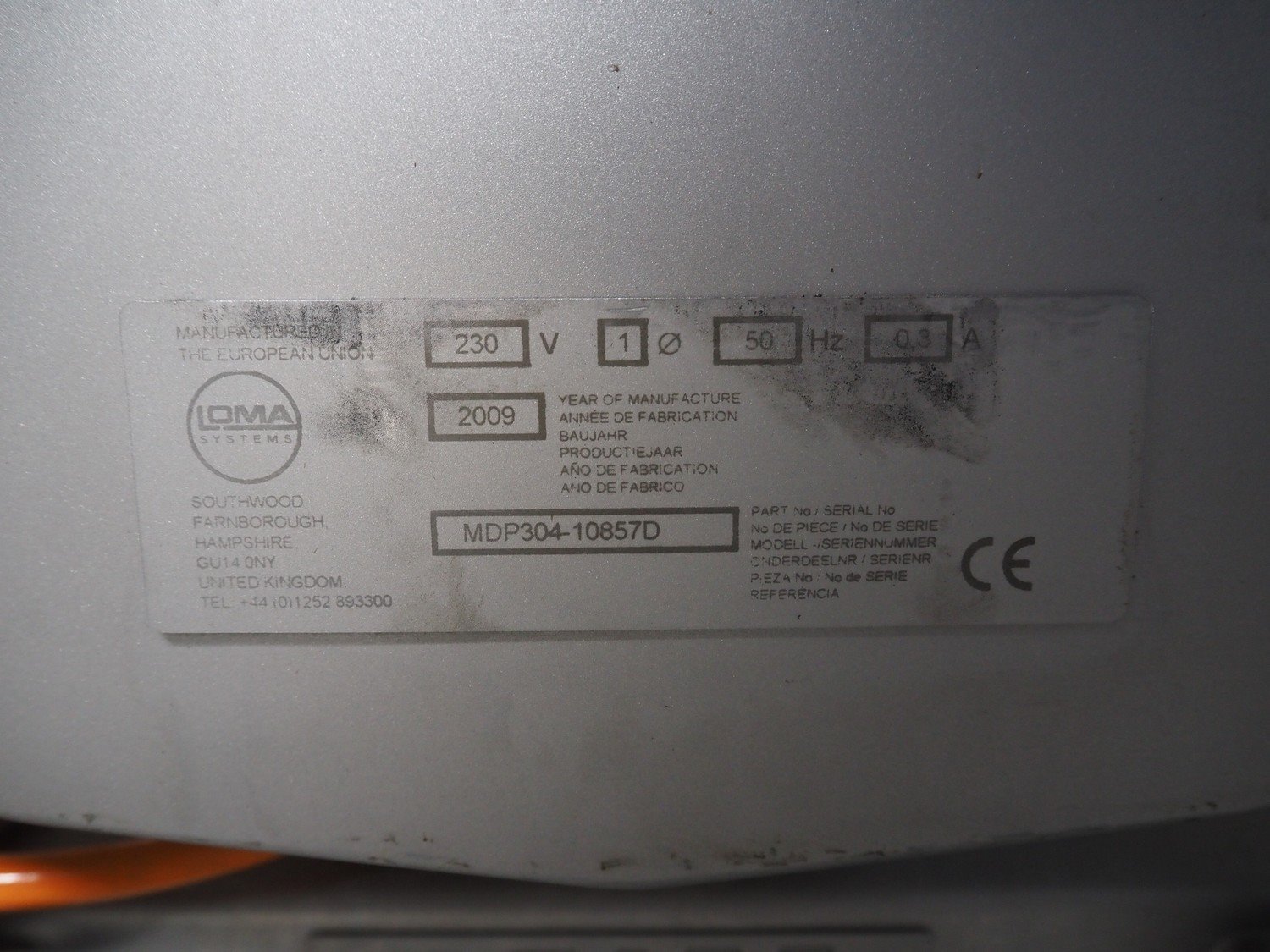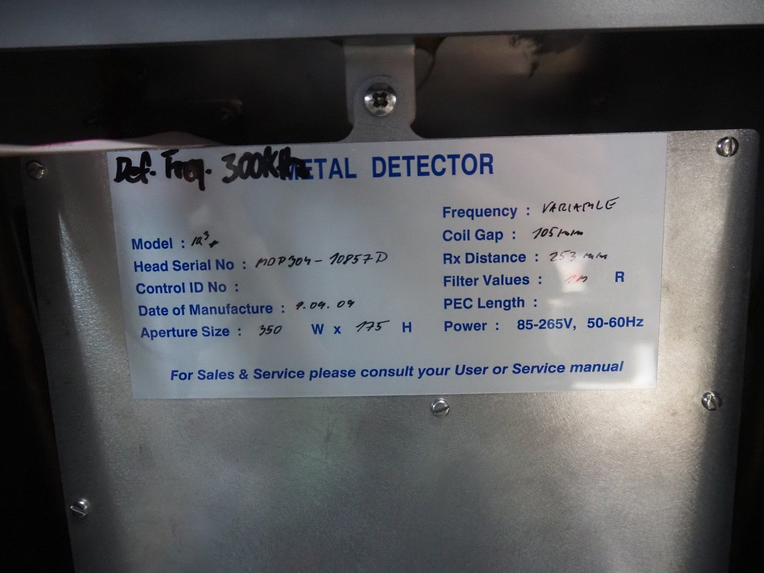 Loma Systems metal detector, model: IQ³, serial number: MDP304-10857D, year of construction: 2009, 230 V, 1 Ph, 50 Hz, 0.3 A, plastic mesh belt, belt width: 300 mm, clearance: 350 mm x 140 mm, total dimensions: 2000 mm x 1060 mm x 1550 mm.