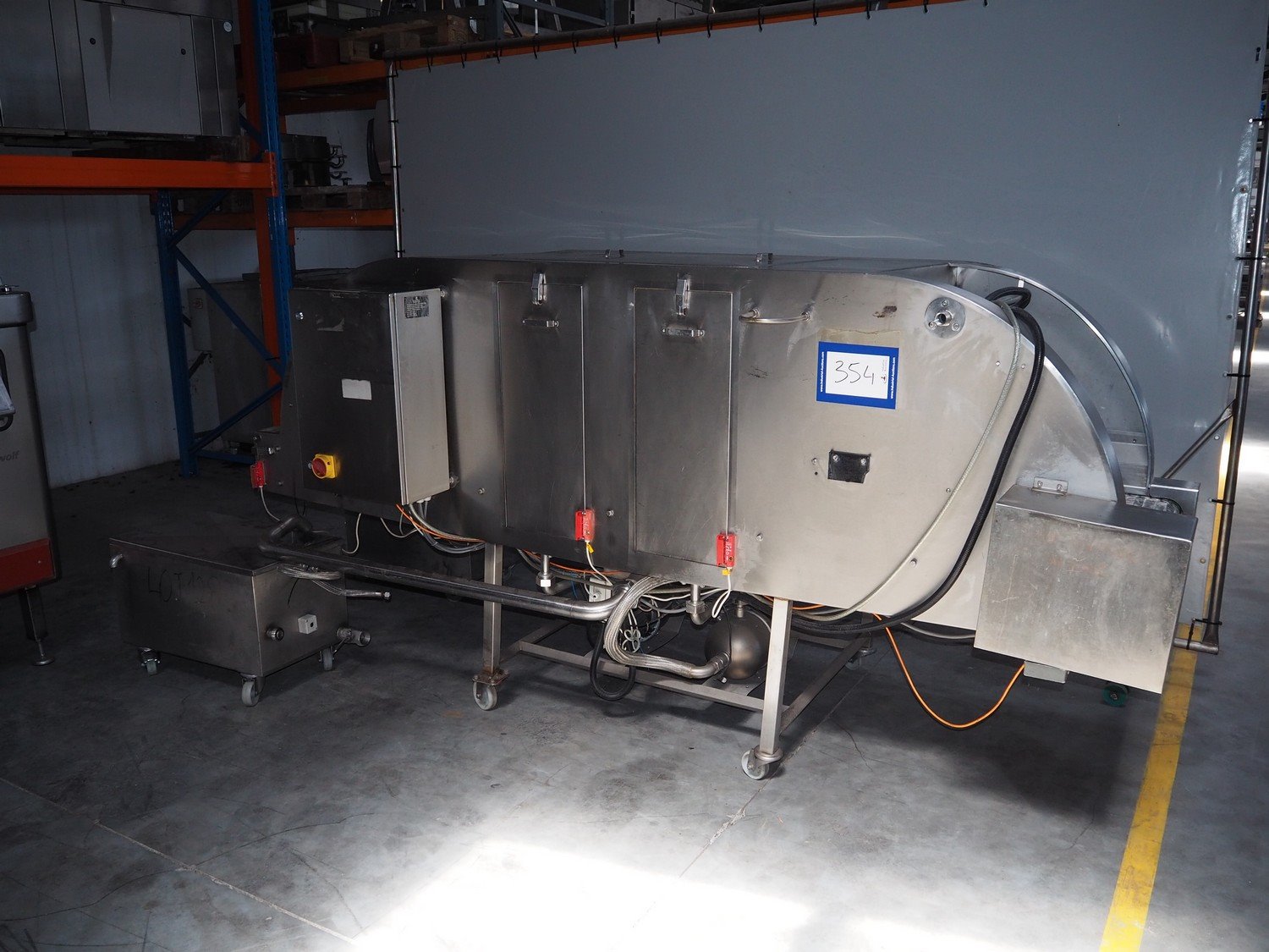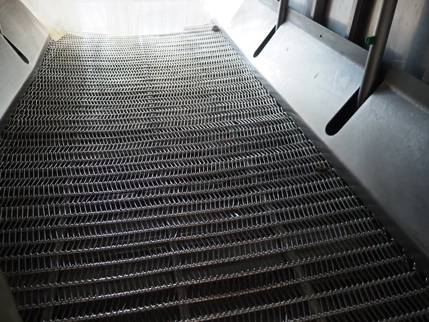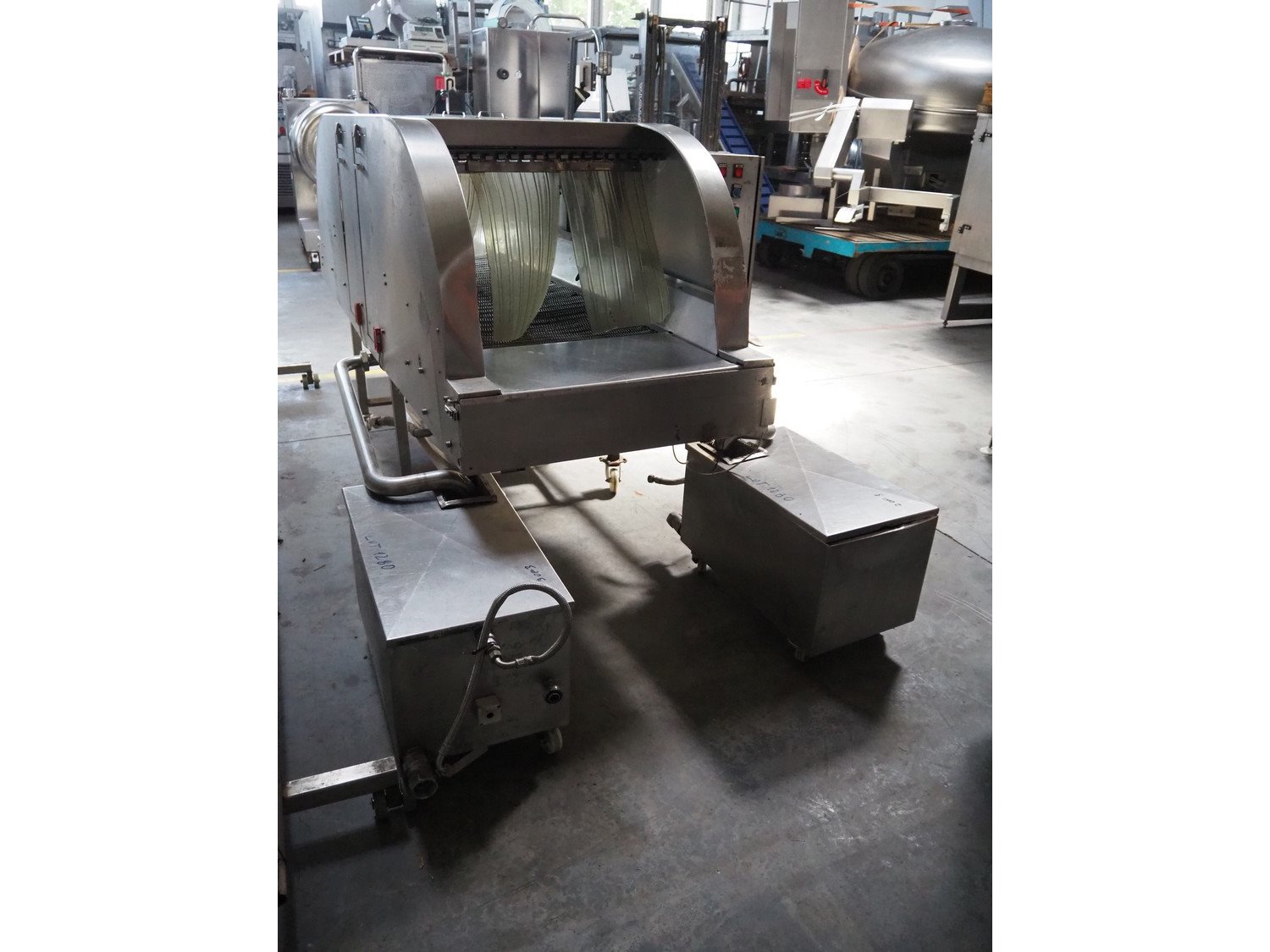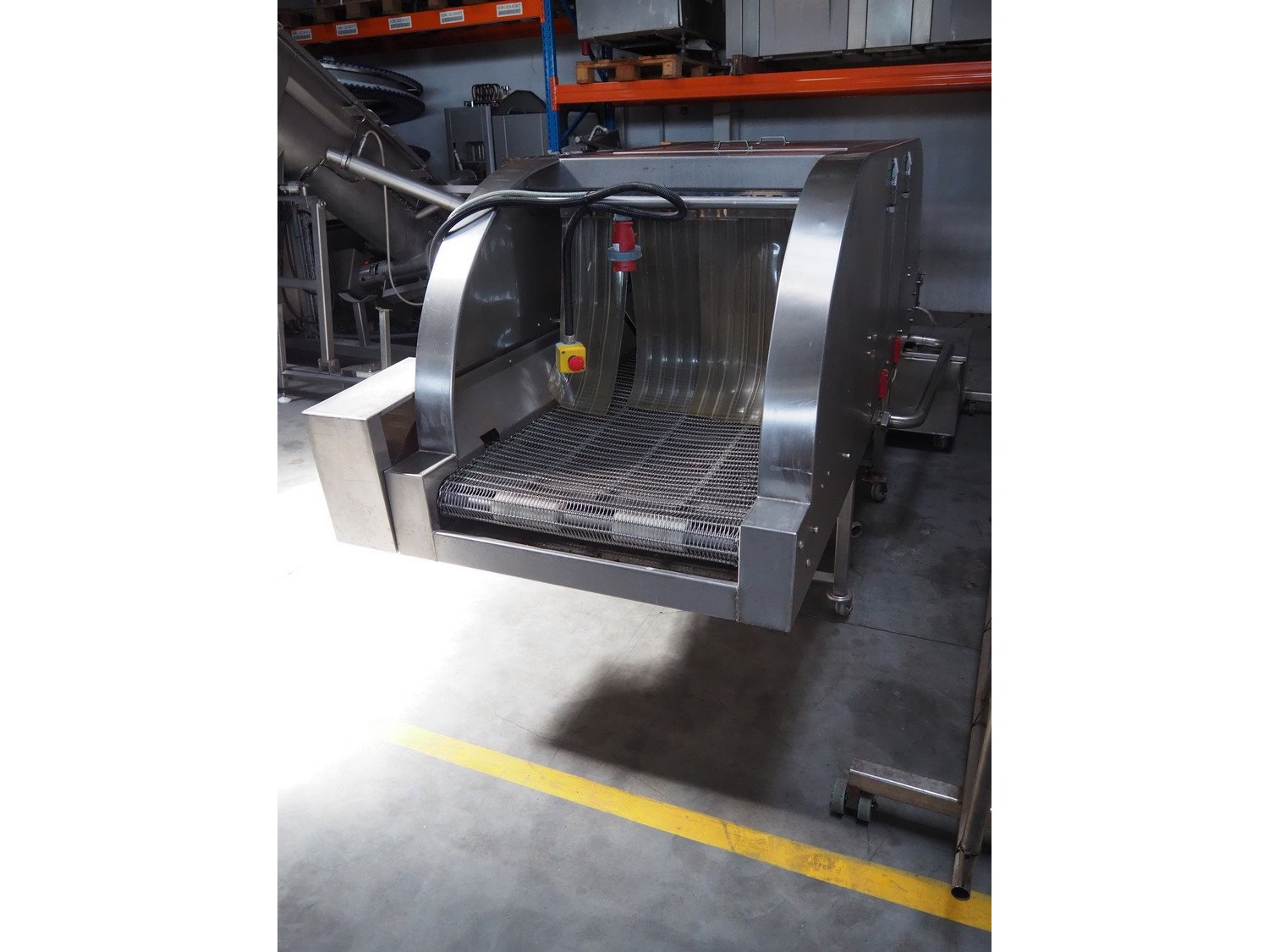 NTM washer, model: Sanit 2, serial number: 2802, year of construction: 2001, s/s mesh belt, belt width: 660 mm, clearance: 660 mm x 500 mm, total dimensions: 2850 mm x 1400 mm x 1450 mm. Including 2 mobile filter tubs, dimensions: (2x) 800 mm x 400 mm x 500 mm.