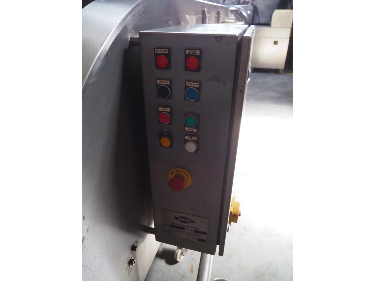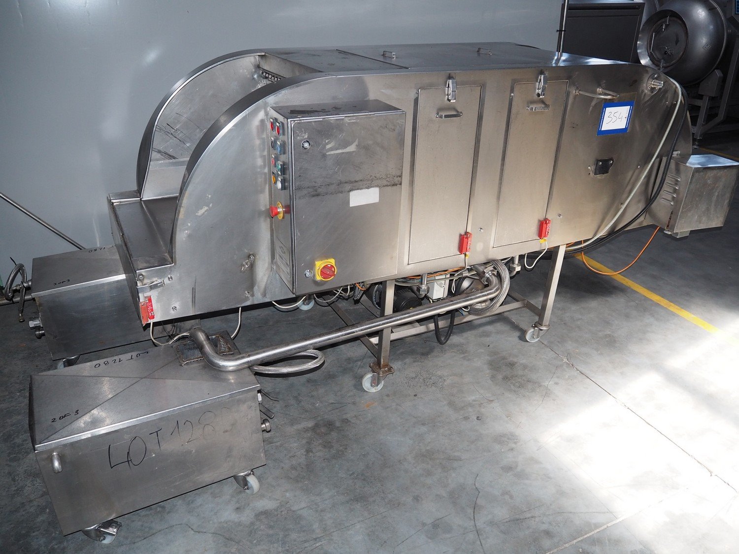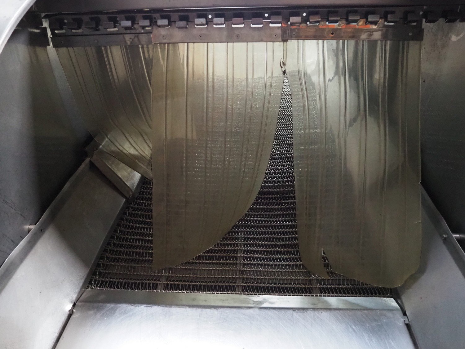 NTM washer, model: Sanit 2, serial number: 2802, year of construction: 2001, s/s mesh belt, belt width: 660 mm, clearance: 660 mm x 500 mm, total dimensions: 2850 mm x 1400 mm x 1450 mm. Including 2 mobile filter tubs, dimensions: (2x) 800 mm x 400 mm x 500 mm.